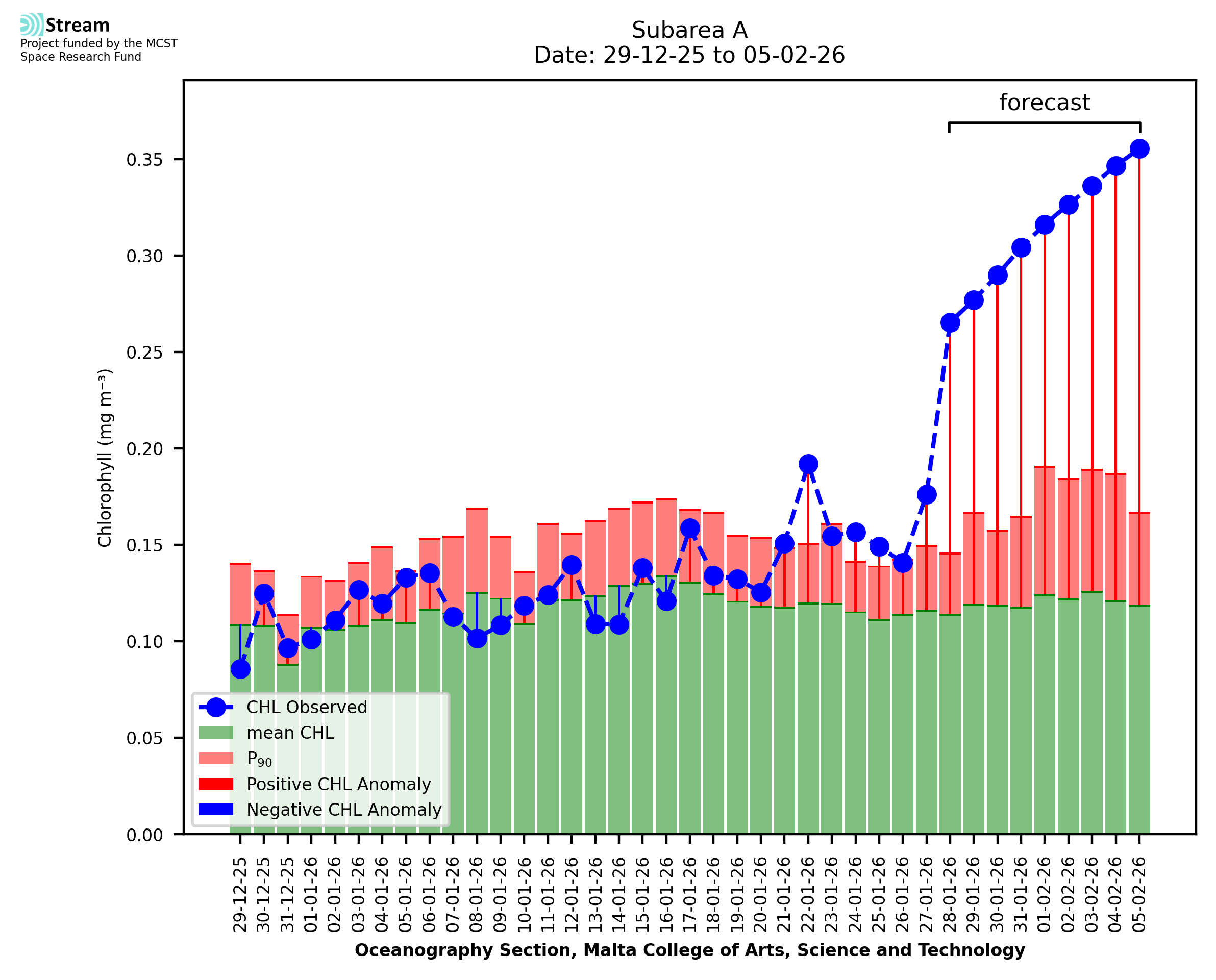 This STREAM service provides daily analysis of mass concentration of chlorophyll-a (CHL) anomalies, including spatial index maps for high chlorophyll occurrence and intensity in the Malta shelf area. User specific requests for data access and visualisation are planned for delivery on the STREAM mobile app. CHL is a core parameter in the Marine Strategy Framework Directive which provides the common framework for the assessment of the state of health of coastal seas to ensure coherence with the set goals of productive, healthy and clean European seas. CHL is considered to be a proxy of phythoplankton biomass and hence for eutrophication. Measuring chlorophyll is an indication of how much primary production is occurring in the sea.