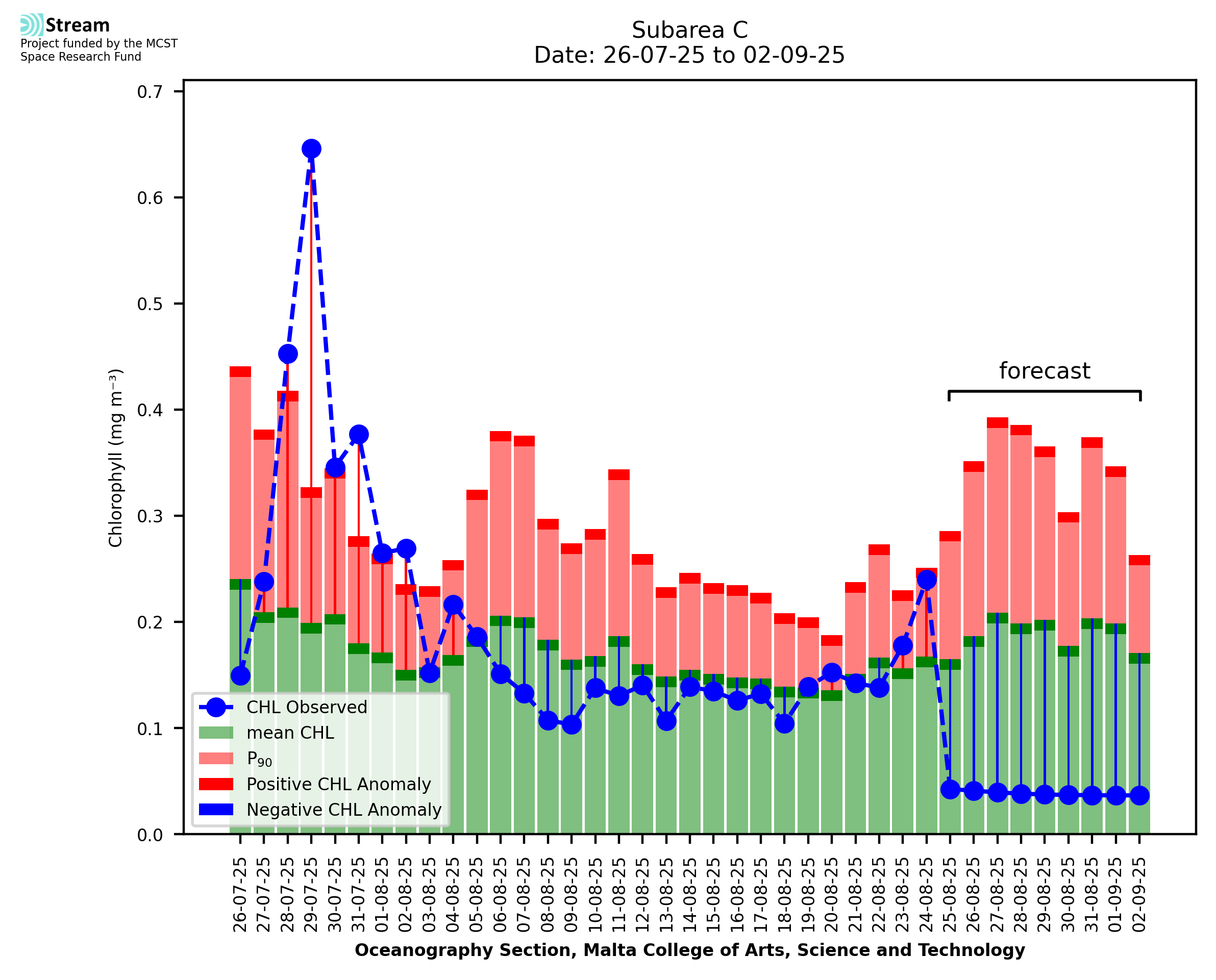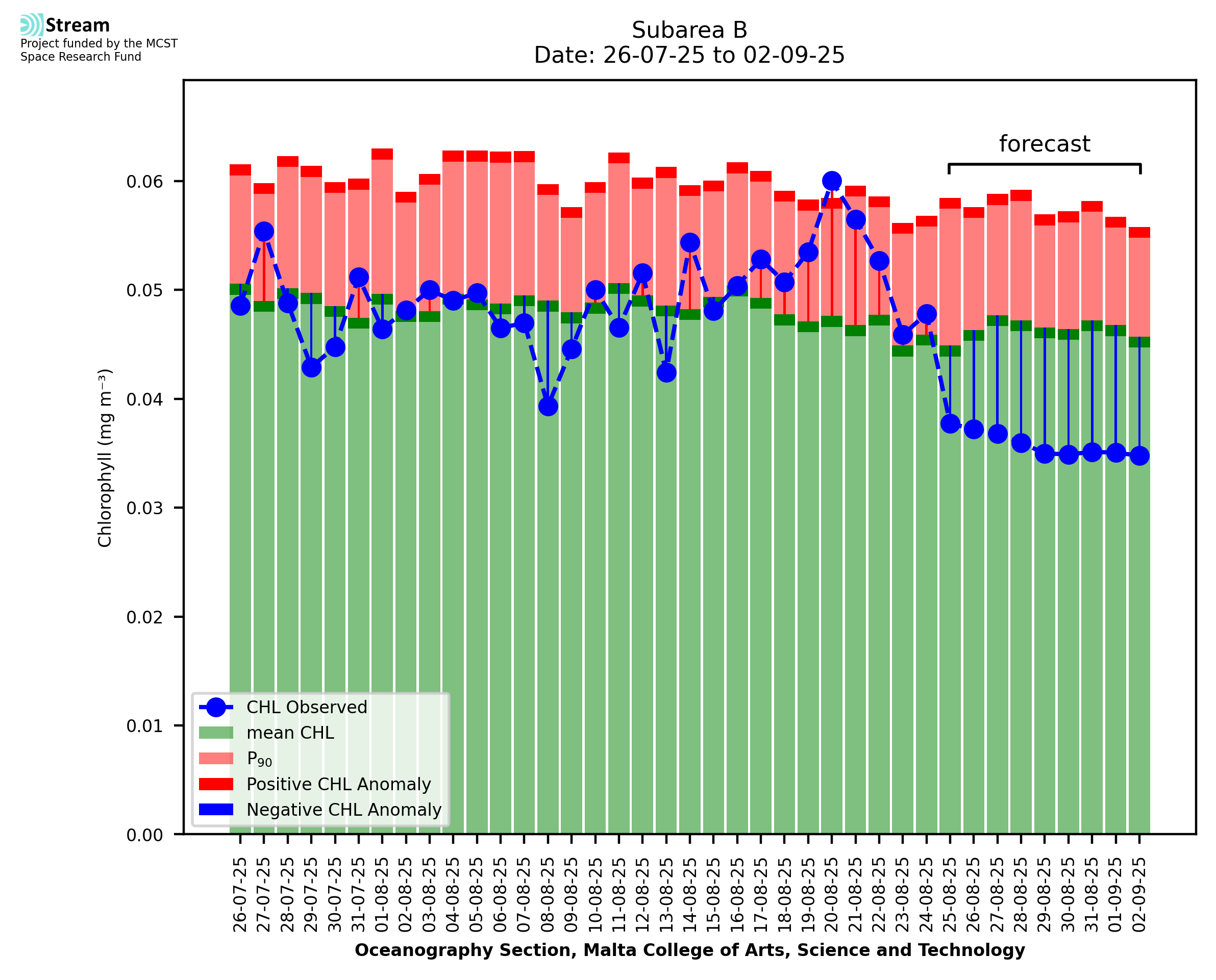 This STREAM service provides daily analysis of mass concentration of chlorophyll-a (CHL) anomalies, including spatial index maps for high chlorophyll occurrence and intensity in the Malta shelf area. User specific requests for data access and visualisation are planned for delivery on the STREAM mobile app. CHL is a core parameter in the Marine Strategy Framework Directive which provides the common framework for the assessment of the state of health of coastal seas to ensure coherence with the set goals of productive, healthy and clean European seas. CHL is considered to be a proxy of phythoplankton biomass and hence for eutrophication. Measuring chlorophyll is an indication of how much primary production is occurring in the sea.