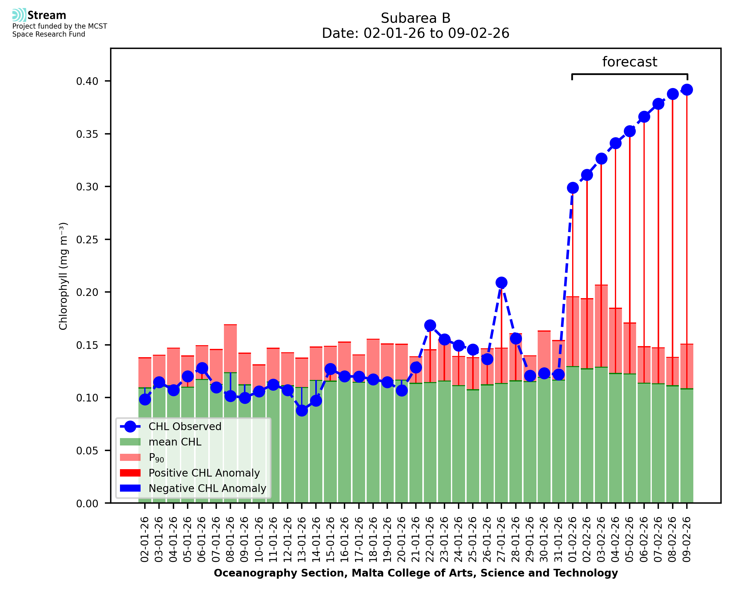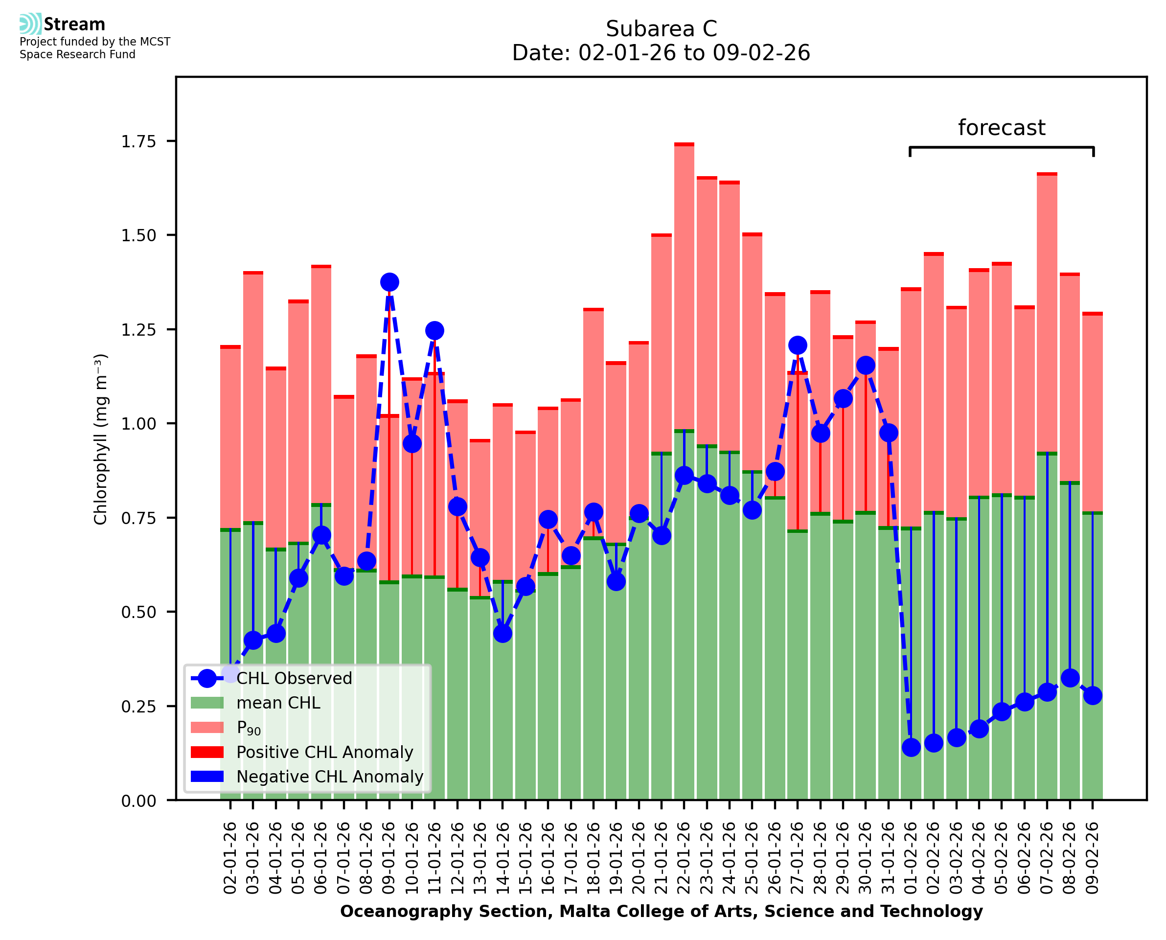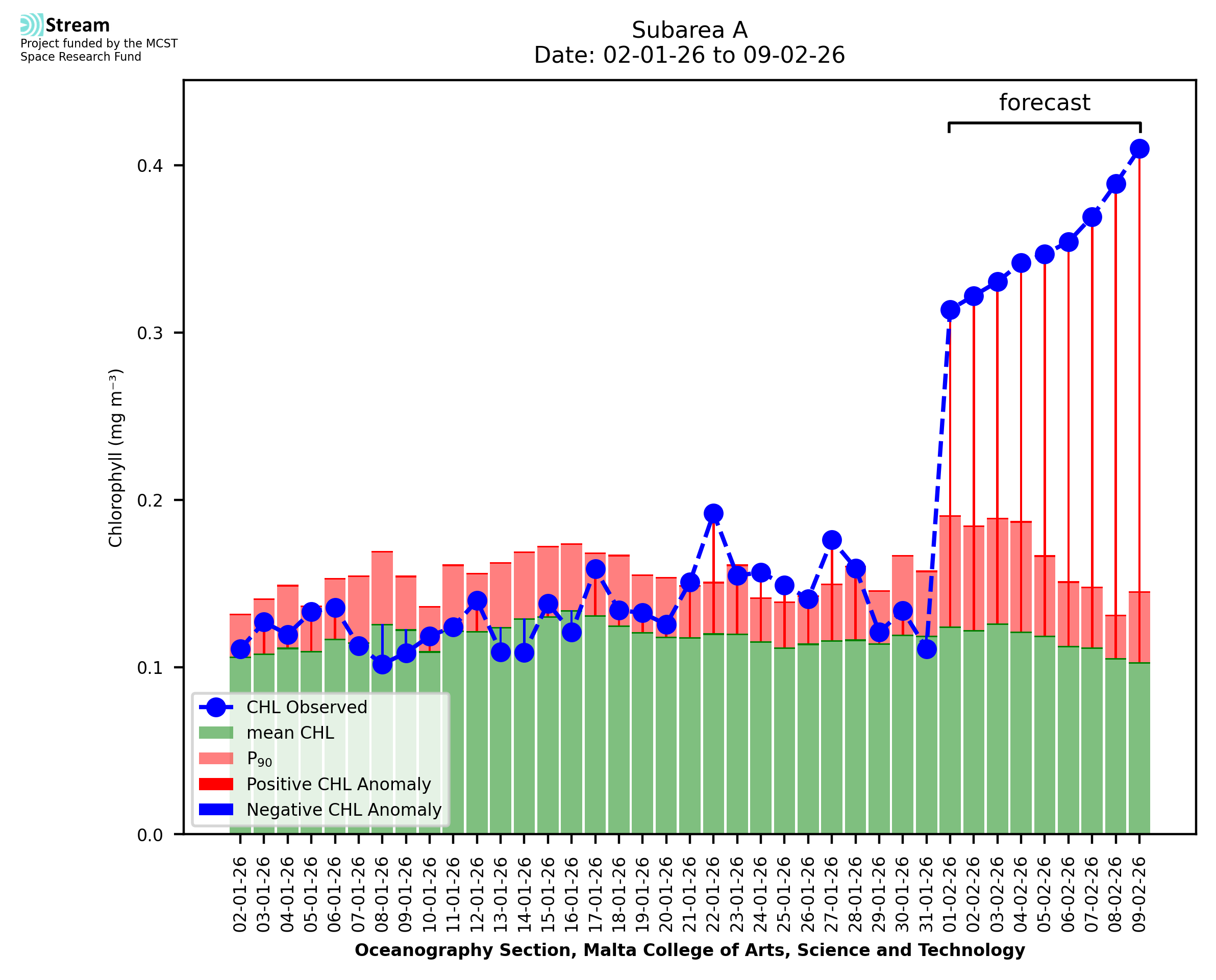 This STREAM service provides daily analysis of mass concentration of chlorophyll-a (CHL) anomalies, including spatial index maps for high chlorophyll occurrence and intensity in the Malta shelf area. User specific requests for data access and visualisation are planned for delivery on the STREAM mobile app. CHL is a core parameter in the Marine Strategy Framework Directive which provides the common framework for the assessment of the state of health of coastal seas to ensure coherence with the set goals of productive, healthy and clean European seas. CHL is considered to be a proxy of phythoplankton biomass and hence for eutrophication. Measuring chlorophyll is an indication of how much primary production is occurring in the sea.