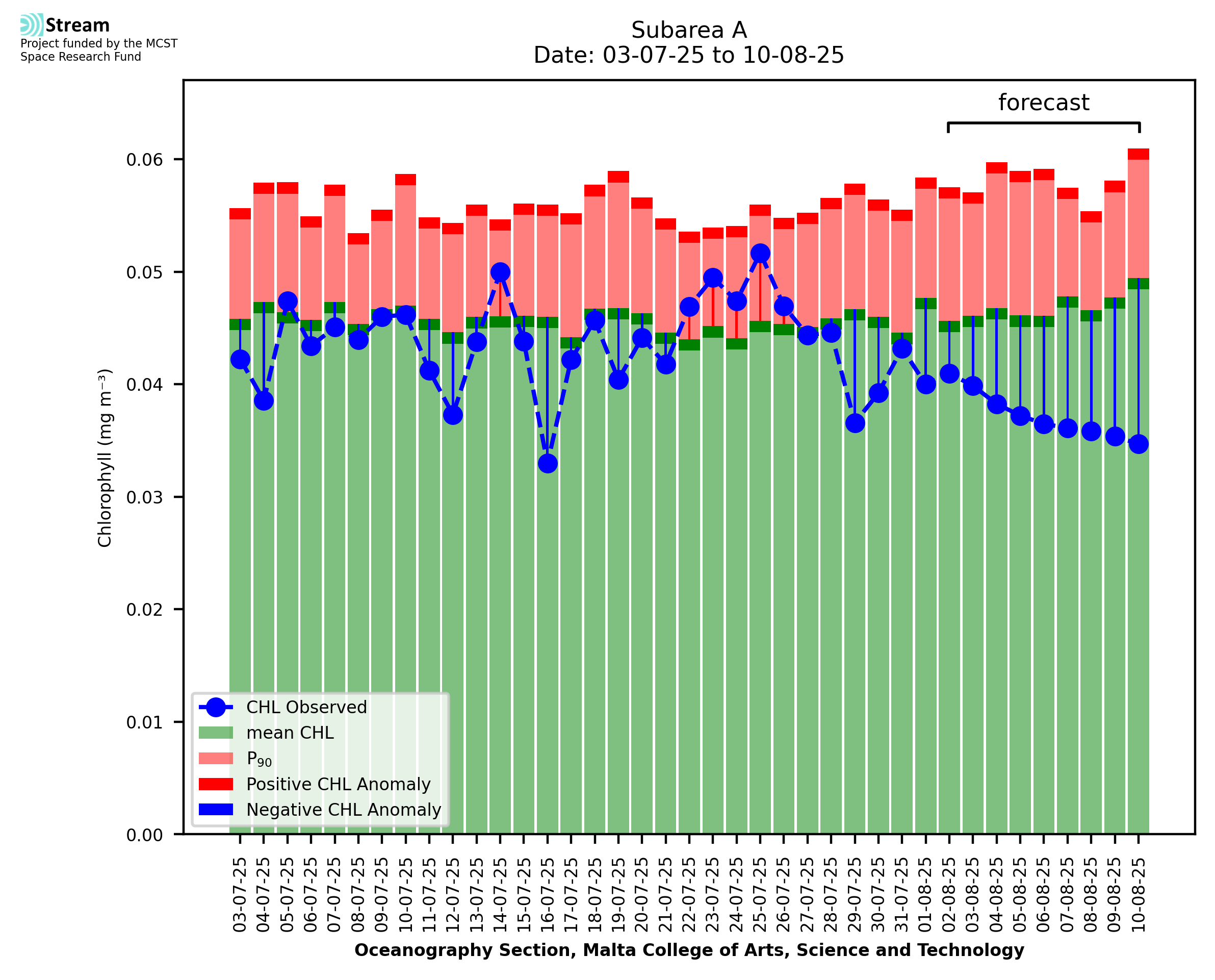 This STREAM service provides daily analysis of mass concentration of chlorophyll-a (CHL) anomalies, including spatial index maps for high chlorophyll occurrence and intensity in the sea around the Maltese Islands. User specific requests for data access and visualisation are planned for delivery on the STREAM mobile app. CHL is a core parameter in the Marine Strategy Framework Directive which provides the common framework for the assessment of the state of health of coastal seas to ensure coherence with the set goals of productive, healthy and clean European seas. CHL is considered to be a proxy of phythoplankton biomass and hence for eutrophication. Measuring chlorophyll is an indication of how much primary production is occurring in the sea.