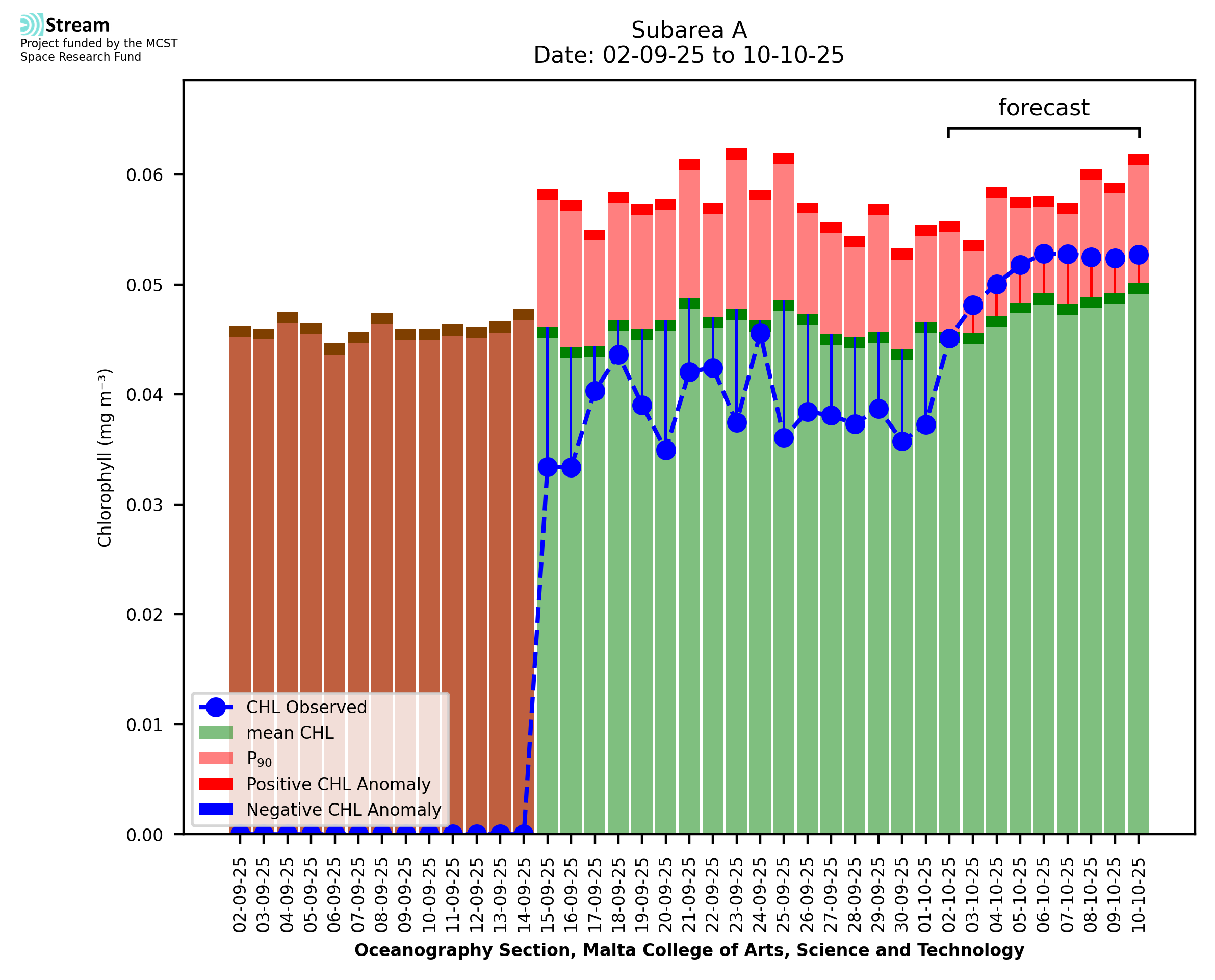 This STREAM service provides daily analysis of mass concentration of chlorophyll-a (CHL) anomalies, including spatial index maps for high chlorophyll occurrence and intensity in the sea around the Maltese Islands. User specific requests for data access and visualisation are planned for delivery on the STREAM mobile app. CHL is a core parameter in the Marine Strategy Framework Directive which provides the common framework for the assessment of the state of health of coastal seas to ensure coherence with the set goals of productive, healthy and clean European seas. CHL is considered to be a proxy of phythoplankton biomass and hence for eutrophication. Measuring chlorophyll is an indication of how much primary production is occurring in the sea.