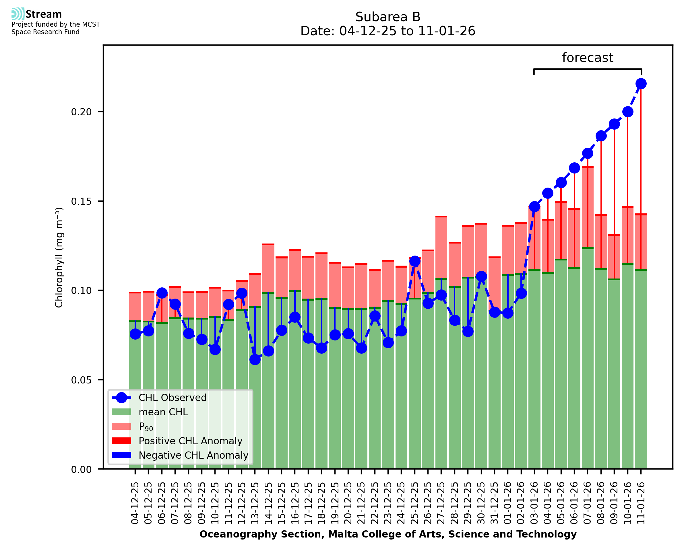 Spatial map of high chlorophyll occurrence and intensity. The CHL index is signalled when the CHL anomaly (CHLA) exceeds the CHL 90th percentile (CHL90) for at least 5 consecutive days. The CHL index gives a measure of the chlorophyll intensity, measured by the size of the CHLA compared to the difference between CHL90 and the climatological mean CHL.