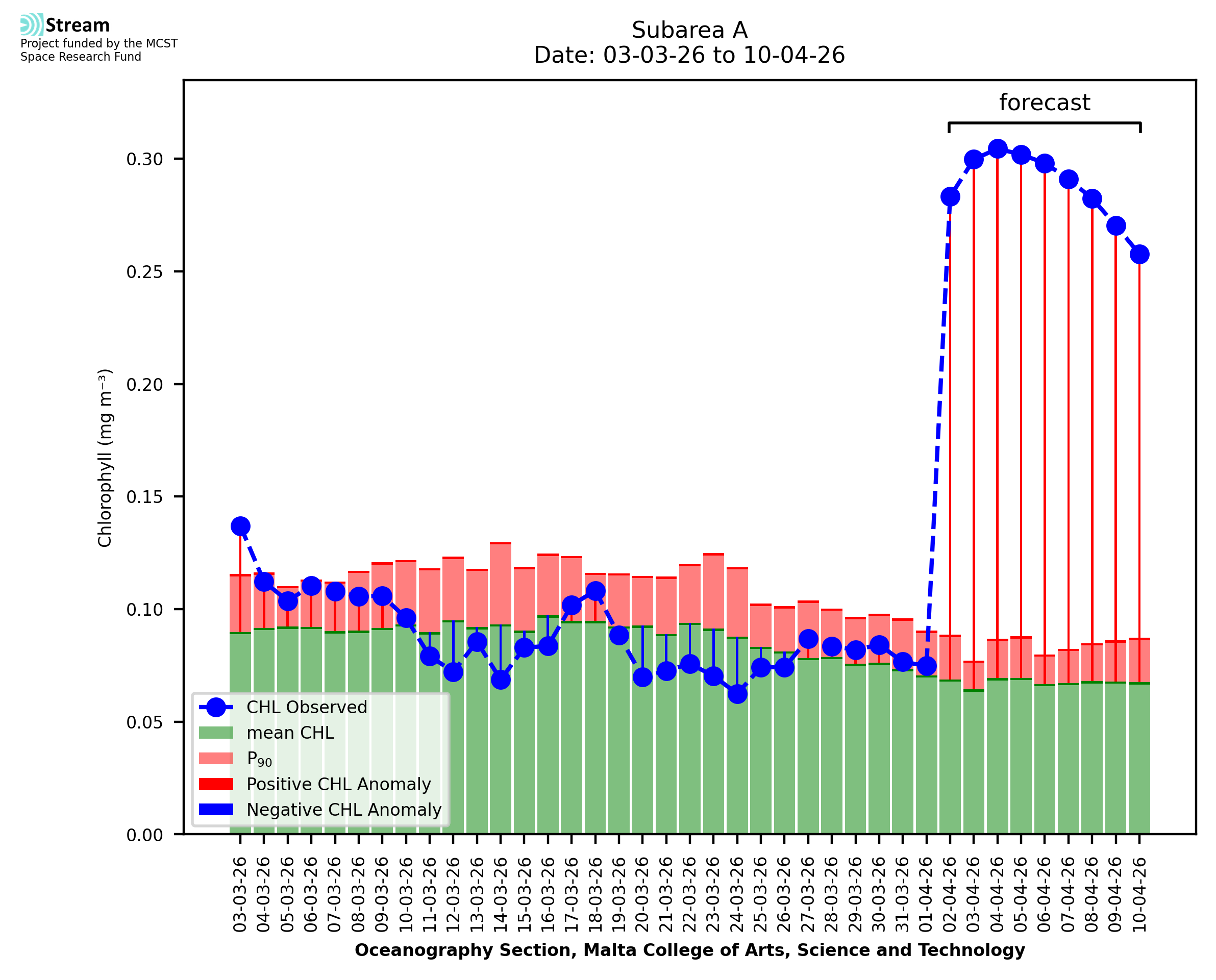 This STREAM service provides daily analysis of mass concentration of chlorophyll-a (CHL) anomalies, including spatial index maps for high chlorophyll occurrence and intensity in the sea around the Maltese Islands. User specific requests for data access and visualisation are planned for delivery on the STREAM mobile app. CHL is a core parameter in the Marine Strategy Framework Directive which provides the common framework for the assessment of the state of health of coastal seas to ensure coherence with the set goals of productive, healthy and clean European seas. CHL is considered to be a proxy of phythoplankton biomass and hence for eutrophication. Measuring chlorophyll is an indication of how much primary production is occurring in the sea.