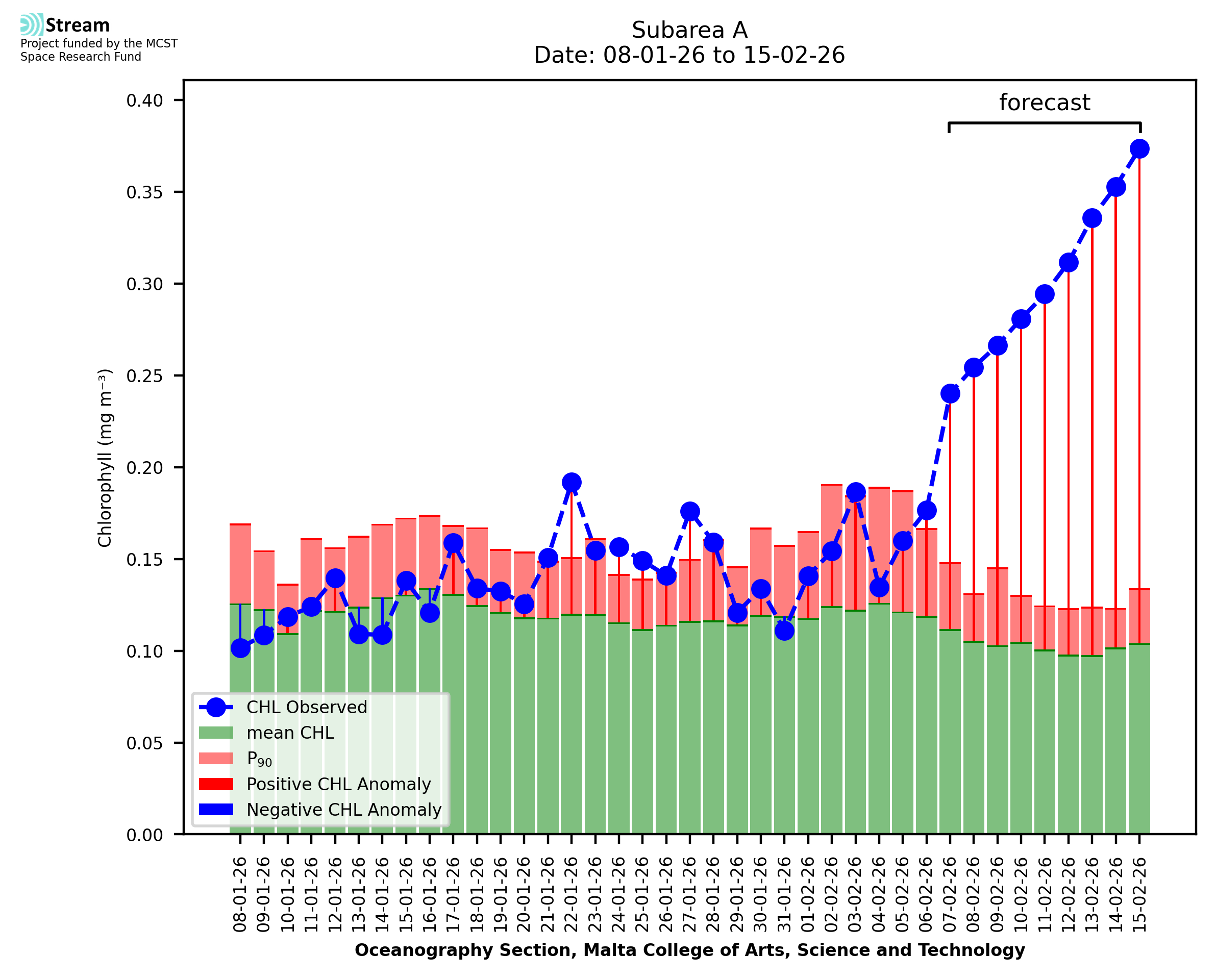 This STREAM service provides daily analysis of mass concentration of chlorophyll-a (CHL) anomalies, including spatial index maps for high chlorophyll occurrence and intensity in the sea around the Maltese Islands. User specific requests for data access and visualisation are planned for delivery on the STREAM mobile app. CHL is a core parameter in the Marine Strategy Framework Directive which provides the common framework for the assessment of the state of health of coastal seas to ensure coherence with the set goals of productive, healthy and clean European seas. CHL is considered to be a proxy of phythoplankton biomass and hence for eutrophication. Measuring chlorophyll is an indication of how much primary production is occurring in the sea.