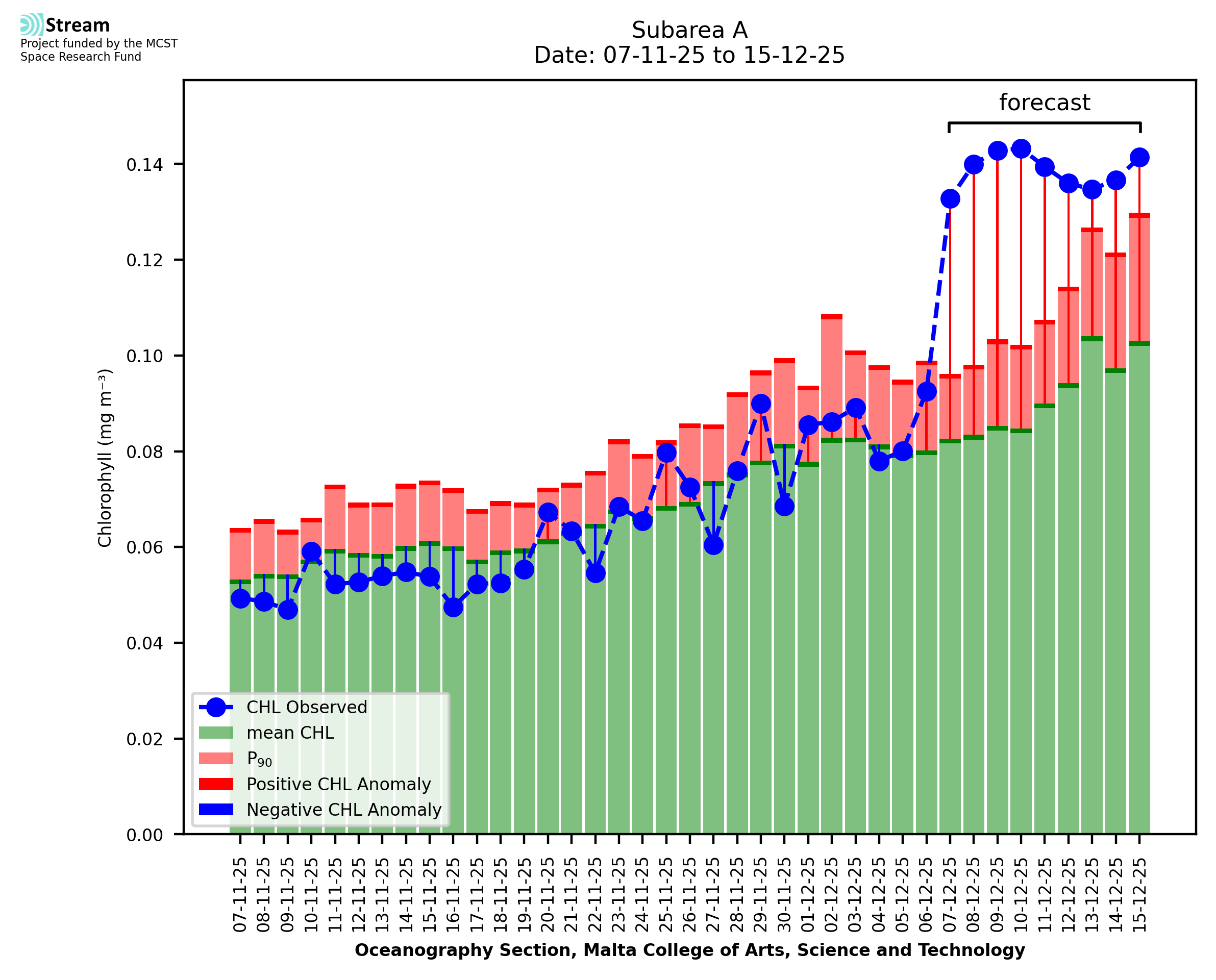 This STREAM service provides daily analysis of mass concentration of chlorophyll-a (CHL) anomalies, including spatial index maps for high chlorophyll occurrence and intensity in the sea around the Maltese Islands. User specific requests for data access and visualisation are planned for delivery on the STREAM mobile app. CHL is a core parameter in the Marine Strategy Framework Directive which provides the common framework for the assessment of the state of health of coastal seas to ensure coherence with the set goals of productive, healthy and clean European seas. CHL is considered to be a proxy of phythoplankton biomass and hence for eutrophication. Measuring chlorophyll is an indication of how much primary production is occurring in the sea.