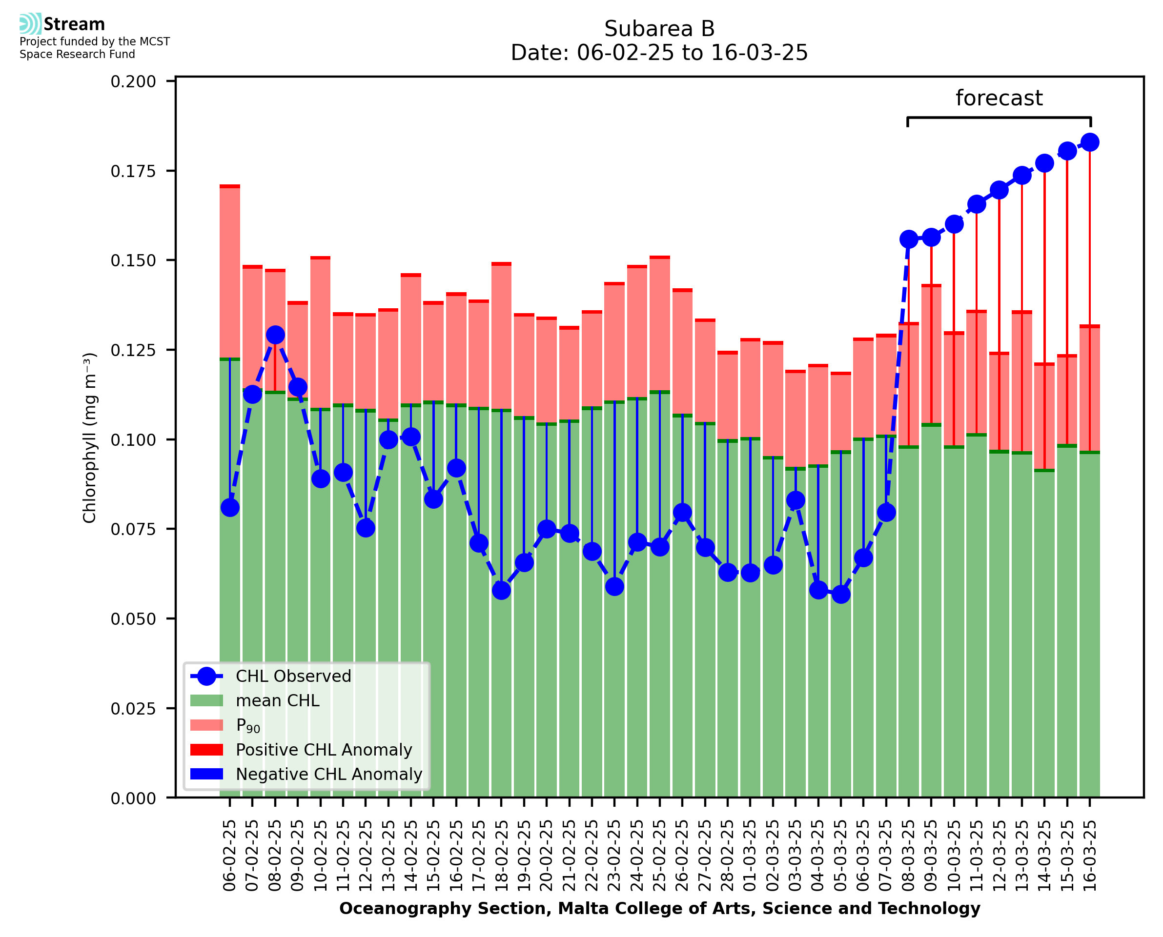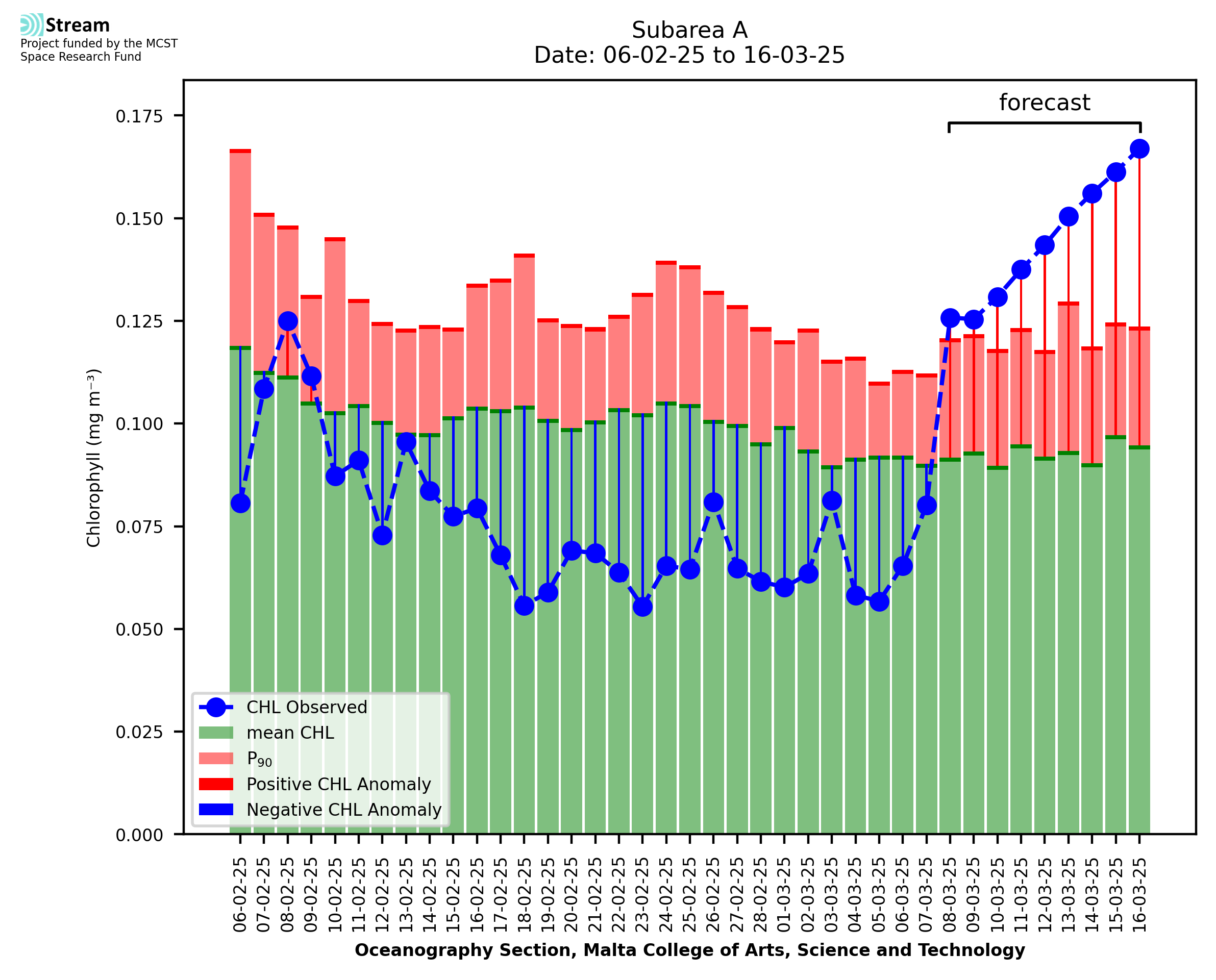 This STREAM service provides daily analysis of mass concentration of chlorophyll-a (CHL) anomalies, including spatial index maps for high chlorophyll occurrence and intensity in the sea around the Maltese Islands. User specific requests for data access and visualisation are planned for delivery on the STREAM mobile app. CHL is a core parameter in the Marine Strategy Framework Directive which provides the common framework for the assessment of the state of health of coastal seas to ensure coherence with the set goals of productive, healthy and clean European seas. CHL is considered to be a proxy of phythoplankton biomass and hence for eutrophication. Measuring chlorophyll is an indication of how much primary production is occurring in the sea.