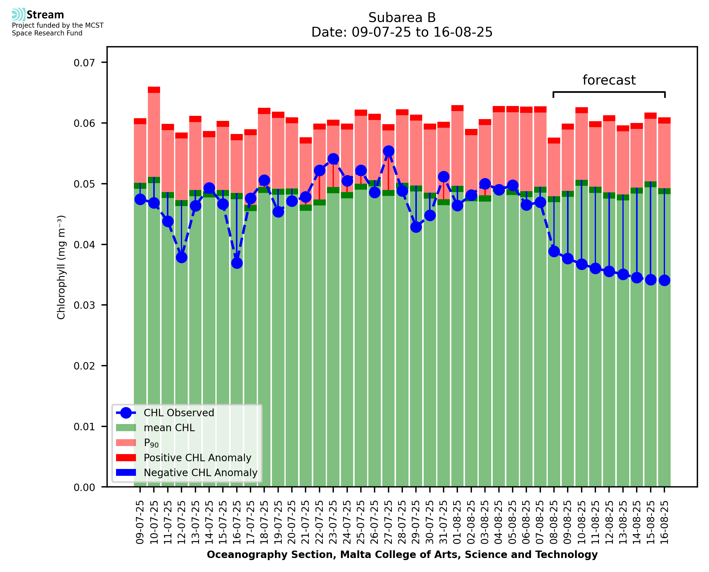 This STREAM service provides daily analysis of mass concentration of chlorophyll-a (CHL) anomalies, including spatial index maps for high chlorophyll occurrence and intensity in the sea around the Maltese Islands. User specific requests for data access and visualisation are planned for delivery on the STREAM mobile app. CHL is a core parameter in the Marine Strategy Framework Directive which provides the common framework for the assessment of the state of health of coastal seas to ensure coherence with the set goals of productive, healthy and clean European seas. CHL is considered to be a proxy of phythoplankton biomass and hence for eutrophication. Measuring chlorophyll is an indication of how much primary production is occurring in the sea.