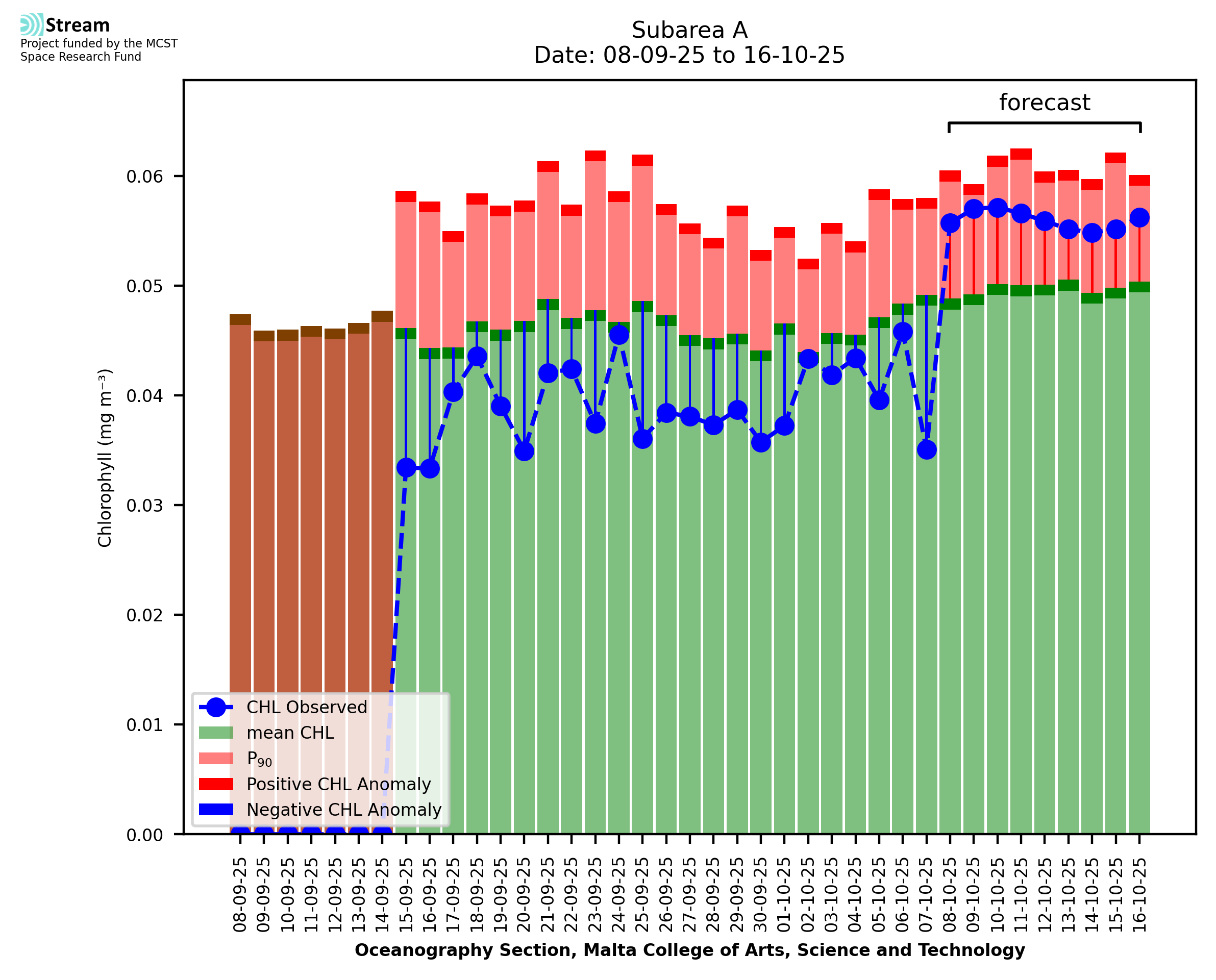 This STREAM service provides daily analysis of mass concentration of chlorophyll-a (CHL) anomalies, including spatial index maps for high chlorophyll occurrence and intensity in the sea around the Maltese Islands. User specific requests for data access and visualisation are planned for delivery on the STREAM mobile app. CHL is a core parameter in the Marine Strategy Framework Directive which provides the common framework for the assessment of the state of health of coastal seas to ensure coherence with the set goals of productive, healthy and clean European seas. CHL is considered to be a proxy of phythoplankton biomass and hence for eutrophication. Measuring chlorophyll is an indication of how much primary production is occurring in the sea.