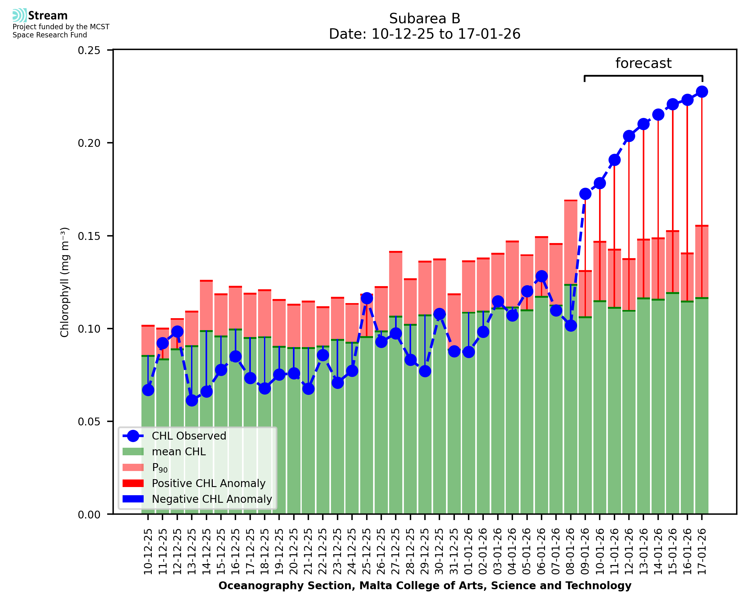 This STREAM service provides daily analysis of mass concentration of chlorophyll-a (CHL) anomalies, including spatial index maps for high chlorophyll occurrence and intensity in the sea around the Maltese Islands. User specific requests for data access and visualisation are planned for delivery on the STREAM mobile app. CHL is a core parameter in the Marine Strategy Framework Directive which provides the common framework for the assessment of the state of health of coastal seas to ensure coherence with the set goals of productive, healthy and clean European seas. CHL is considered to be a proxy of phythoplankton biomass and hence for eutrophication. Measuring chlorophyll is an indication of how much primary production is occurring in the sea.