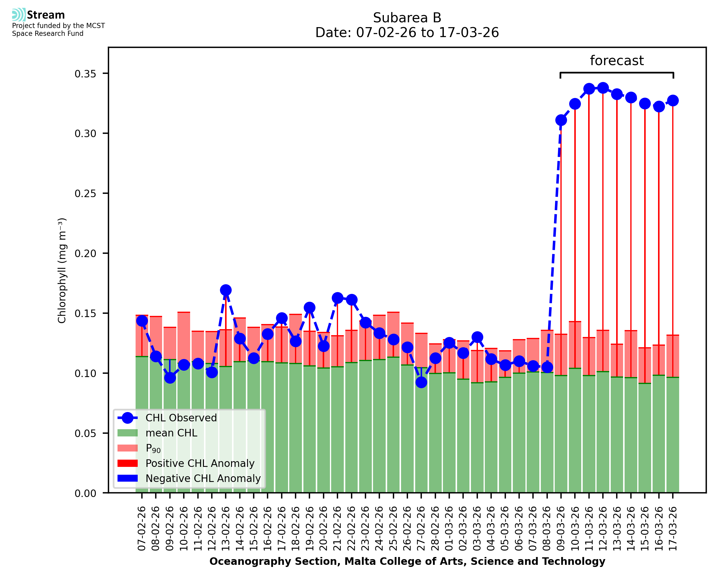 Spatial map of high chlorophyll occurrence and intensity. The CHL index is signalled when the CHL anomaly (CHLA) exceeds the CHL 90th percentile (CHL90) for at least 5 consecutive days. The CHL index gives a measure of the chlorophyll intensity, measured by the size of the CHLA compared to the difference between CHL90 and the climatological mean CHL.