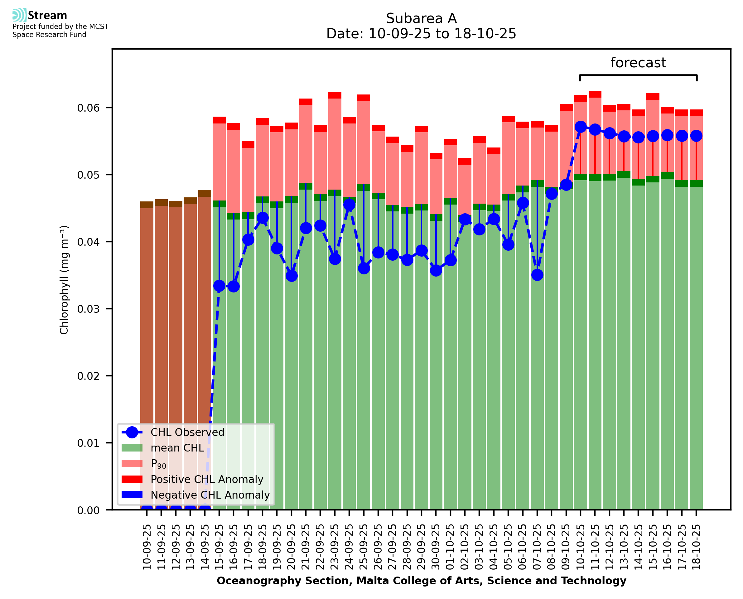 This STREAM service provides daily analysis of mass concentration of chlorophyll-a (CHL) anomalies, including spatial index maps for high chlorophyll occurrence and intensity in the sea around the Maltese Islands. User specific requests for data access and visualisation are planned for delivery on the STREAM mobile app. CHL is a core parameter in the Marine Strategy Framework Directive which provides the common framework for the assessment of the state of health of coastal seas to ensure coherence with the set goals of productive, healthy and clean European seas. CHL is considered to be a proxy of phythoplankton biomass and hence for eutrophication. Measuring chlorophyll is an indication of how much primary production is occurring in the sea.