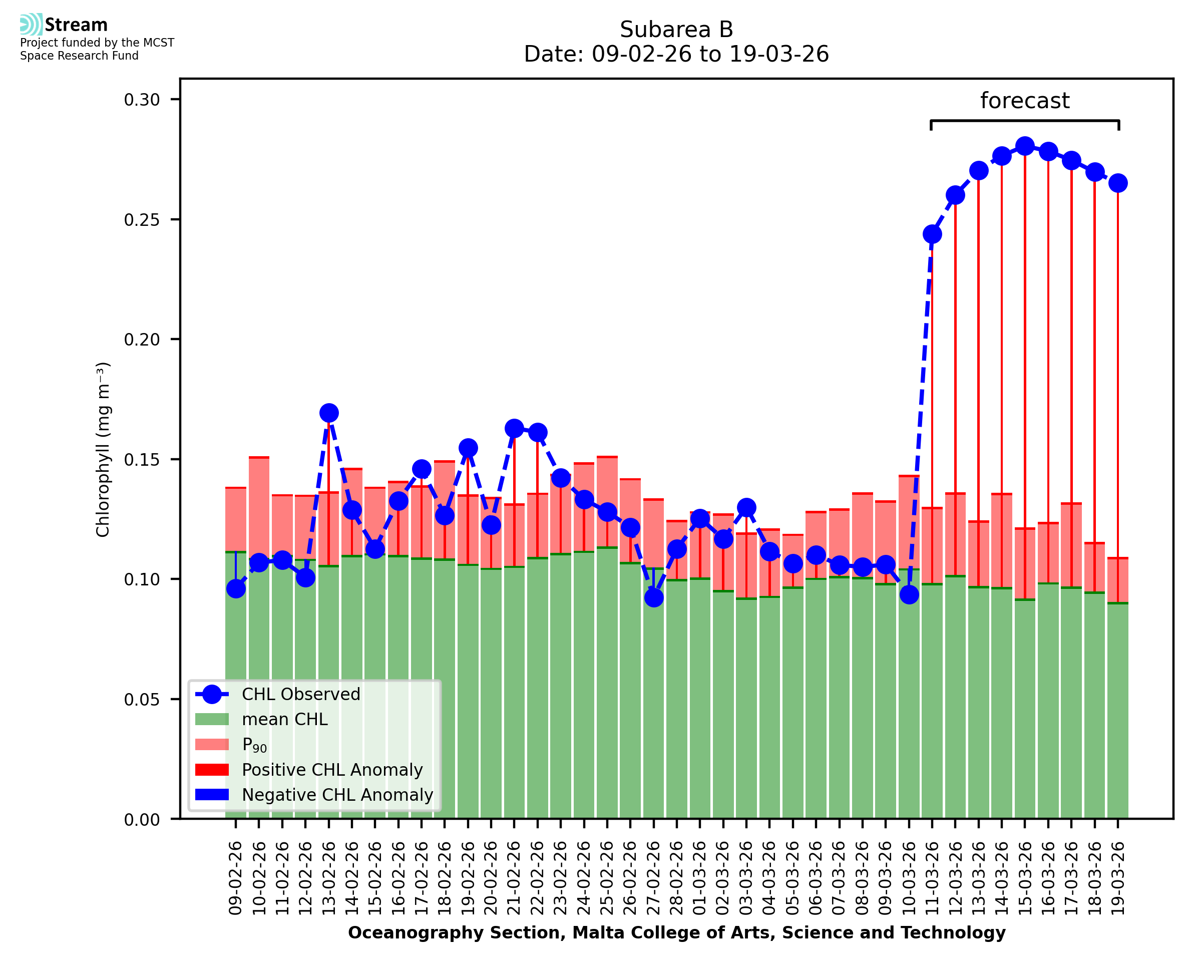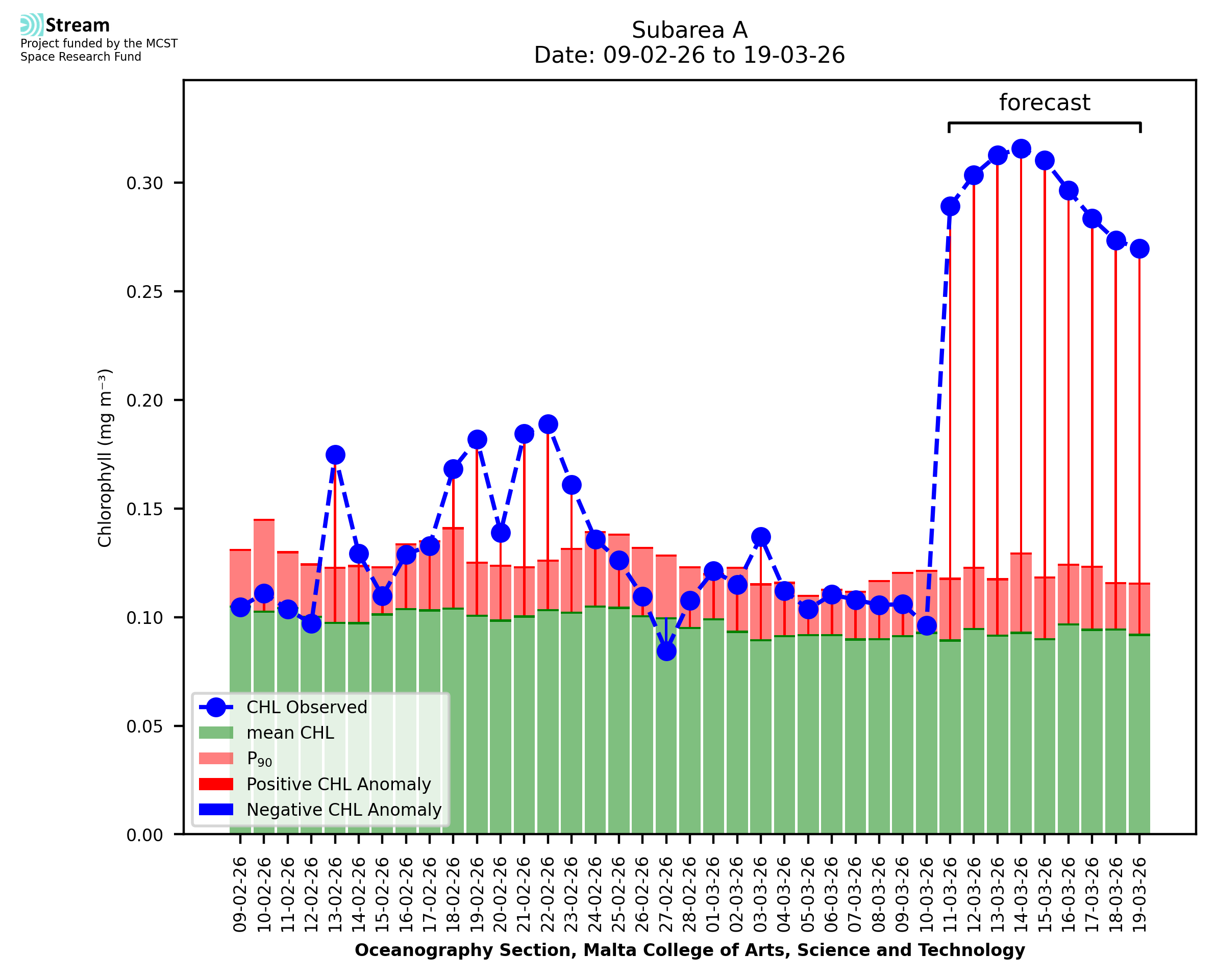 This STREAM service provides daily analysis of mass concentration of chlorophyll-a (CHL) anomalies, including spatial index maps for high chlorophyll occurrence and intensity in the sea around the Maltese Islands. User specific requests for data access and visualisation are planned for delivery on the STREAM mobile app. CHL is a core parameter in the Marine Strategy Framework Directive which provides the common framework for the assessment of the state of health of coastal seas to ensure coherence with the set goals of productive, healthy and clean European seas. CHL is considered to be a proxy of phythoplankton biomass and hence for eutrophication. Measuring chlorophyll is an indication of how much primary production is occurring in the sea.