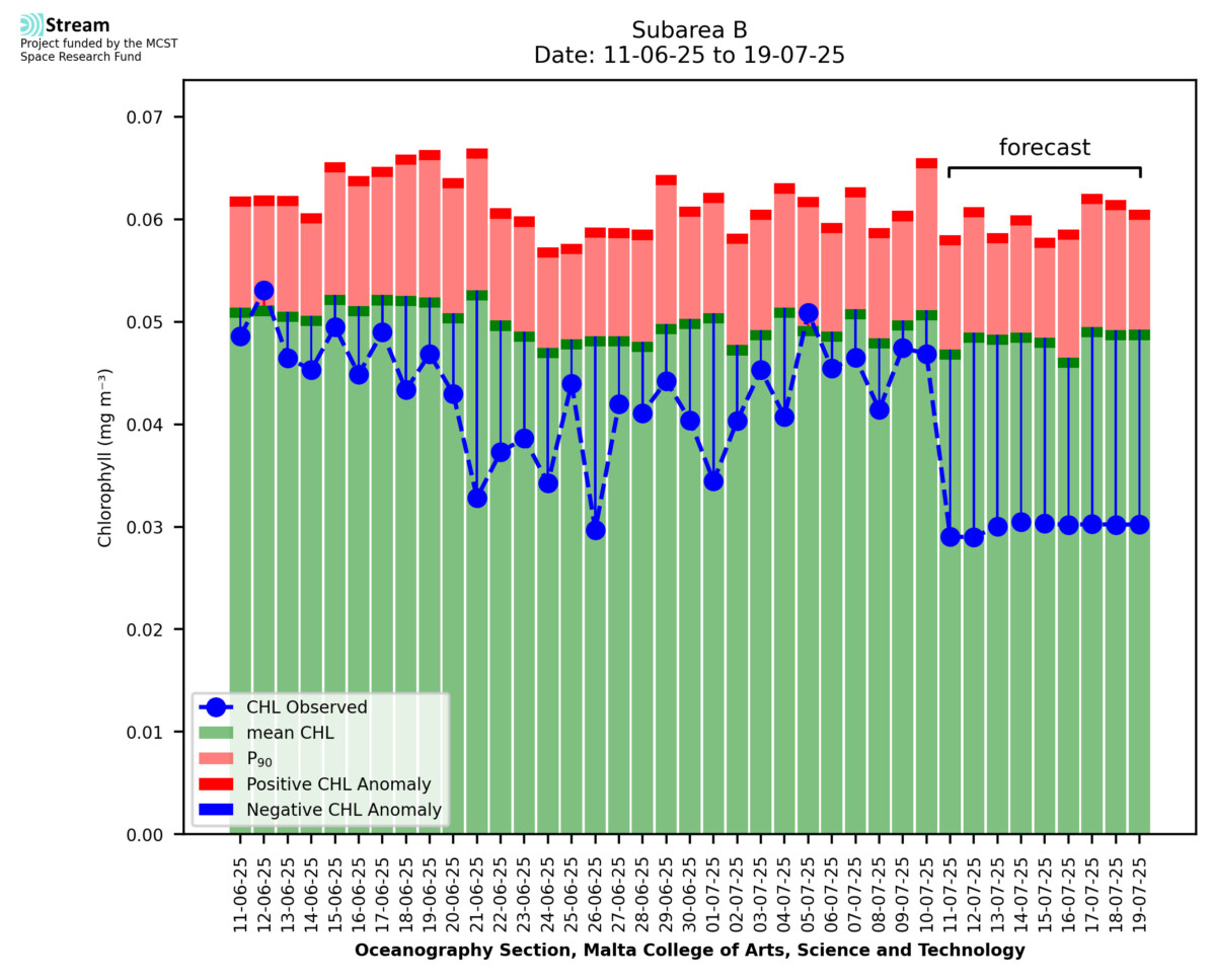 This STREAM service provides daily analysis of mass concentration of chlorophyll-a (CHL) anomalies, including spatial index maps for high chlorophyll occurrence and intensity in the sea around the Maltese Islands. User specific requests for data access and visualisation are planned for delivery on the STREAM mobile app. CHL is a core parameter in the Marine Strategy Framework Directive which provides the common framework for the assessment of the state of health of coastal seas to ensure coherence with the set goals of productive, healthy and clean European seas. CHL is considered to be a proxy of phythoplankton biomass and hence for eutrophication. Measuring chlorophyll is an indication of how much primary production is occurring in the sea.