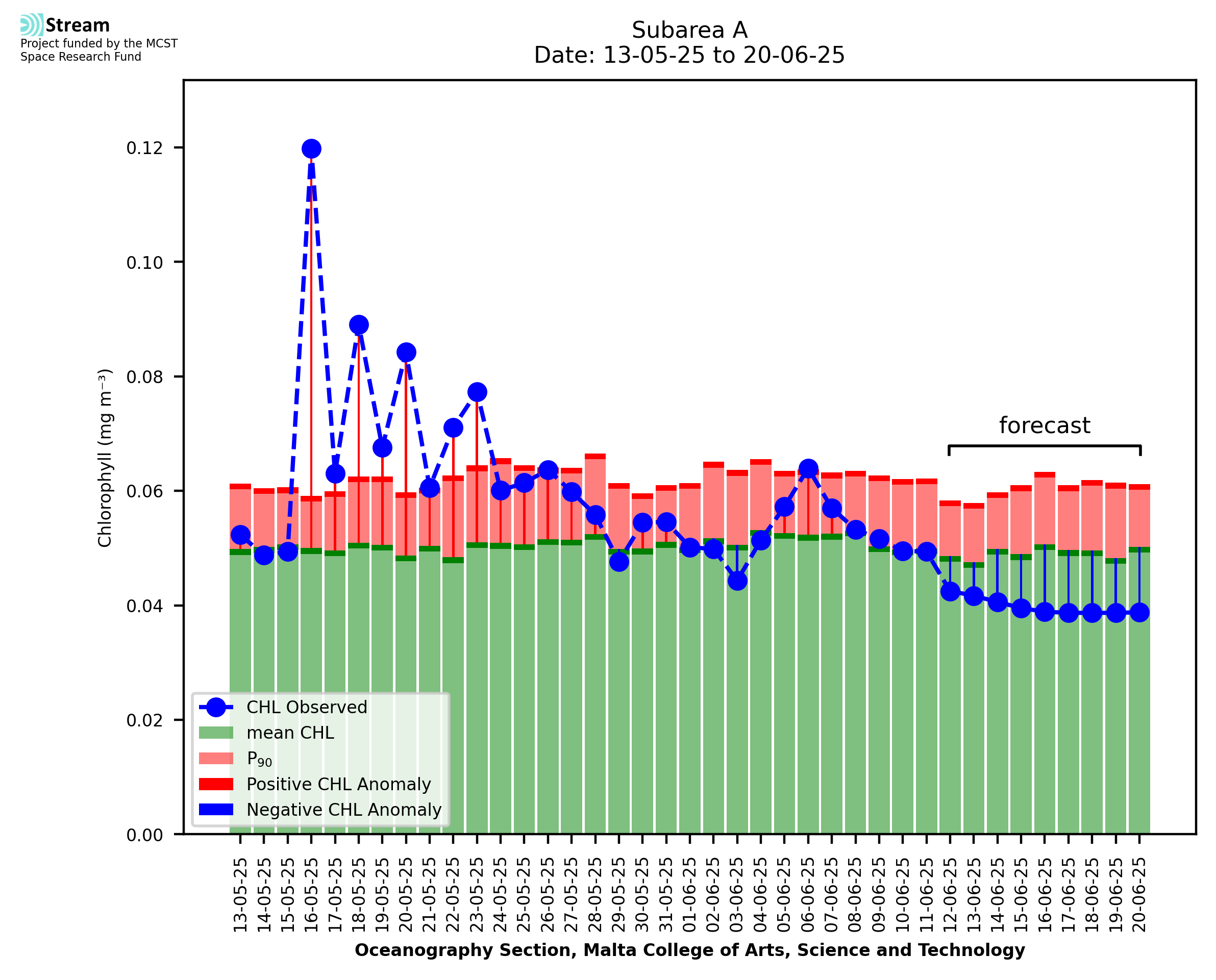 This STREAM service provides daily analysis of mass concentration of chlorophyll-a (CHL) anomalies, including spatial index maps for high chlorophyll occurrence and intensity in the sea around the Maltese Islands. User specific requests for data access and visualisation are planned for delivery on the STREAM mobile app. CHL is a core parameter in the Marine Strategy Framework Directive which provides the common framework for the assessment of the state of health of coastal seas to ensure coherence with the set goals of productive, healthy and clean European seas. CHL is considered to be a proxy of phythoplankton biomass and hence for eutrophication. Measuring chlorophyll is an indication of how much primary production is occurring in the sea.