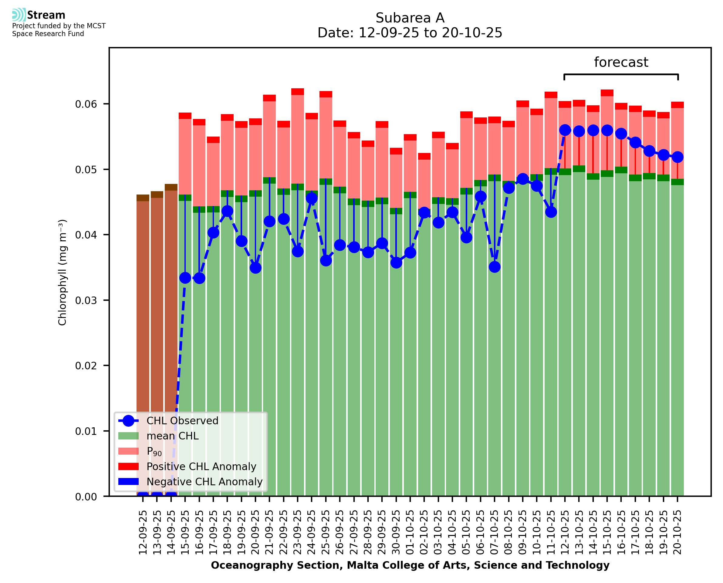 This STREAM service provides daily analysis of mass concentration of chlorophyll-a (CHL) anomalies, including spatial index maps for high chlorophyll occurrence and intensity in the sea around the Maltese Islands. User specific requests for data access and visualisation are planned for delivery on the STREAM mobile app. CHL is a core parameter in the Marine Strategy Framework Directive which provides the common framework for the assessment of the state of health of coastal seas to ensure coherence with the set goals of productive, healthy and clean European seas. CHL is considered to be a proxy of phythoplankton biomass and hence for eutrophication. Measuring chlorophyll is an indication of how much primary production is occurring in the sea.