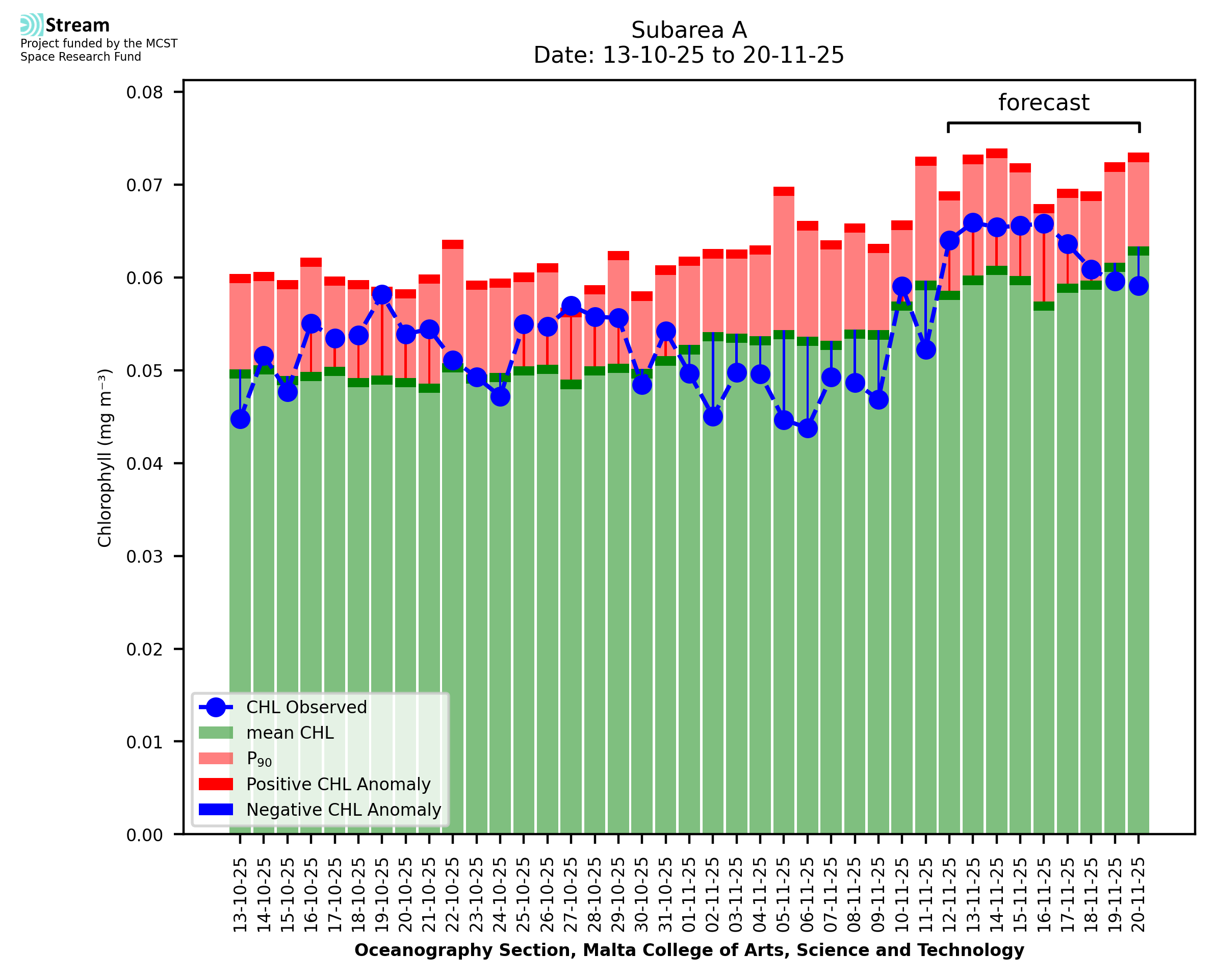 This STREAM service provides daily analysis of mass concentration of chlorophyll-a (CHL) anomalies, including spatial index maps for high chlorophyll occurrence and intensity in the sea around the Maltese Islands. User specific requests for data access and visualisation are planned for delivery on the STREAM mobile app. CHL is a core parameter in the Marine Strategy Framework Directive which provides the common framework for the assessment of the state of health of coastal seas to ensure coherence with the set goals of productive, healthy and clean European seas. CHL is considered to be a proxy of phythoplankton biomass and hence for eutrophication. Measuring chlorophyll is an indication of how much primary production is occurring in the sea.