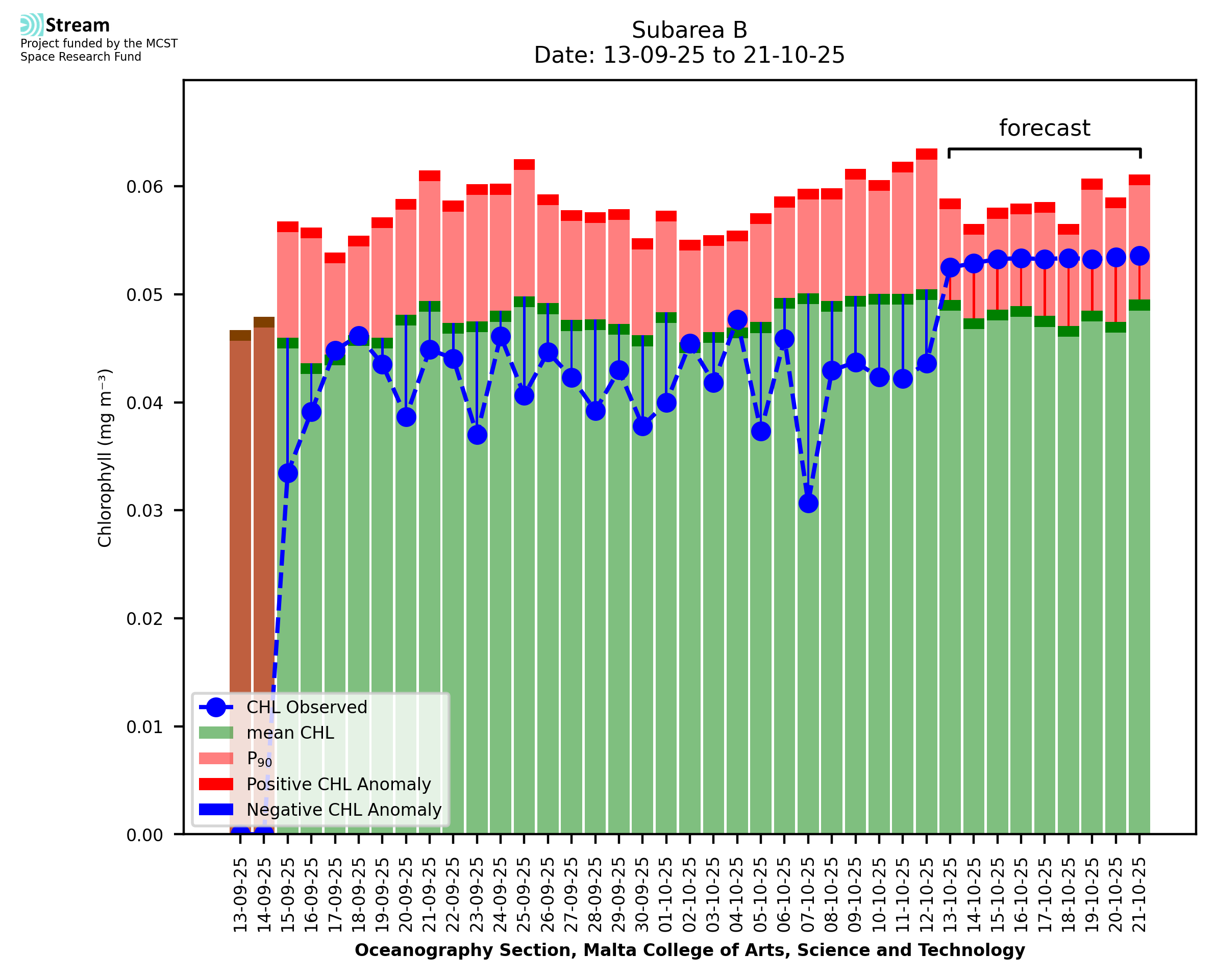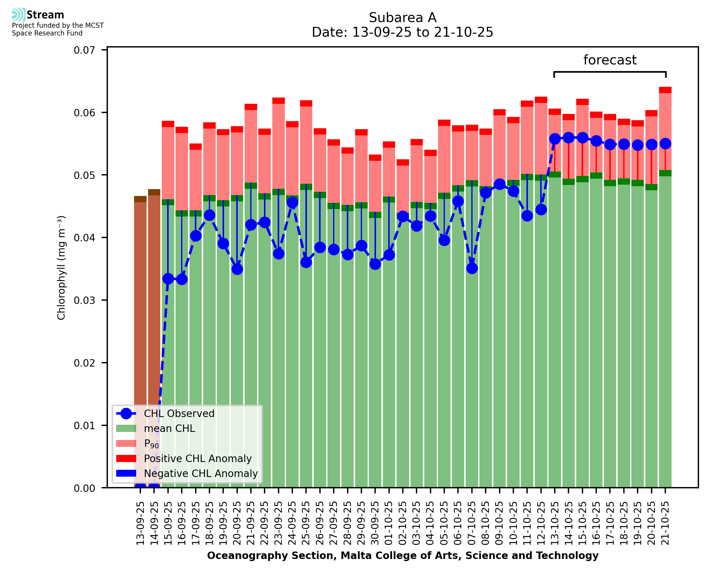 This STREAM service provides daily analysis of mass concentration of chlorophyll-a (CHL) anomalies, including spatial index maps for high chlorophyll occurrence and intensity in the sea around the Maltese Islands. User specific requests for data access and visualisation are planned for delivery on the STREAM mobile app. CHL is a core parameter in the Marine Strategy Framework Directive which provides the common framework for the assessment of the state of health of coastal seas to ensure coherence with the set goals of productive, healthy and clean European seas. CHL is considered to be a proxy of phythoplankton biomass and hence for eutrophication. Measuring chlorophyll is an indication of how much primary production is occurring in the sea.
