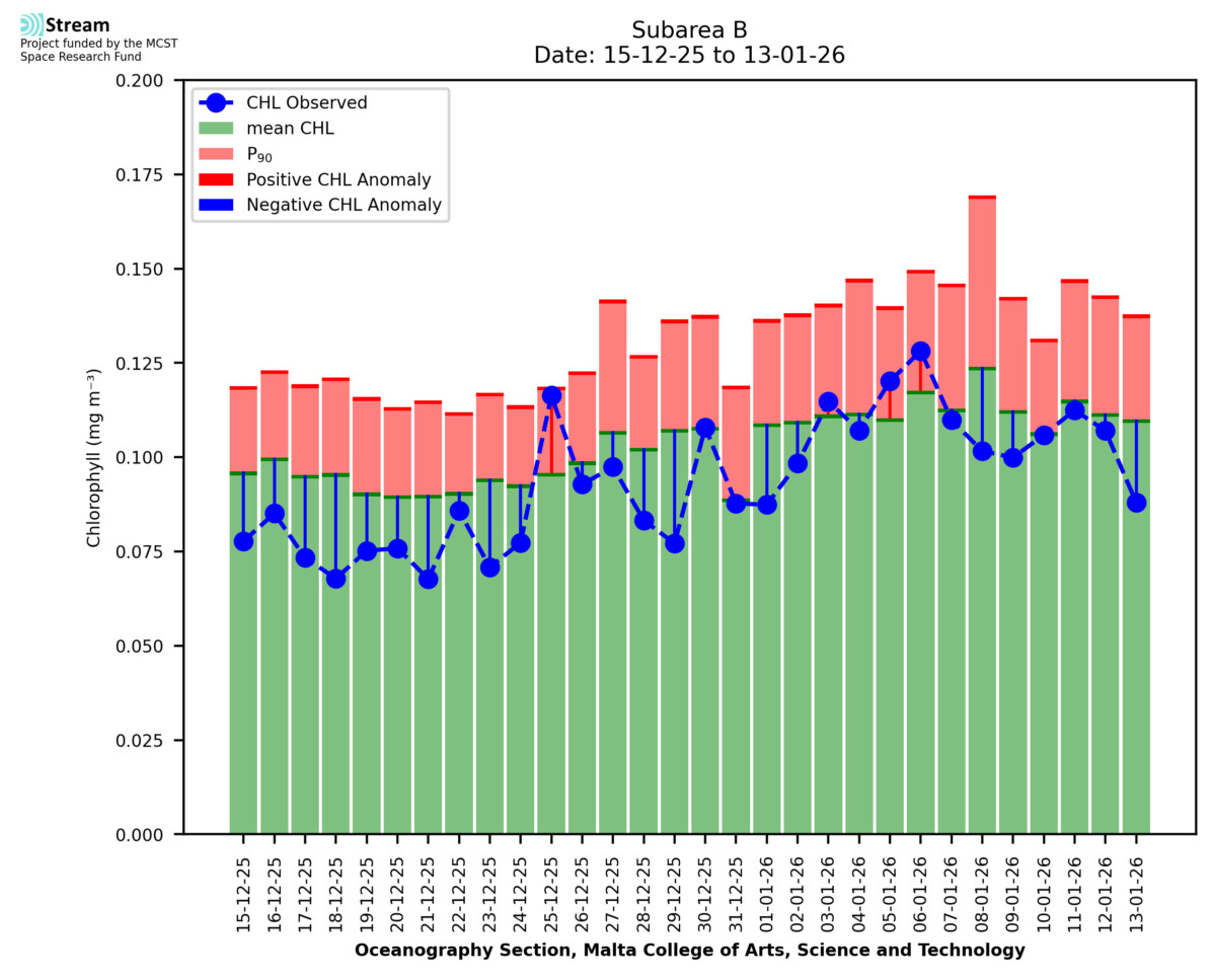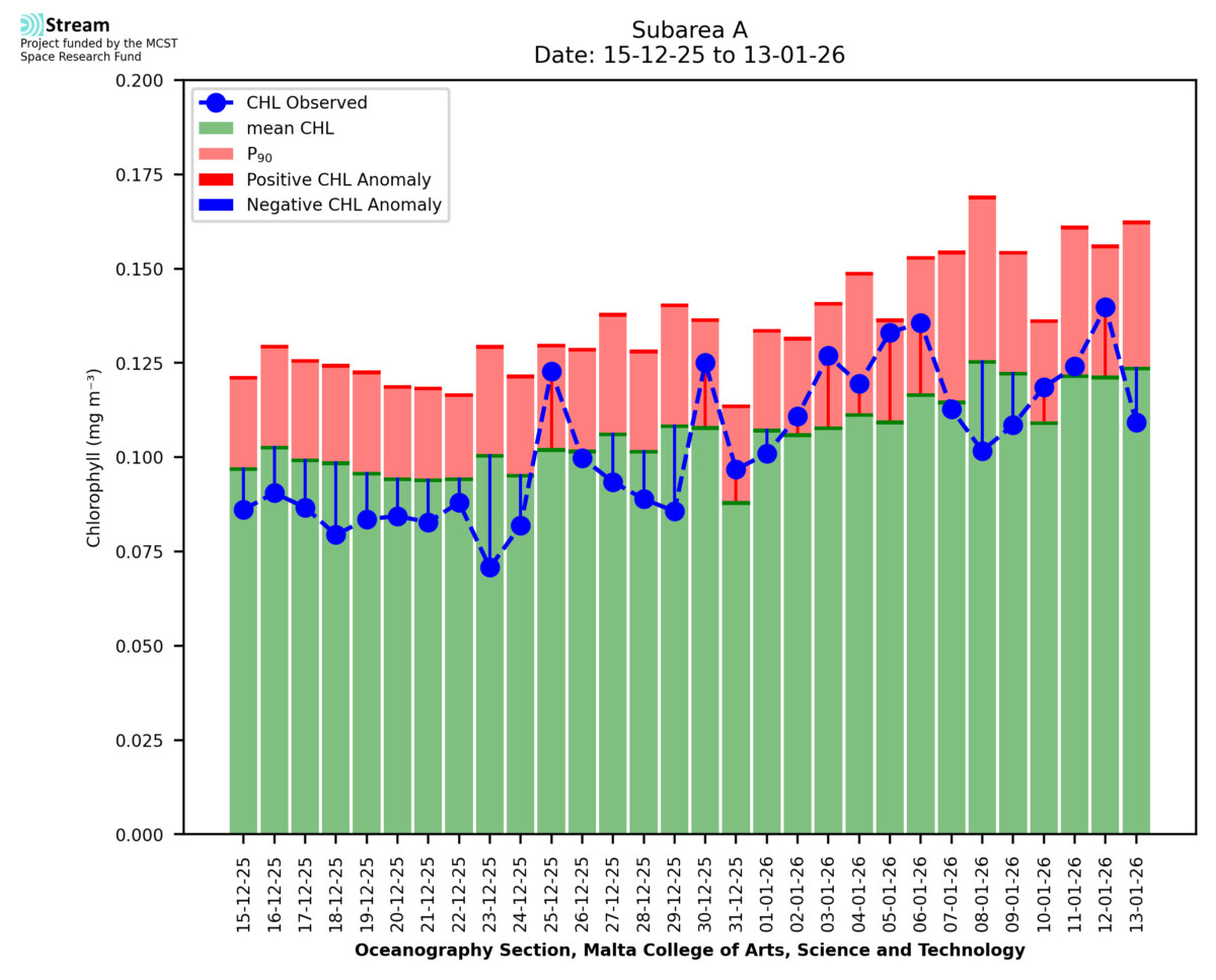 This STREAM service provides daily analysis of mass concentration of chlorophyll-a (CHL) anomalies, including spatial index maps for high chlorophyll occurrence and intensity in the sea around the Maltese Islands. User specific requests for data access and visualisation are planned for delivery on the STREAM mobile app. CHL is a core parameter in the Marine Strategy Framework Directive which provides the common framework for the assessment of the state of health of coastal seas to ensure coherence with the set goals of productive, healthy and clean European seas. CHL is considered to be a proxy of phythoplankton biomass and hence for eutrophication. Measuring chlorophyll is an indication of how much primary production is occurring in the sea.