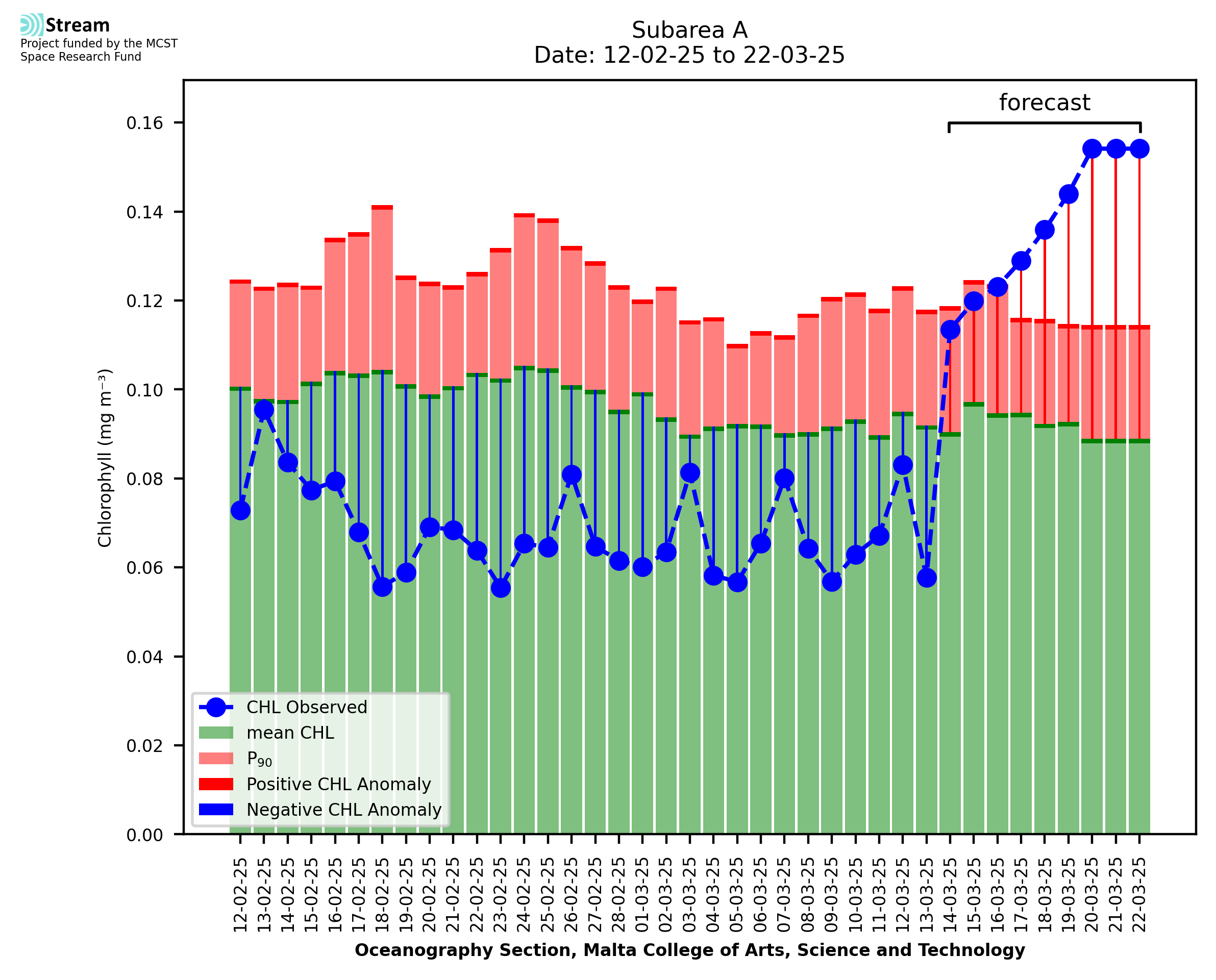 This STREAM service provides daily analysis of mass concentration of chlorophyll-a (CHL) anomalies, including spatial index maps for high chlorophyll occurrence and intensity in the sea around the Maltese Islands. User specific requests for data access and visualisation are planned for delivery on the STREAM mobile app. CHL is a core parameter in the Marine Strategy Framework Directive which provides the common framework for the assessment of the state of health of coastal seas to ensure coherence with the set goals of productive, healthy and clean European seas. CHL is considered to be a proxy of phythoplankton biomass and hence for eutrophication. Measuring chlorophyll is an indication of how much primary production is occurring in the sea.
