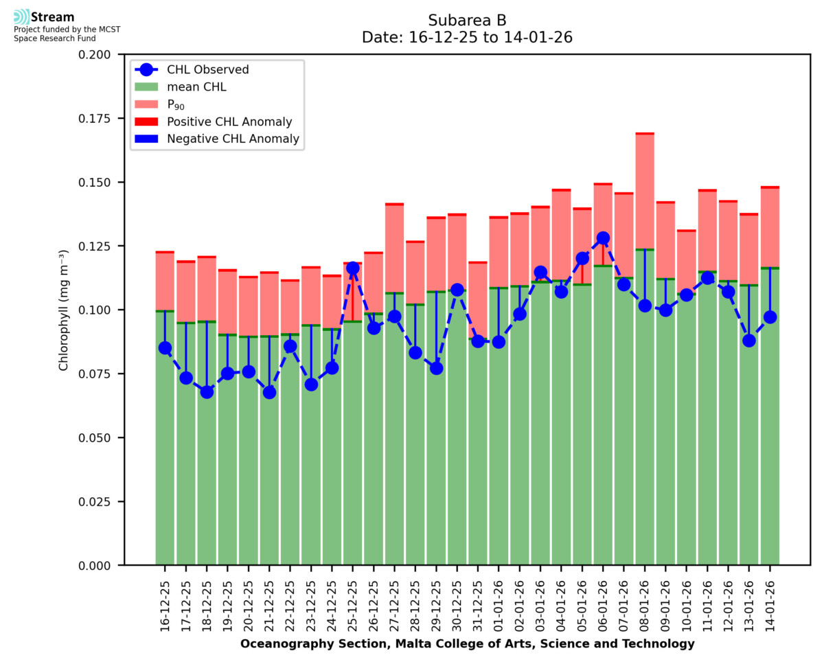 This STREAM service provides daily analysis of mass concentration of chlorophyll-a (CHL) anomalies, including spatial index maps for high chlorophyll occurrence and intensity in the sea around the Maltese Islands. User specific requests for data access and visualisation are planned for delivery on the STREAM mobile app. CHL is a core parameter in the Marine Strategy Framework Directive which provides the common framework for the assessment of the state of health of coastal seas to ensure coherence with the set goals of productive, healthy and clean European seas. CHL is considered to be a proxy of phythoplankton biomass and hence for eutrophication. Measuring chlorophyll is an indication of how much primary production is occurring in the sea.