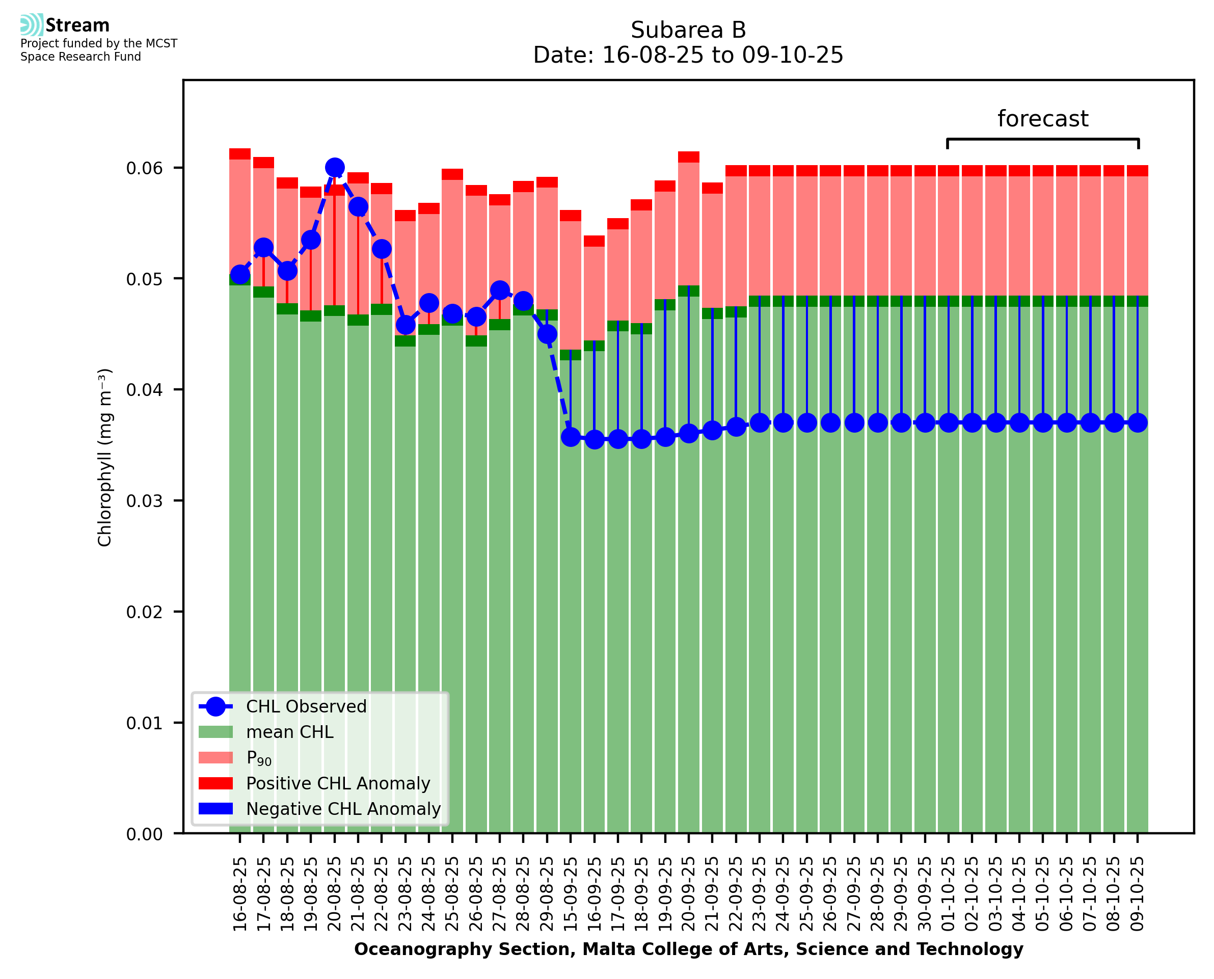 This STREAM service provides daily analysis of mass concentration of chlorophyll-a (CHL) anomalies, including spatial index maps for high chlorophyll occurrence and intensity in the sea around the Maltese Islands. User specific requests for data access and visualisation are planned for delivery on the STREAM mobile app. CHL is a core parameter in the Marine Strategy Framework Directive which provides the common framework for the assessment of the state of health of coastal seas to ensure coherence with the set goals of productive, healthy and clean European seas. CHL is considered to be a proxy of phythoplankton biomass and hence for eutrophication. Measuring chlorophyll is an indication of how much primary production is occurring in the sea.