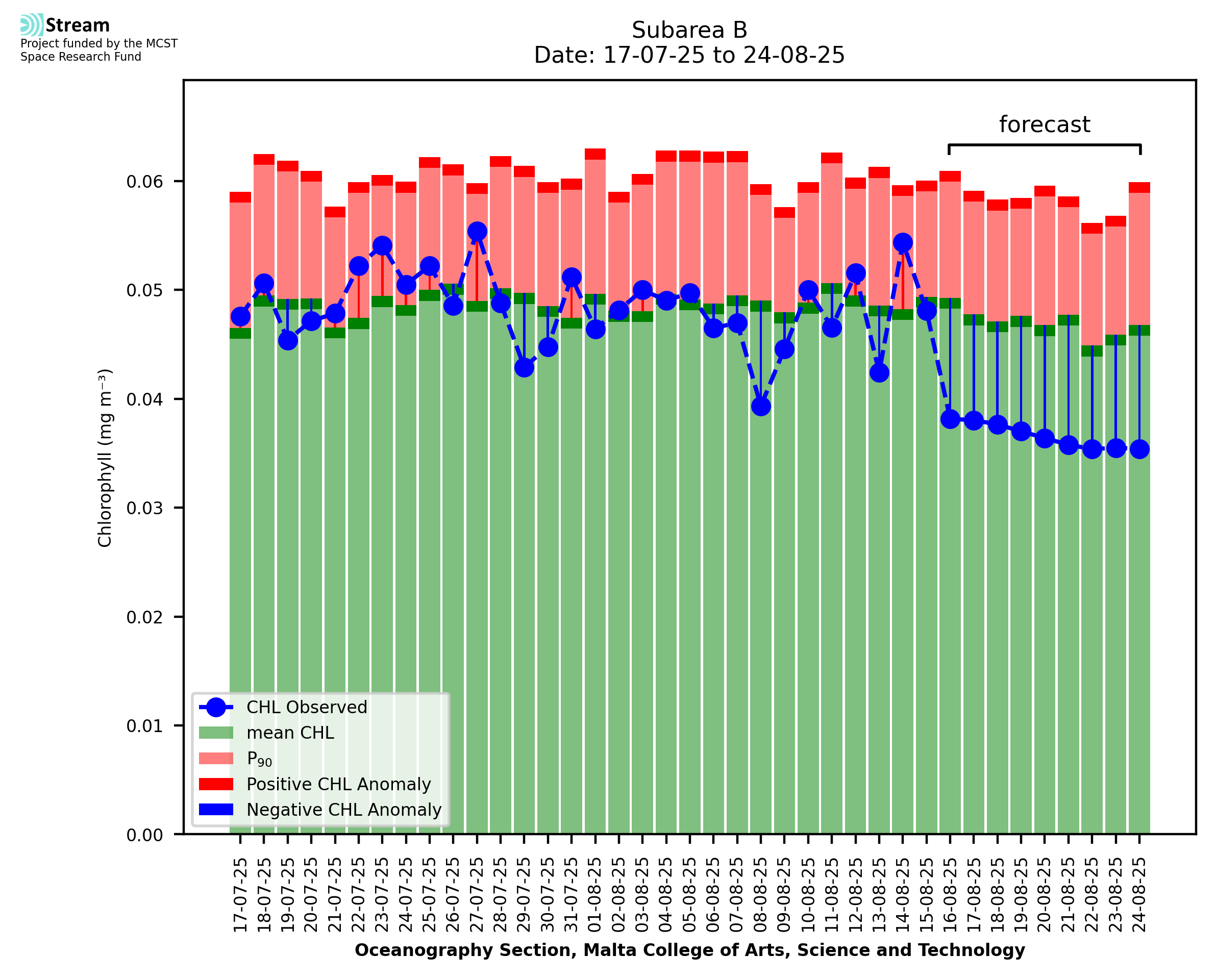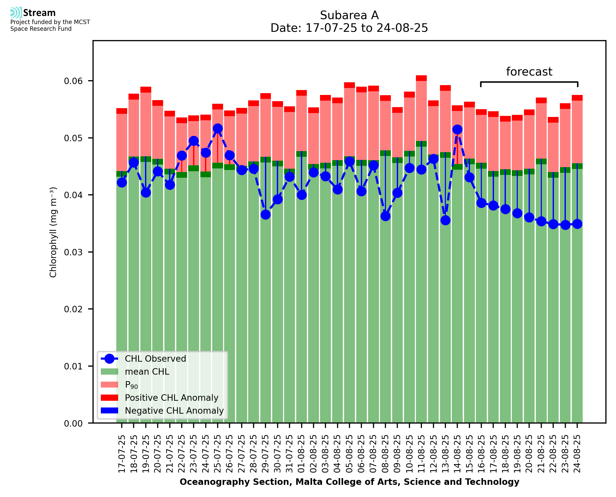 This STREAM service provides daily analysis of mass concentration of chlorophyll-a (CHL) anomalies, including spatial index maps for high chlorophyll occurrence and intensity in the sea around the Maltese Islands. User specific requests for data access and visualisation are planned for delivery on the STREAM mobile app. CHL is a core parameter in the Marine Strategy Framework Directive which provides the common framework for the assessment of the state of health of coastal seas to ensure coherence with the set goals of productive, healthy and clean European seas. CHL is considered to be a proxy of phythoplankton biomass and hence for eutrophication. Measuring chlorophyll is an indication of how much primary production is occurring in the sea.