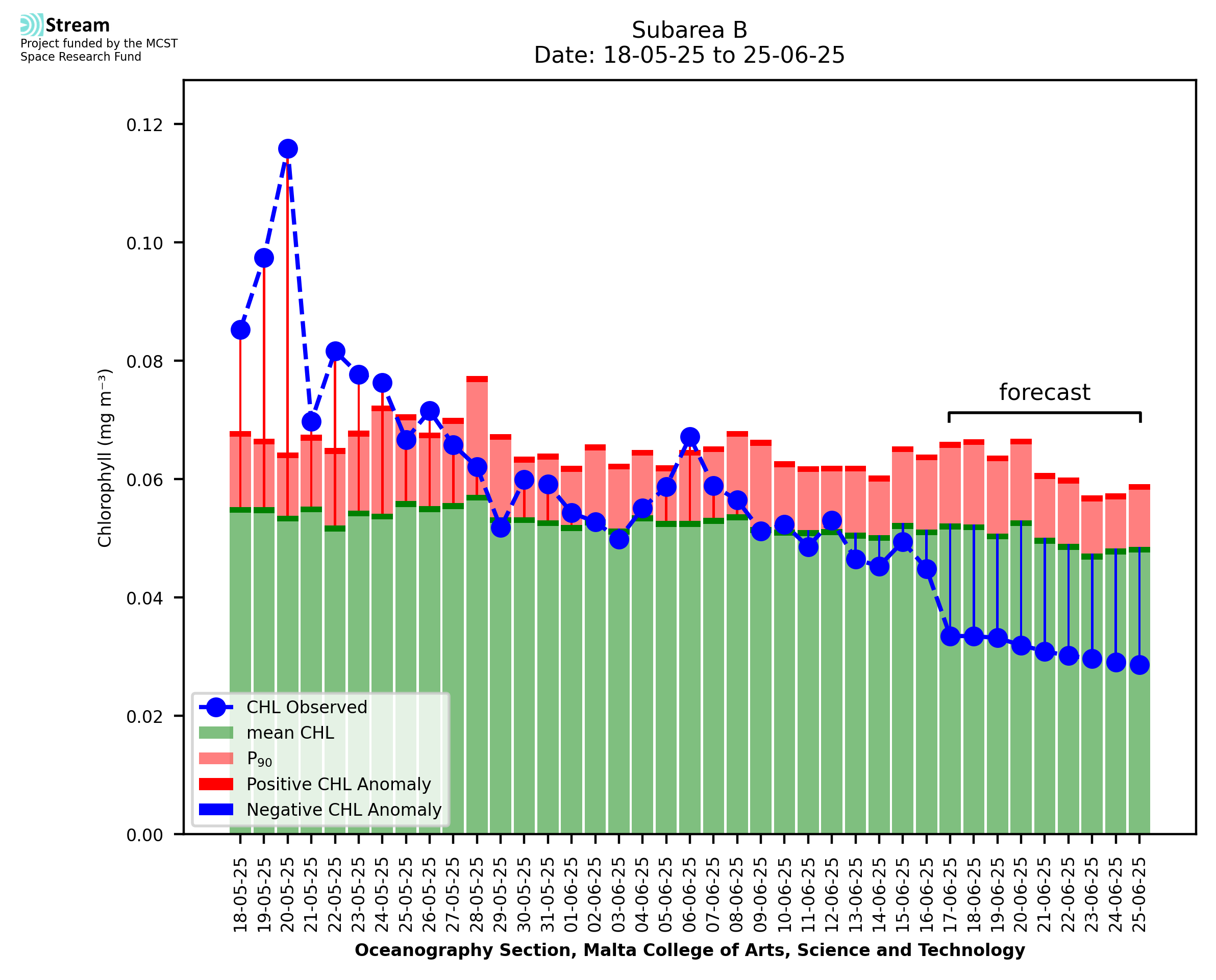 This STREAM service provides daily analysis of mass concentration of chlorophyll-a (CHL) anomalies, including spatial index maps for high chlorophyll occurrence and intensity in the sea around the Maltese Islands. User specific requests for data access and visualisation are planned for delivery on the STREAM mobile app. CHL is a core parameter in the Marine Strategy Framework Directive which provides the common framework for the assessment of the state of health of coastal seas to ensure coherence with the set goals of productive, healthy and clean European seas. CHL is considered to be a proxy of phythoplankton biomass and hence for eutrophication. Measuring chlorophyll is an indication of how much primary production is occurring in the sea.