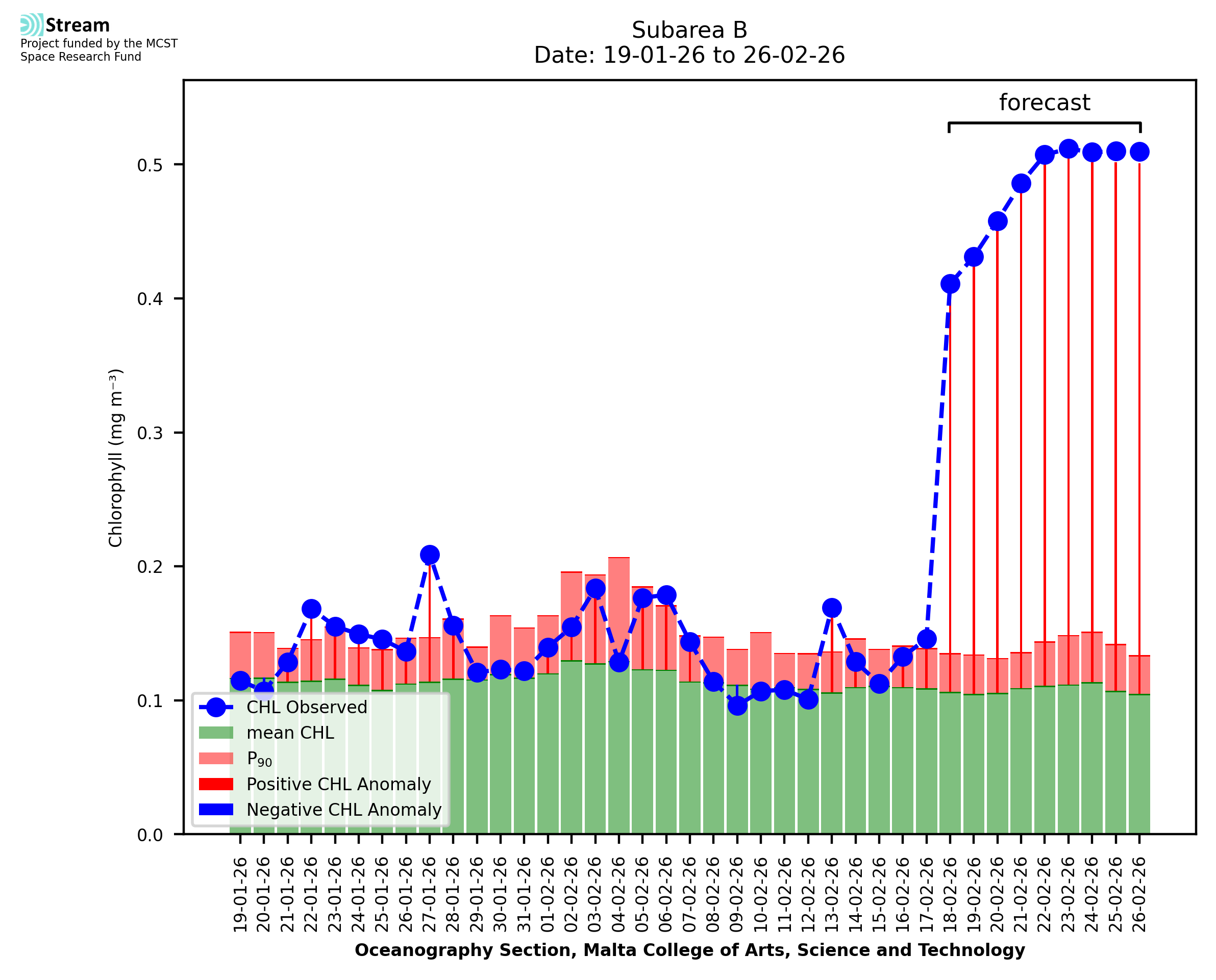 This STREAM service provides daily analysis of mass concentration of chlorophyll-a (CHL) anomalies, including spatial index maps for high chlorophyll occurrence and intensity in the sea around the Maltese Islands. User specific requests for data access and visualisation are planned for delivery on the STREAM mobile app. CHL is a core parameter in the Marine Strategy Framework Directive which provides the common framework for the assessment of the state of health of coastal seas to ensure coherence with the set goals of productive, healthy and clean European seas. CHL is considered to be a proxy of phythoplankton biomass and hence for eutrophication. Measuring chlorophyll is an indication of how much primary production is occurring in the sea.