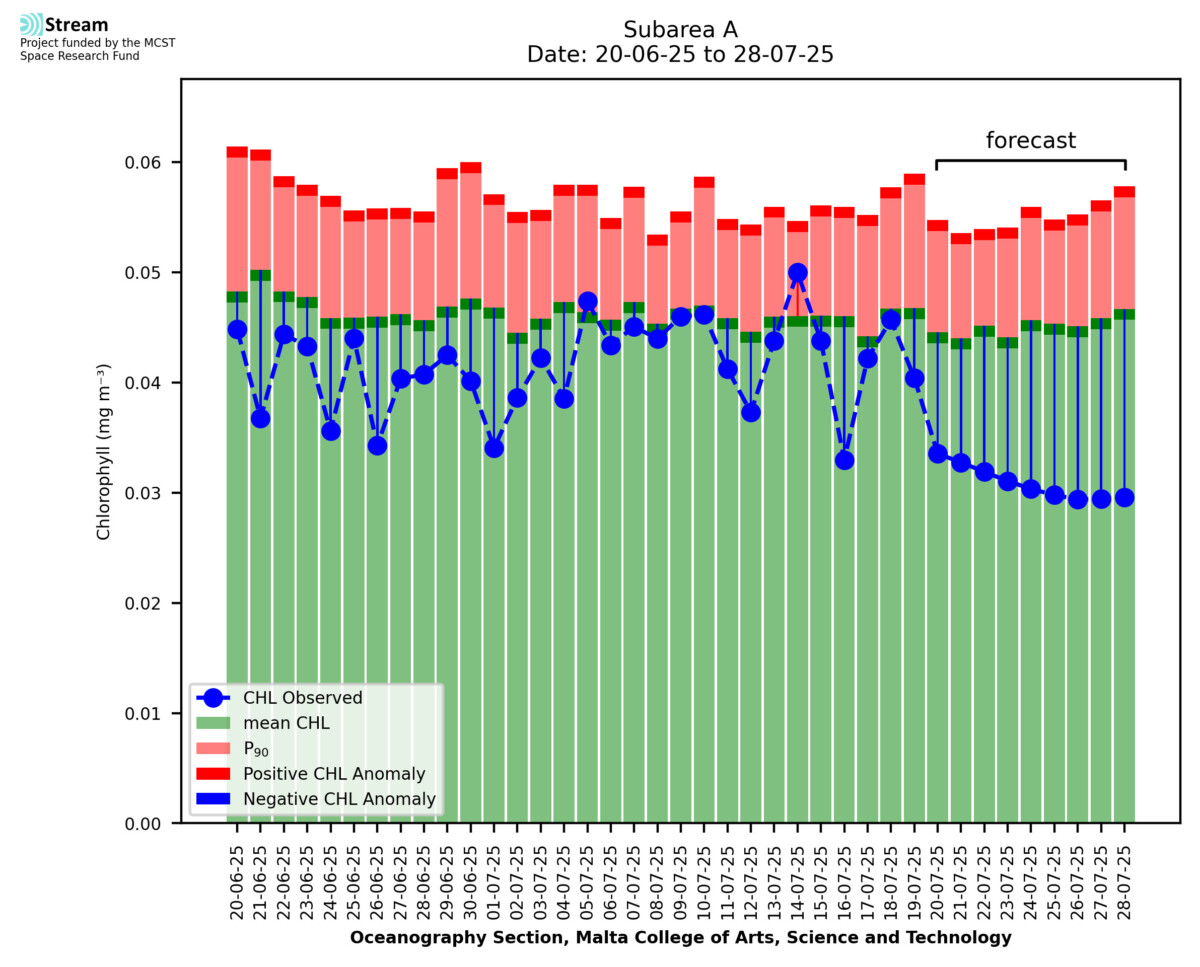 This STREAM service provides daily analysis of mass concentration of chlorophyll-a (CHL) anomalies, including spatial index maps for high chlorophyll occurrence and intensity in the sea around the Maltese Islands. User specific requests for data access and visualisation are planned for delivery on the STREAM mobile app. CHL is a core parameter in the Marine Strategy Framework Directive which provides the common framework for the assessment of the state of health of coastal seas to ensure coherence with the set goals of productive, healthy and clean European seas. CHL is considered to be a proxy of phythoplankton biomass and hence for eutrophication. Measuring chlorophyll is an indication of how much primary production is occurring in the sea.