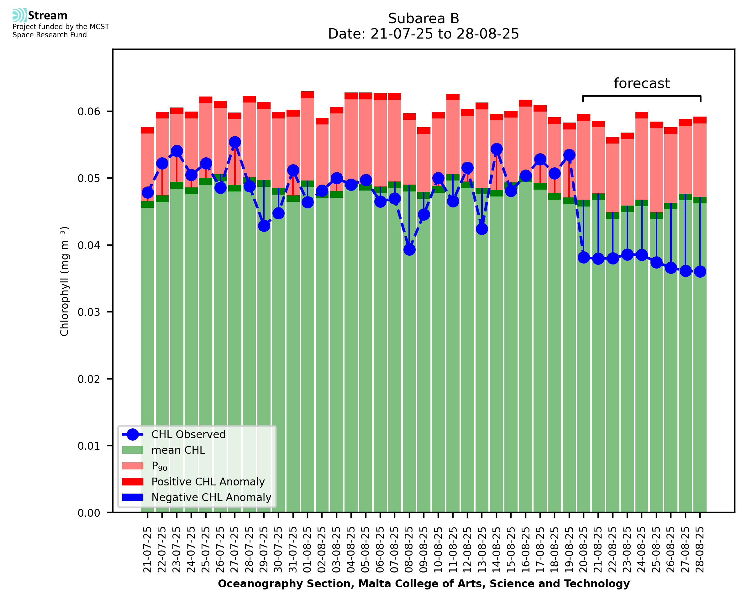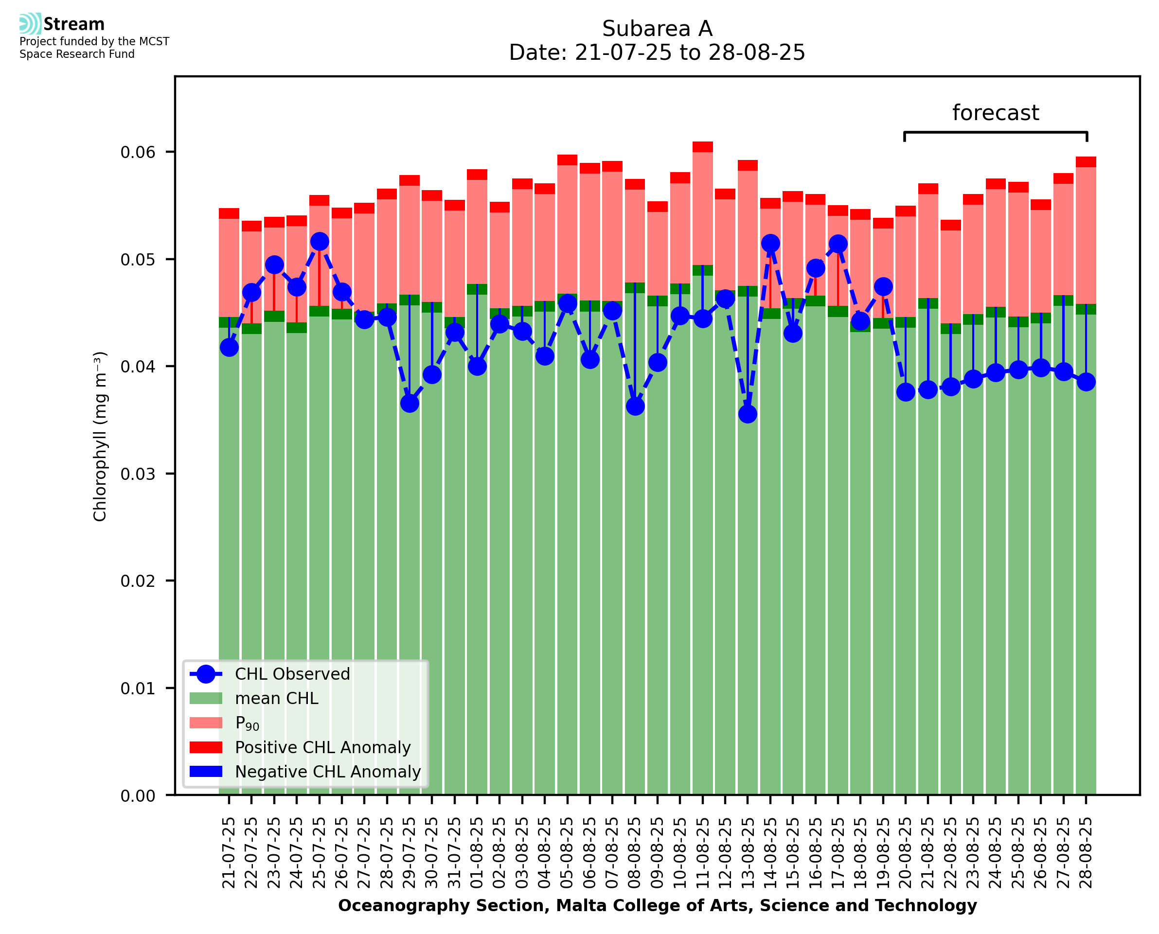This STREAM service provides daily analysis of mass concentration of chlorophyll-a (CHL) anomalies, including spatial index maps for high chlorophyll occurrence and intensity in the sea around the Maltese Islands. User specific requests for data access and visualisation are planned for delivery on the STREAM mobile app. CHL is a core parameter in the Marine Strategy Framework Directive which provides the common framework for the assessment of the state of health of coastal seas to ensure coherence with the set goals of productive, healthy and clean European seas. CHL is considered to be a proxy of phythoplankton biomass and hence for eutrophication. Measuring chlorophyll is an indication of how much primary production is occurring in the sea.