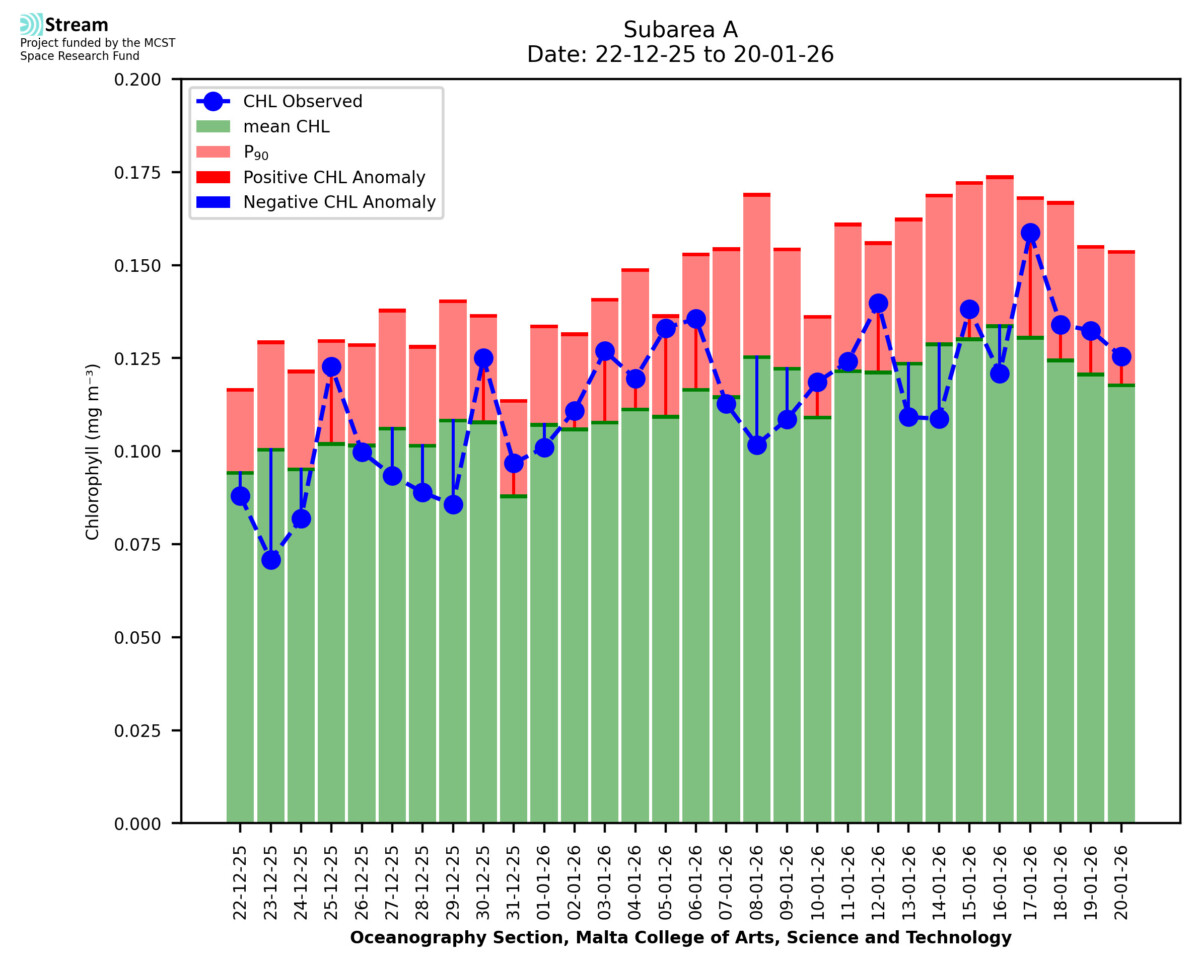 This STREAM service provides daily analysis of mass concentration of chlorophyll-a (CHL) anomalies, including spatial index maps for high chlorophyll occurrence and intensity in the sea around the Maltese Islands. User specific requests for data access and visualisation are planned for delivery on the STREAM mobile app. CHL is a core parameter in the Marine Strategy Framework Directive which provides the common framework for the assessment of the state of health of coastal seas to ensure coherence with the set goals of productive, healthy and clean European seas. CHL is considered to be a proxy of phythoplankton biomass and hence for eutrophication. Measuring chlorophyll is an indication of how much primary production is occurring in the sea.