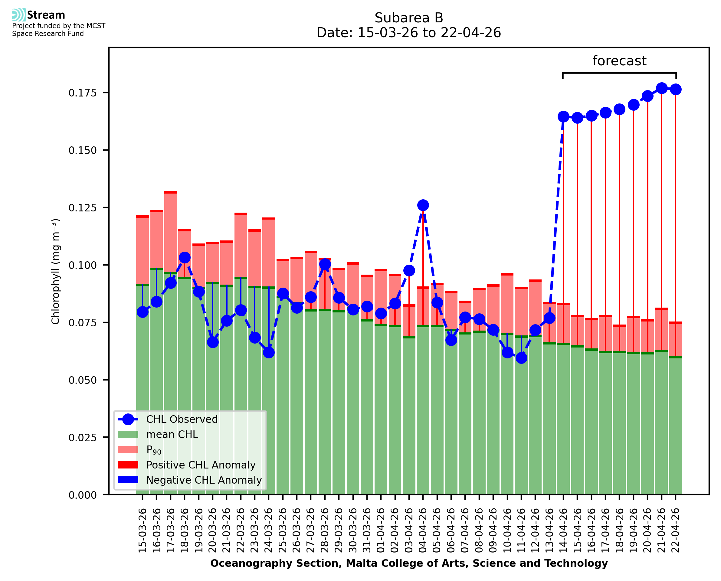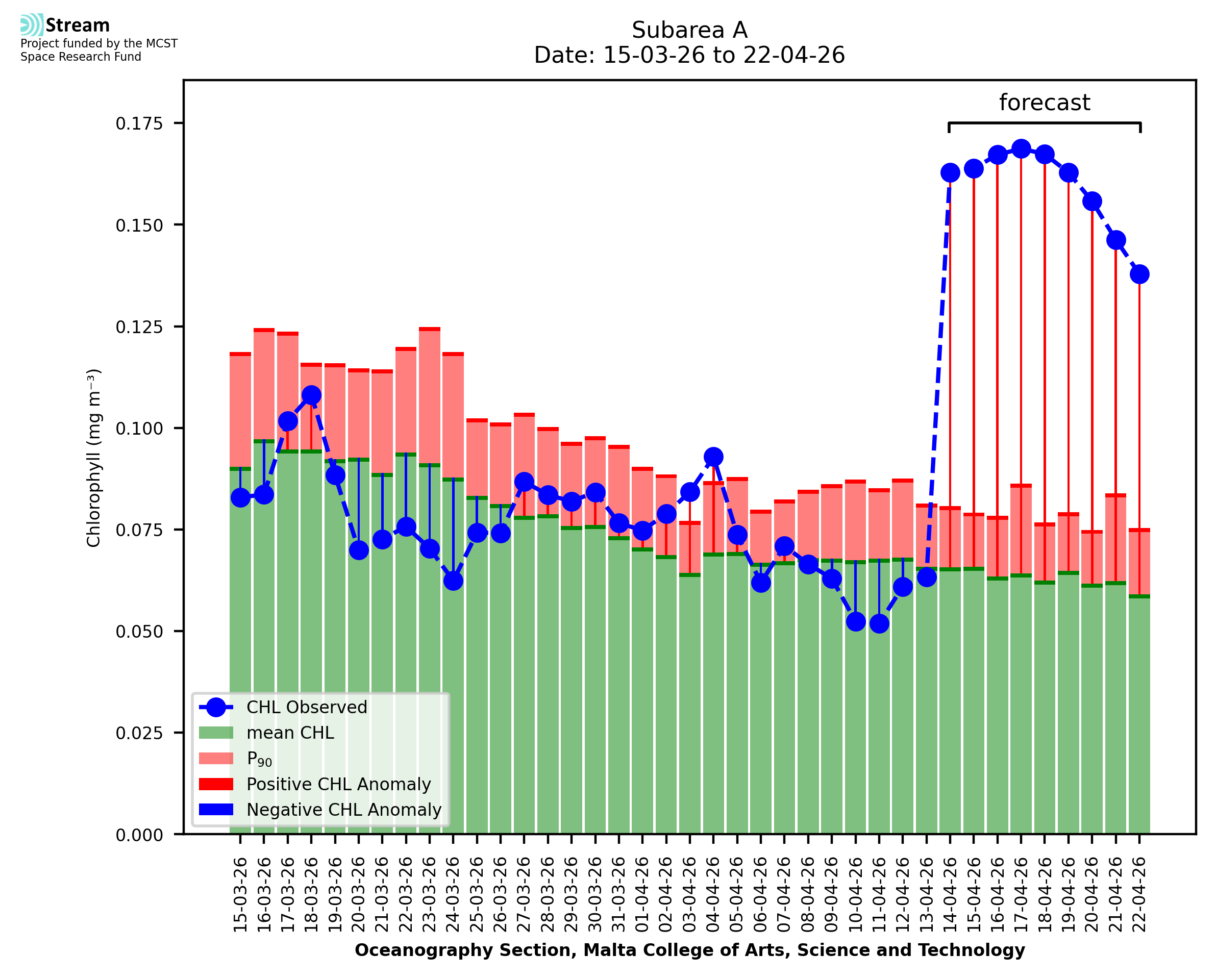 This STREAM service provides daily analysis of mass concentration of chlorophyll-a (CHL) anomalies, including spatial index maps for high chlorophyll occurrence and intensity in the sea around the Maltese Islands. User specific requests for data access and visualisation are planned for delivery on the STREAM mobile app. CHL is a core parameter in the Marine Strategy Framework Directive which provides the common framework for the assessment of the state of health of coastal seas to ensure coherence with the set goals of productive, healthy and clean European seas. CHL is considered to be a proxy of phythoplankton biomass and hence for eutrophication. Measuring chlorophyll is an indication of how much primary production is occurring in the sea.