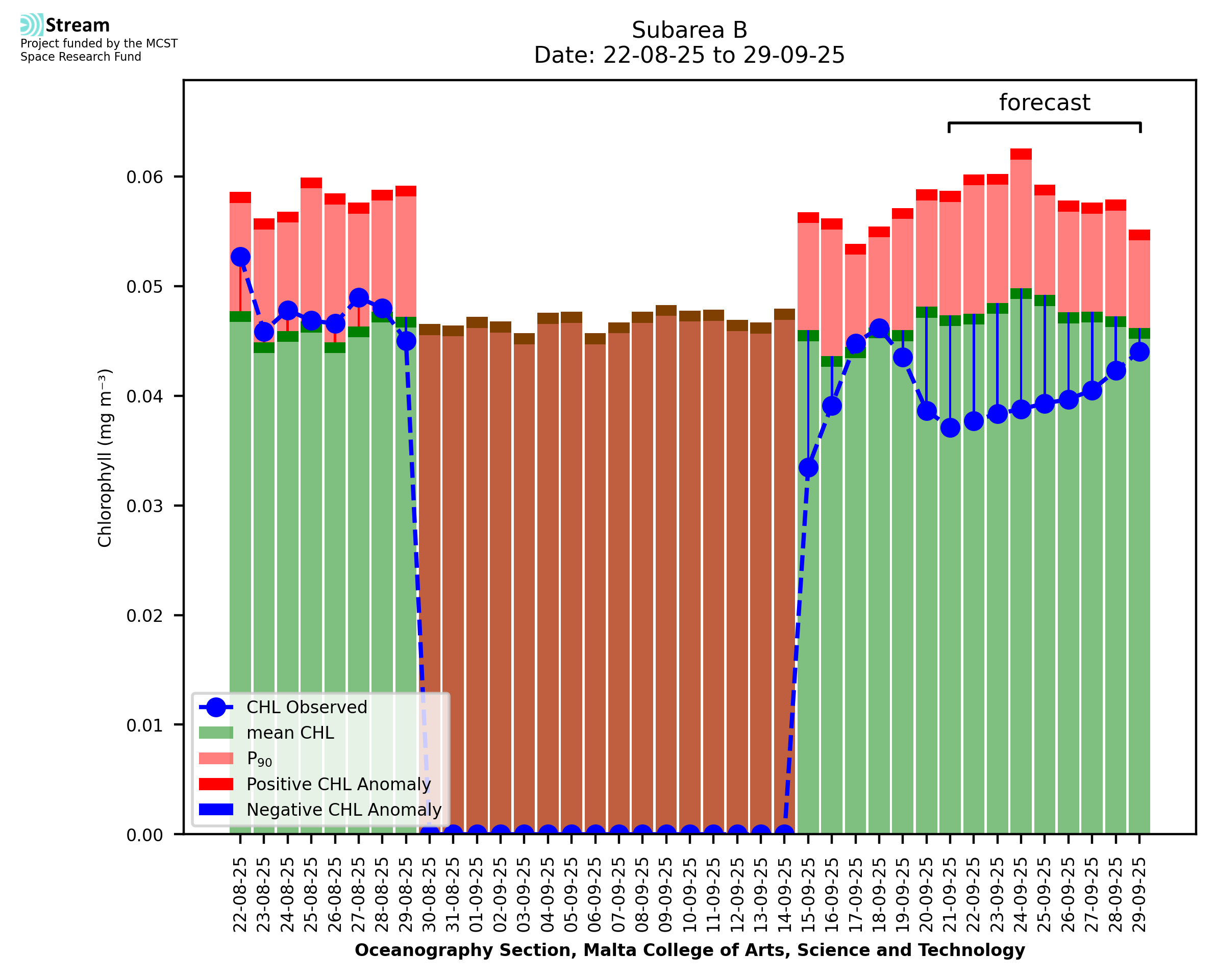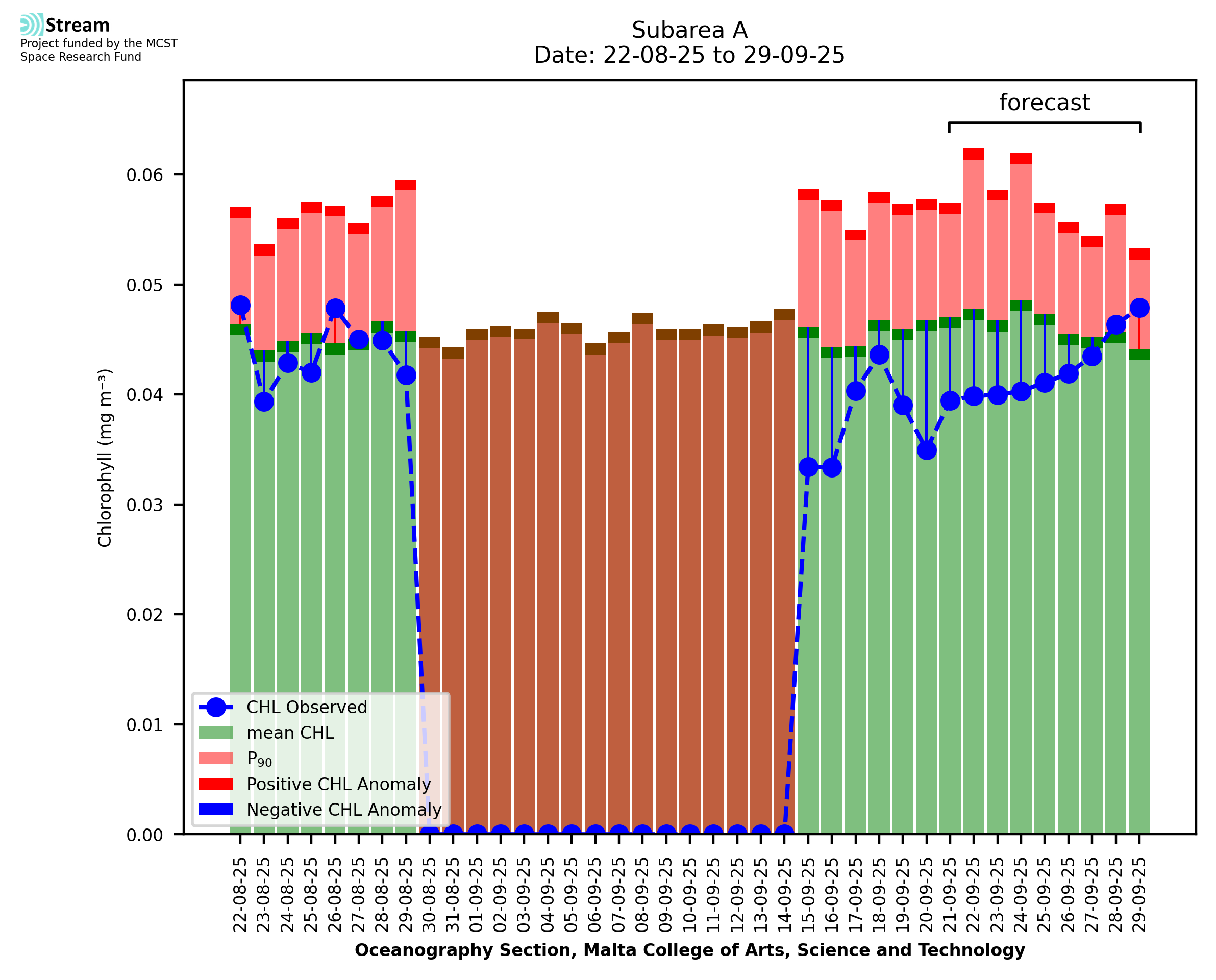 This STREAM service provides daily analysis of mass concentration of chlorophyll-a (CHL) anomalies, including spatial index maps for high chlorophyll occurrence and intensity in the sea around the Maltese Islands. User specific requests for data access and visualisation are planned for delivery on the STREAM mobile app. CHL is a core parameter in the Marine Strategy Framework Directive which provides the common framework for the assessment of the state of health of coastal seas to ensure coherence with the set goals of productive, healthy and clean European seas. CHL is considered to be a proxy of phythoplankton biomass and hence for eutrophication. Measuring chlorophyll is an indication of how much primary production is occurring in the sea.