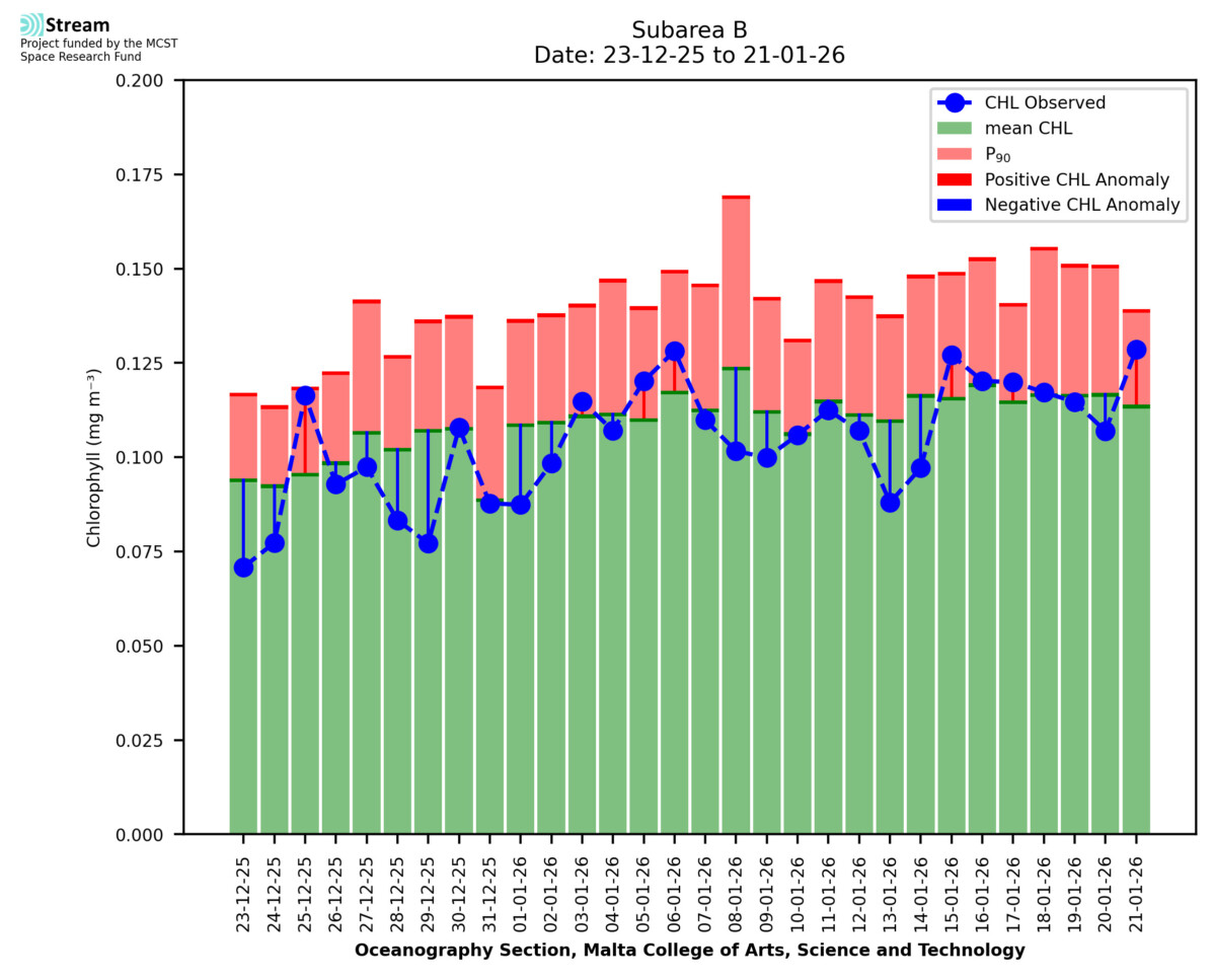 This STREAM service provides daily analysis of mass concentration of chlorophyll-a (CHL) anomalies, including spatial index maps for high chlorophyll occurrence and intensity in the sea around the Maltese Islands. User specific requests for data access and visualisation are planned for delivery on the STREAM mobile app. CHL is a core parameter in the Marine Strategy Framework Directive which provides the common framework for the assessment of the state of health of coastal seas to ensure coherence with the set goals of productive, healthy and clean European seas. CHL is considered to be a proxy of phythoplankton biomass and hence for eutrophication. Measuring chlorophyll is an indication of how much primary production is occurring in the sea.