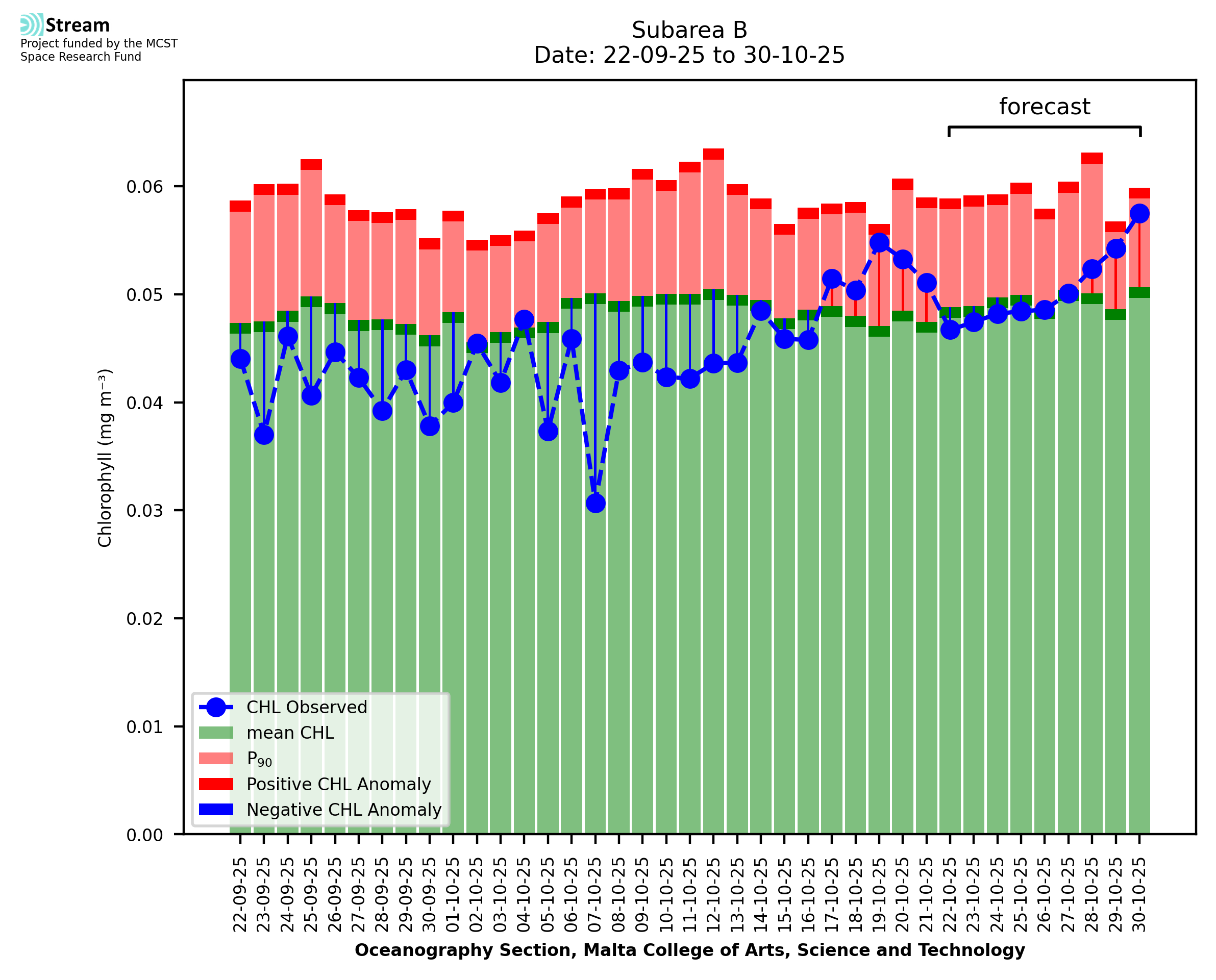 This STREAM service provides daily analysis of mass concentration of chlorophyll-a (CHL) anomalies, including spatial index maps for high chlorophyll occurrence and intensity in the sea around the Maltese Islands. User specific requests for data access and visualisation are planned for delivery on the STREAM mobile app. CHL is a core parameter in the Marine Strategy Framework Directive which provides the common framework for the assessment of the state of health of coastal seas to ensure coherence with the set goals of productive, healthy and clean European seas. CHL is considered to be a proxy of phythoplankton biomass and hence for eutrophication. Measuring chlorophyll is an indication of how much primary production is occurring in the sea.