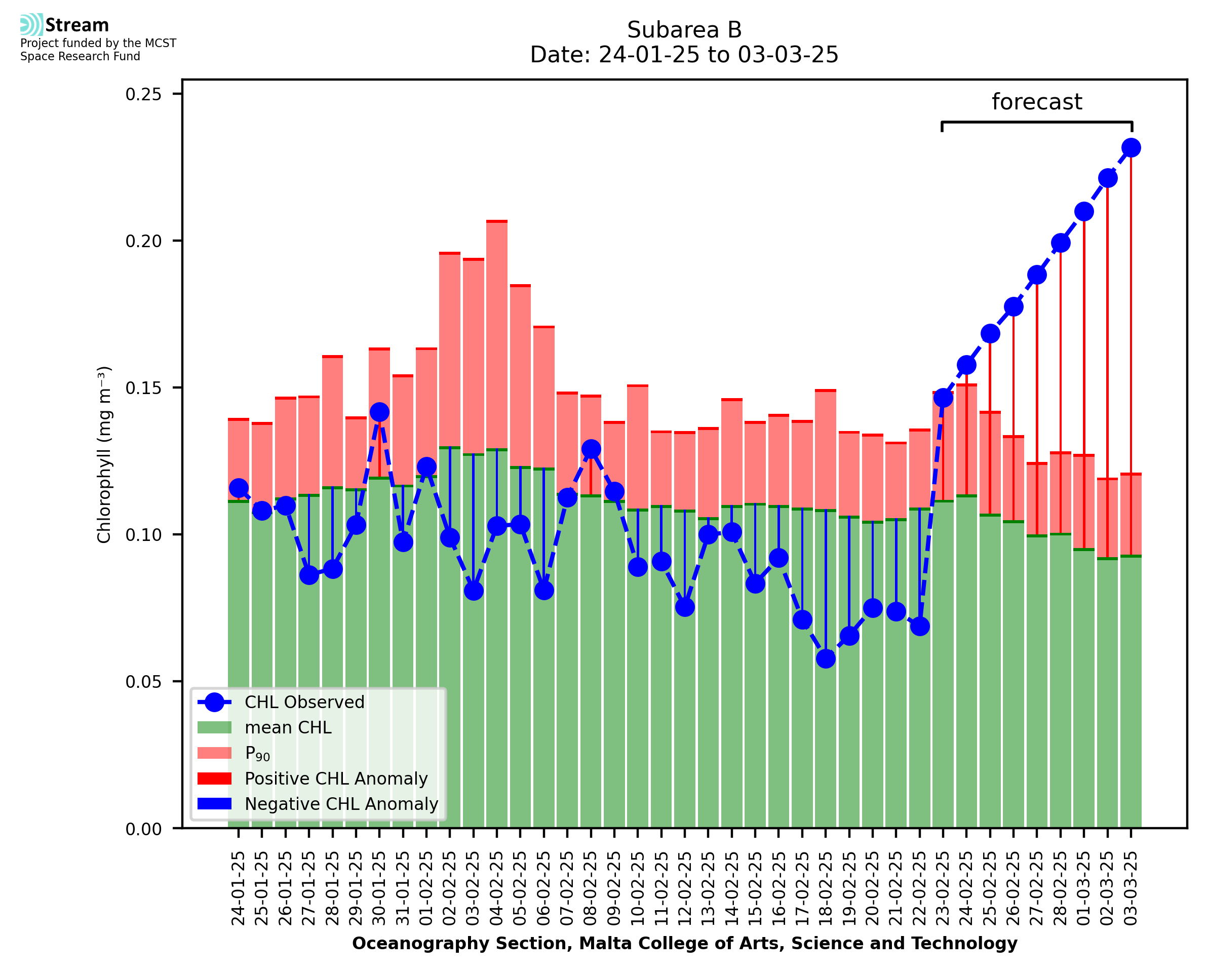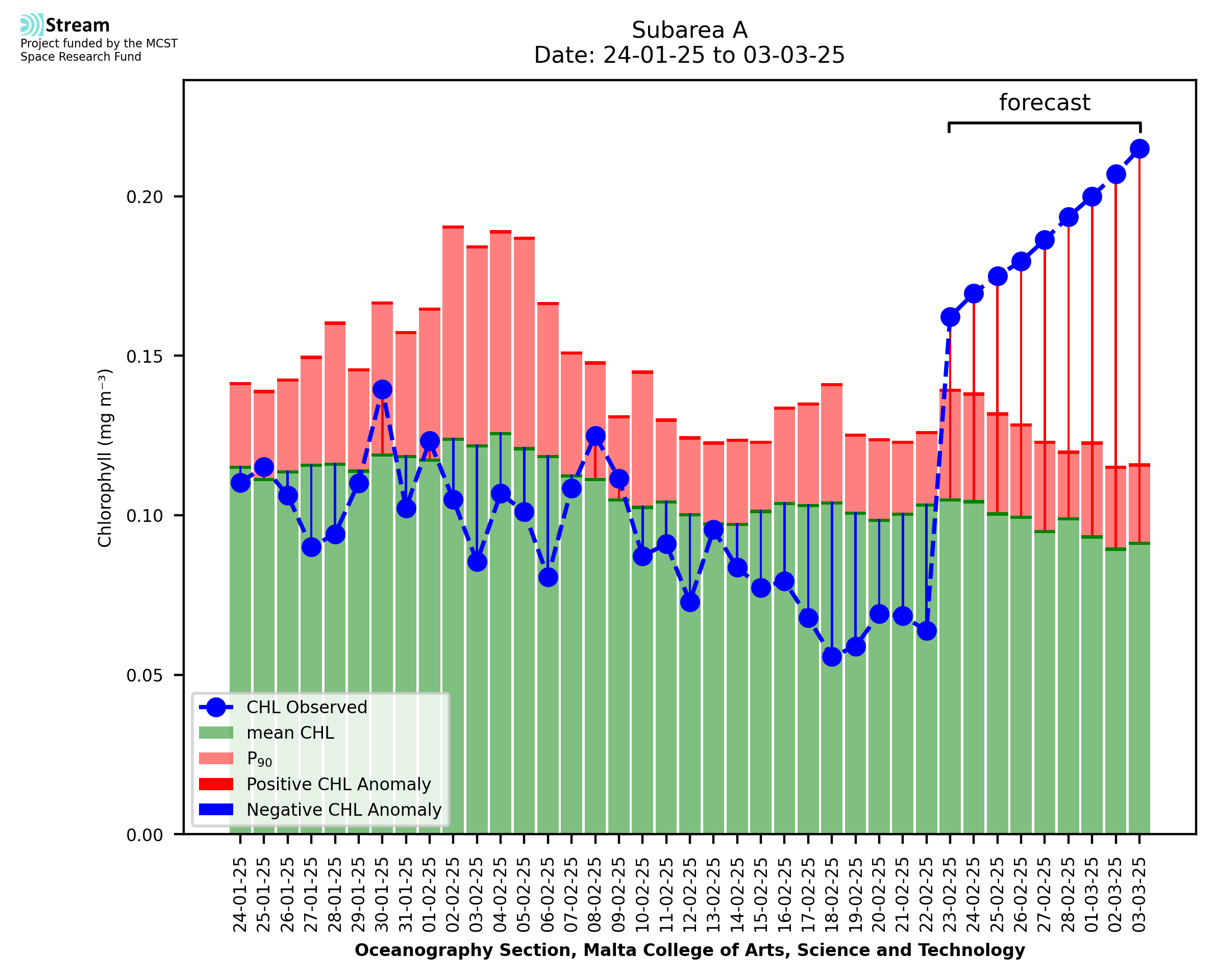 This STREAM service provides daily analysis of mass concentration of chlorophyll-a (CHL) anomalies, including spatial index maps for high chlorophyll occurrence and intensity in the sea around the Maltese Islands. User specific requests for data access and visualisation are planned for delivery on the STREAM mobile app. CHL is a core parameter in the Marine Strategy Framework Directive which provides the common framework for the assessment of the state of health of coastal seas to ensure coherence with the set goals of productive, healthy and clean European seas. CHL is considered to be a proxy of phythoplankton biomass and hence for eutrophication. Measuring chlorophyll is an indication of how much primary production is occurring in the sea.