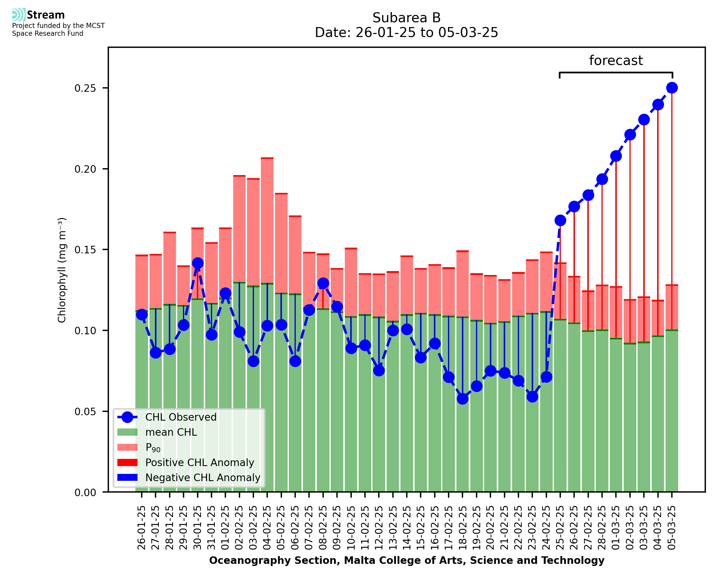This STREAM service provides daily analysis of mass concentration of chlorophyll-a (CHL) anomalies, including spatial index maps for high chlorophyll occurrence and intensity in the sea around the Maltese Islands. User specific requests for data access and visualisation are planned for delivery on the STREAM mobile app. CHL is a core parameter in the Marine Strategy Framework Directive which provides the common framework for the assessment of the state of health of coastal seas to ensure coherence with the set goals of productive, healthy and clean European seas. CHL is considered to be a proxy of phythoplankton biomass and hence for eutrophication. Measuring chlorophyll is an indication of how much primary production is occurring in the sea.