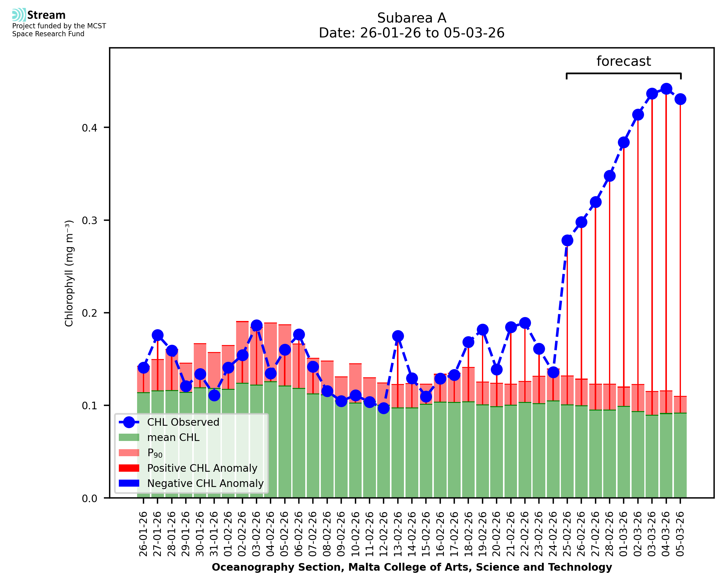 This STREAM service provides daily analysis of mass concentration of chlorophyll-a (CHL) anomalies, including spatial index maps for high chlorophyll occurrence and intensity in the sea around the Maltese Islands. User specific requests for data access and visualisation are planned for delivery on the STREAM mobile app. CHL is a core parameter in the Marine Strategy Framework Directive which provides the common framework for the assessment of the state of health of coastal seas to ensure coherence with the set goals of productive, healthy and clean European seas. CHL is considered to be a proxy of phythoplankton biomass and hence for eutrophication. Measuring chlorophyll is an indication of how much primary production is occurring in the sea.