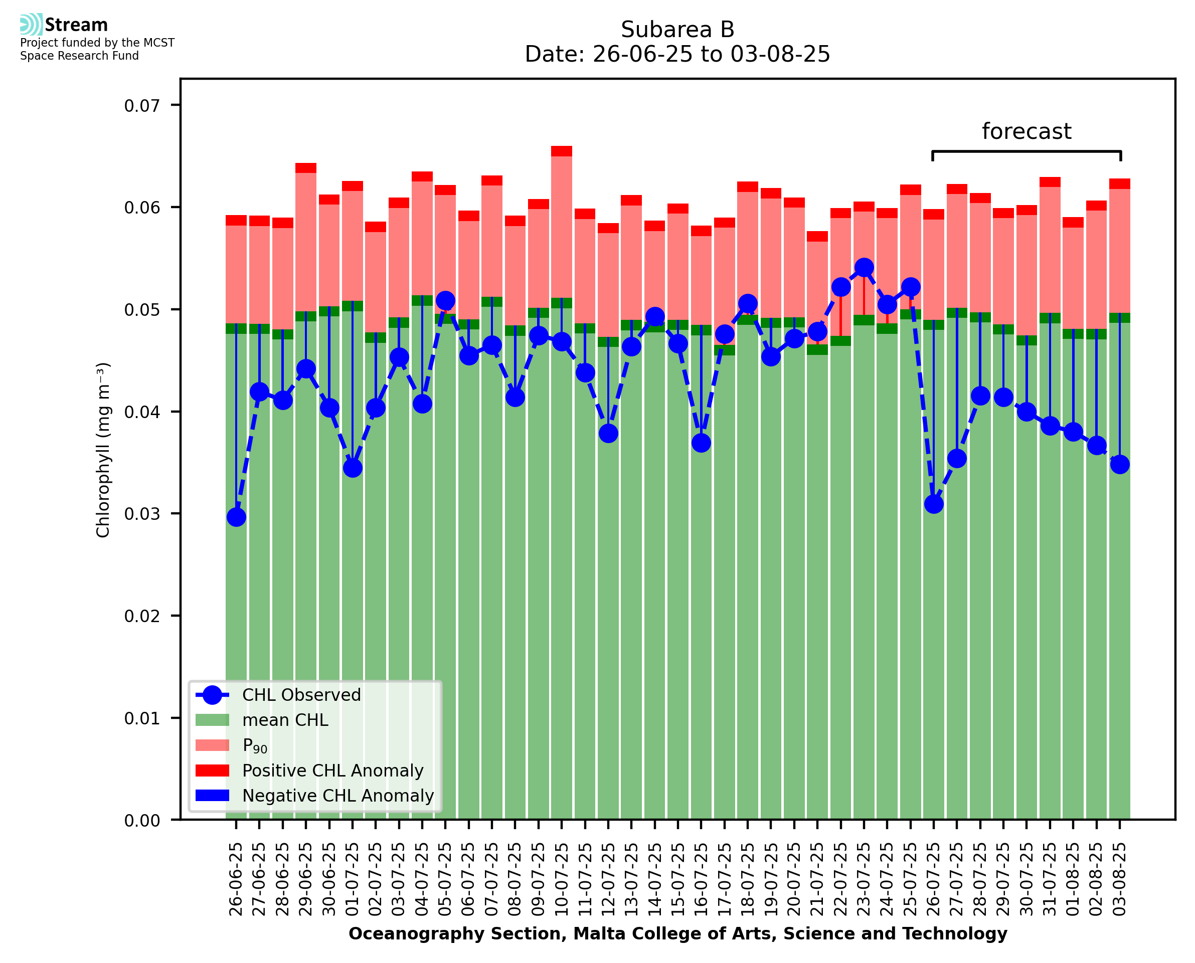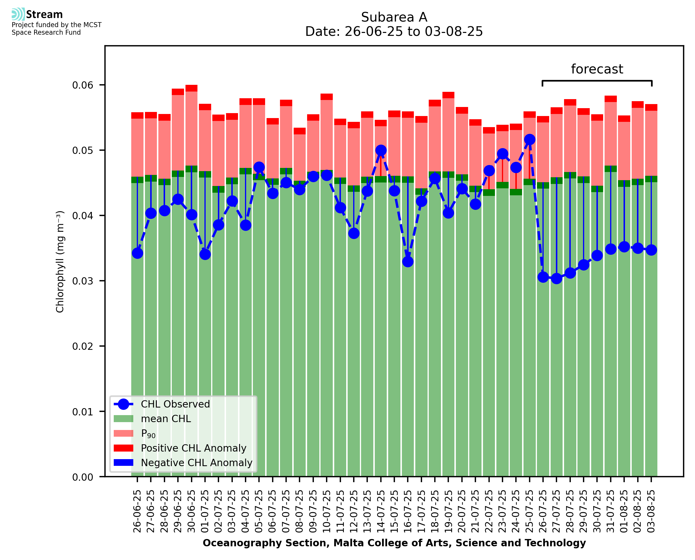 This STREAM service provides daily analysis of mass concentration of chlorophyll-a (CHL) anomalies, including spatial index maps for high chlorophyll occurrence and intensity in the sea around the Maltese Islands. User specific requests for data access and visualisation are planned for delivery on the STREAM mobile app. CHL is a core parameter in the Marine Strategy Framework Directive which provides the common framework for the assessment of the state of health of coastal seas to ensure coherence with the set goals of productive, healthy and clean European seas. CHL is considered to be a proxy of phythoplankton biomass and hence for eutrophication. Measuring chlorophyll is an indication of how much primary production is occurring in the sea.