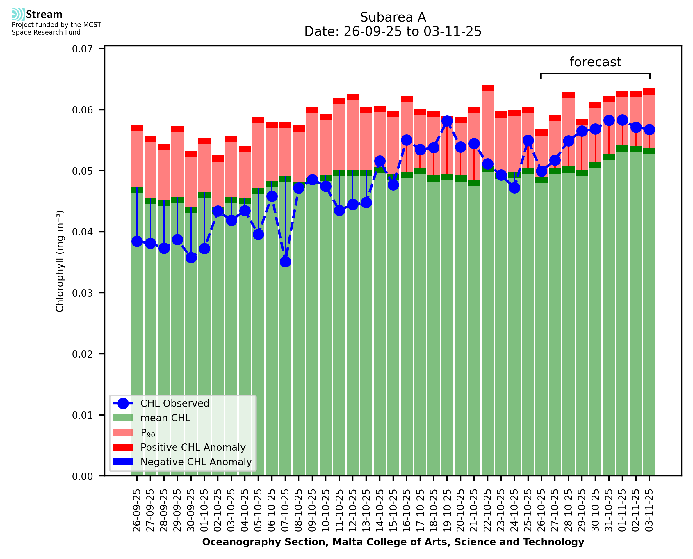 This STREAM service provides daily analysis of mass concentration of chlorophyll-a (CHL) anomalies, including spatial index maps for high chlorophyll occurrence and intensity in the sea around the Maltese Islands. User specific requests for data access and visualisation are planned for delivery on the STREAM mobile app. CHL is a core parameter in the Marine Strategy Framework Directive which provides the common framework for the assessment of the state of health of coastal seas to ensure coherence with the set goals of productive, healthy and clean European seas. CHL is considered to be a proxy of phythoplankton biomass and hence for eutrophication. Measuring chlorophyll is an indication of how much primary production is occurring in the sea.