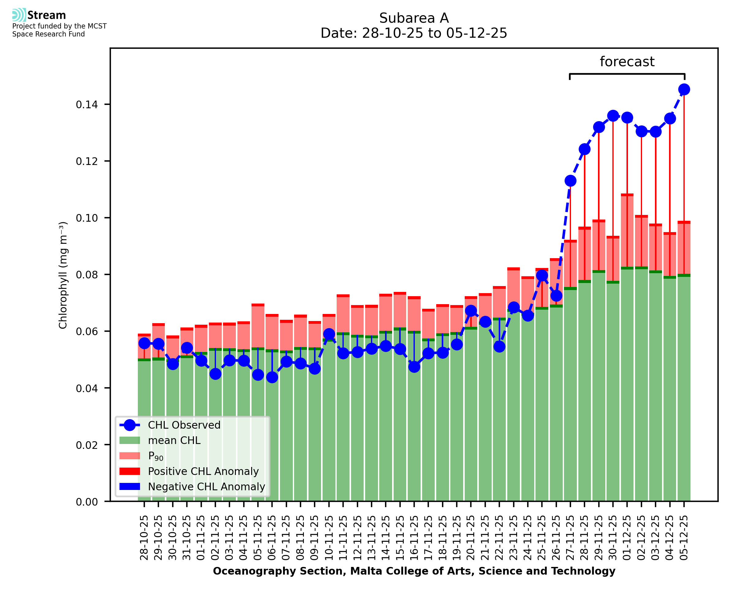 This STREAM service provides daily analysis of mass concentration of chlorophyll-a (CHL) anomalies, including spatial index maps for high chlorophyll occurrence and intensity in the sea around the Maltese Islands. User specific requests for data access and visualisation are planned for delivery on the STREAM mobile app. CHL is a core parameter in the Marine Strategy Framework Directive which provides the common framework for the assessment of the state of health of coastal seas to ensure coherence with the set goals of productive, healthy and clean European seas. CHL is considered to be a proxy of phythoplankton biomass and hence for eutrophication. Measuring chlorophyll is an indication of how much primary production is occurring in the sea.