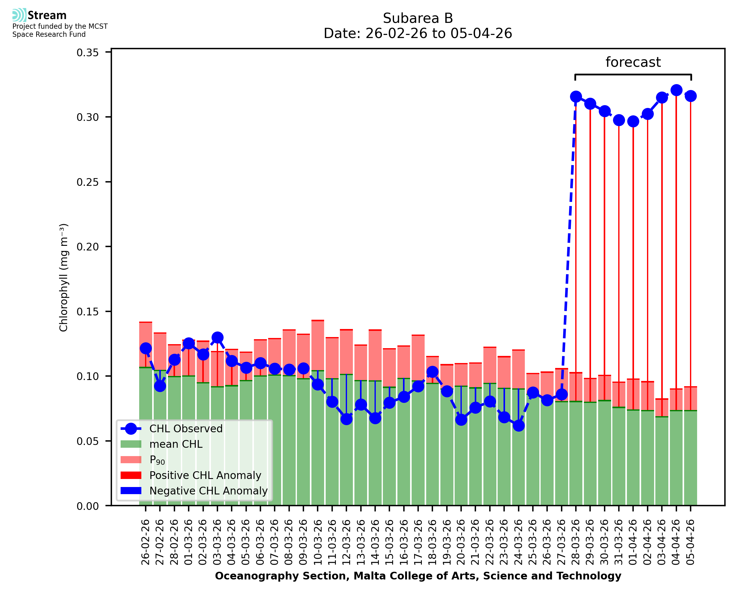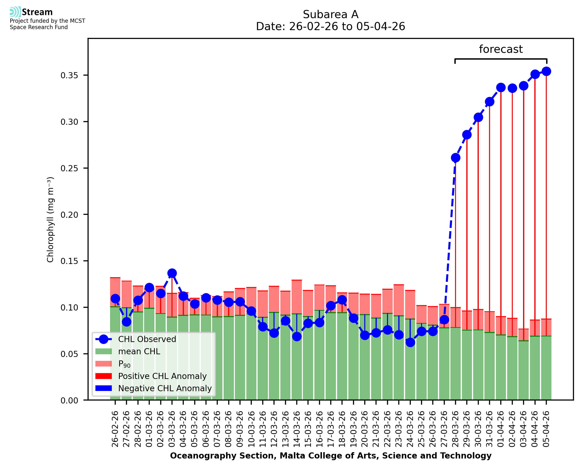 This STREAM service provides daily analysis of mass concentration of chlorophyll-a (CHL) anomalies, including spatial index maps for high chlorophyll occurrence and intensity in the sea around the Maltese Islands. User specific requests for data access and visualisation are planned for delivery on the STREAM mobile app. CHL is a core parameter in the Marine Strategy Framework Directive which provides the common framework for the assessment of the state of health of coastal seas to ensure coherence with the set goals of productive, healthy and clean European seas. CHL is considered to be a proxy of phythoplankton biomass and hence for eutrophication. Measuring chlorophyll is an indication of how much primary production is occurring in the sea.
