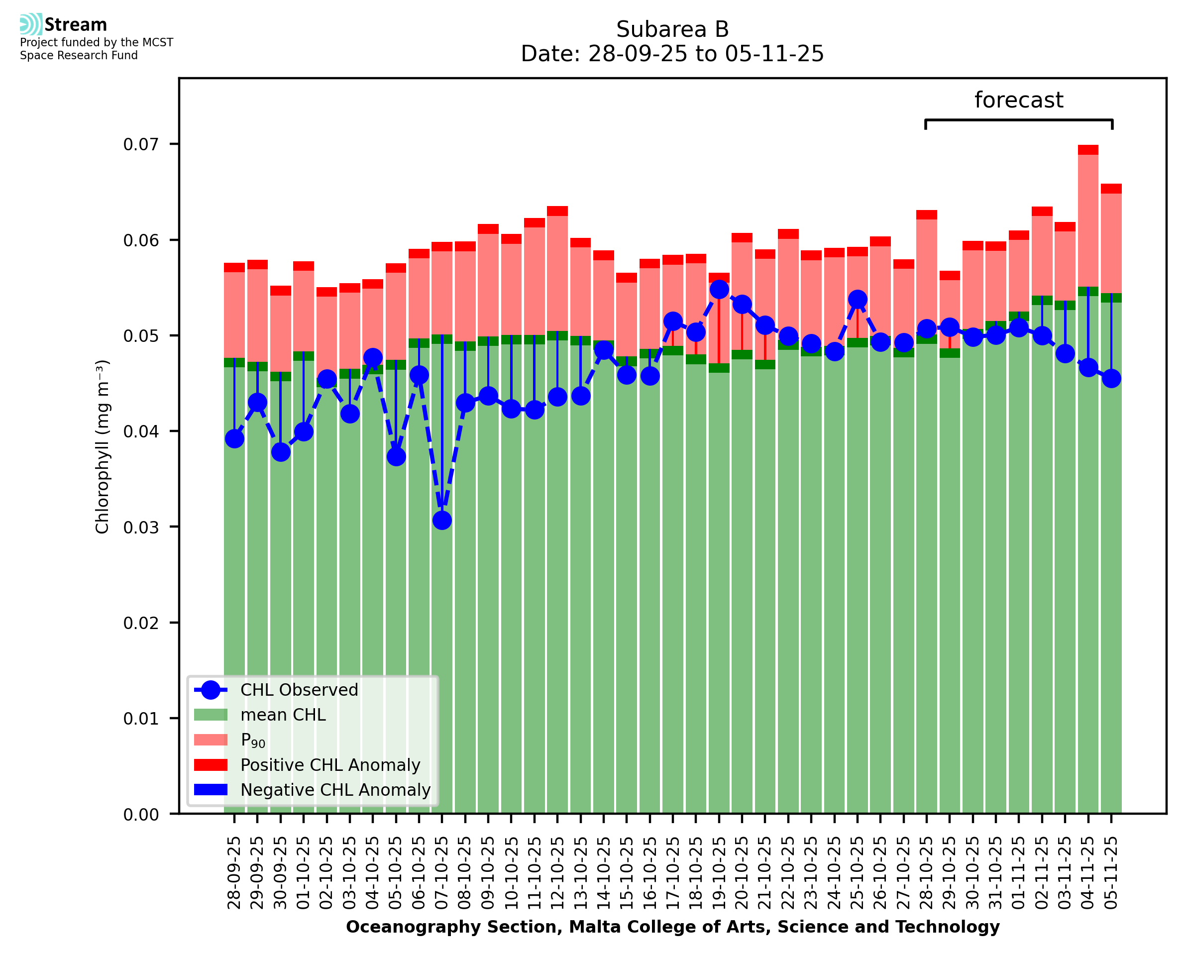 This STREAM service provides daily analysis of mass concentration of chlorophyll-a (CHL) anomalies, including spatial index maps for high chlorophyll occurrence and intensity in the sea around the Maltese Islands. User specific requests for data access and visualisation are planned for delivery on the STREAM mobile app. CHL is a core parameter in the Marine Strategy Framework Directive which provides the common framework for the assessment of the state of health of coastal seas to ensure coherence with the set goals of productive, healthy and clean European seas. CHL is considered to be a proxy of phythoplankton biomass and hence for eutrophication. Measuring chlorophyll is an indication of how much primary production is occurring in the sea.