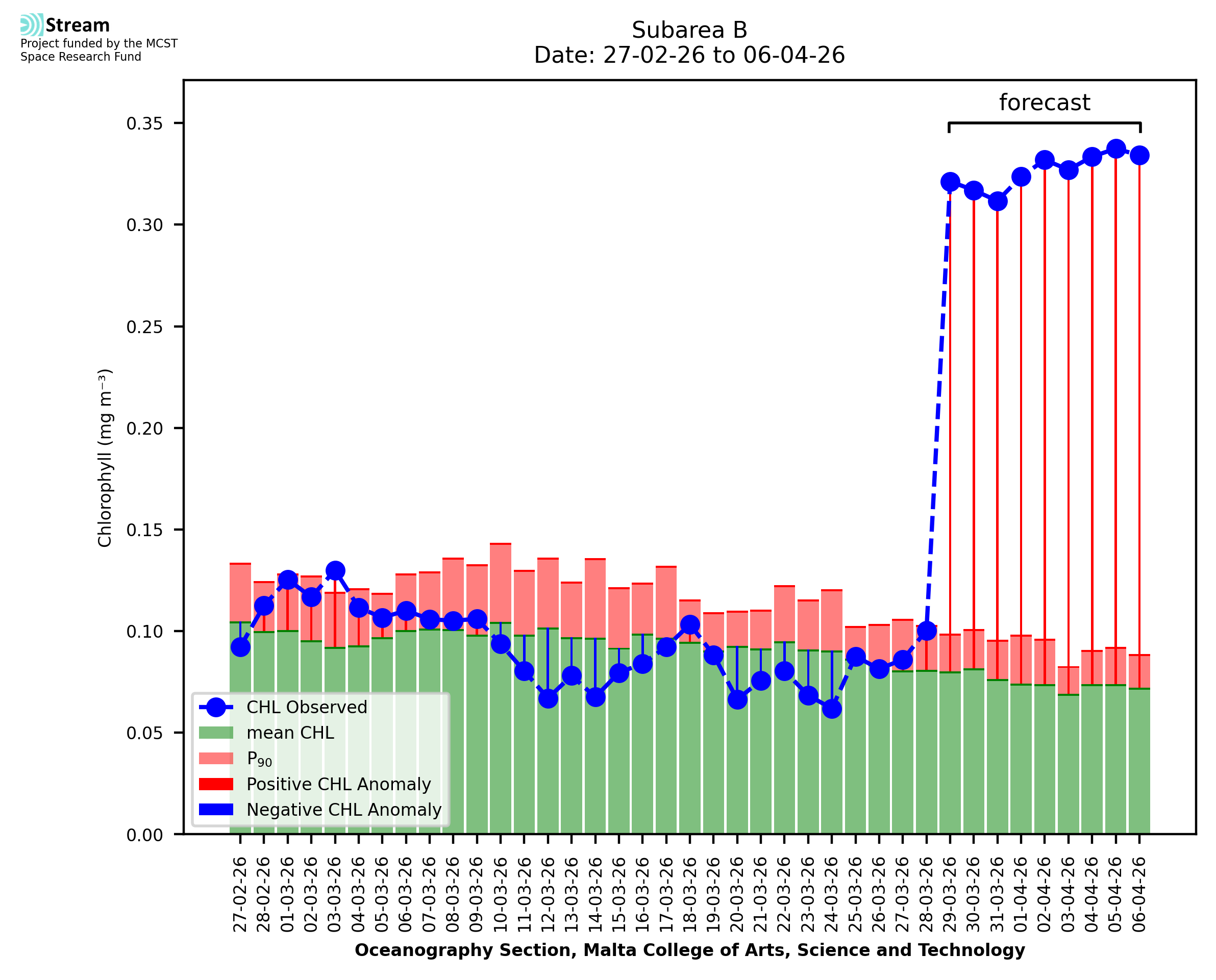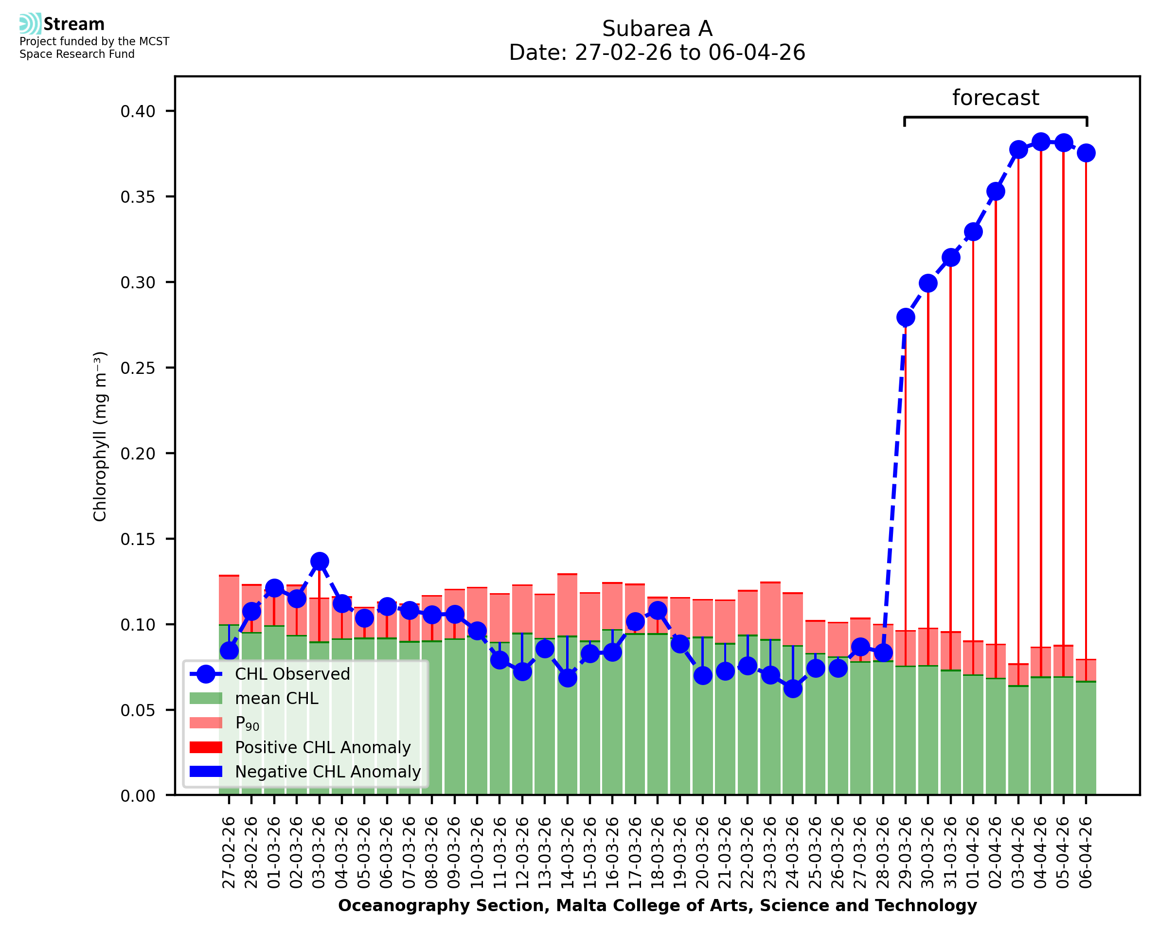 This STREAM service provides daily analysis of mass concentration of chlorophyll-a (CHL) anomalies, including spatial index maps for high chlorophyll occurrence and intensity in the sea around the Maltese Islands. User specific requests for data access and visualisation are planned for delivery on the STREAM mobile app. CHL is a core parameter in the Marine Strategy Framework Directive which provides the common framework for the assessment of the state of health of coastal seas to ensure coherence with the set goals of productive, healthy and clean European seas. CHL is considered to be a proxy of phythoplankton biomass and hence for eutrophication. Measuring chlorophyll is an indication of how much primary production is occurring in the sea.
