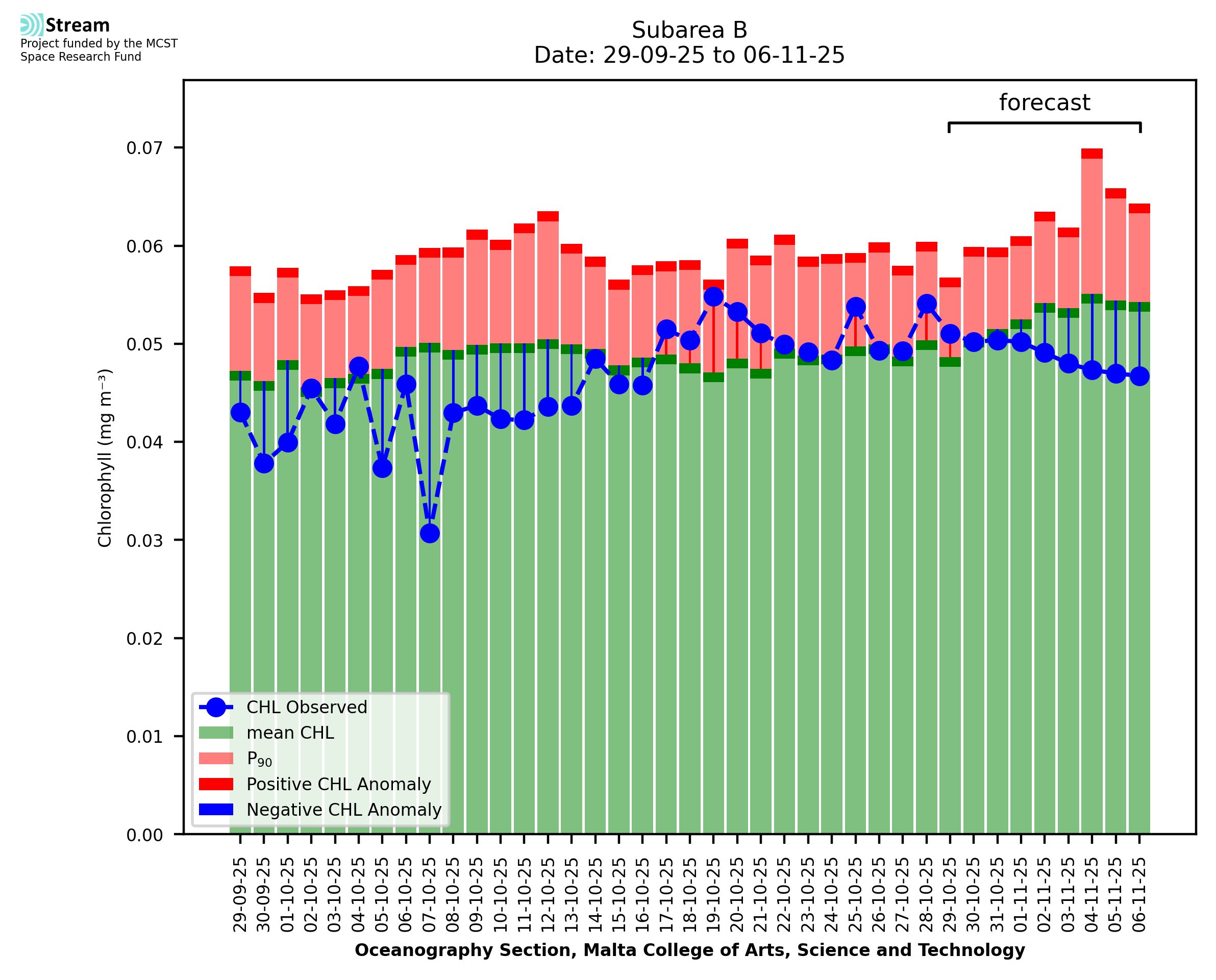 This STREAM service provides daily analysis of mass concentration of chlorophyll-a (CHL) anomalies, including spatial index maps for high chlorophyll occurrence and intensity in the sea around the Maltese Islands. User specific requests for data access and visualisation are planned for delivery on the STREAM mobile app. CHL is a core parameter in the Marine Strategy Framework Directive which provides the common framework for the assessment of the state of health of coastal seas to ensure coherence with the set goals of productive, healthy and clean European seas. CHL is considered to be a proxy of phythoplankton biomass and hence for eutrophication. Measuring chlorophyll is an indication of how much primary production is occurring in the sea.