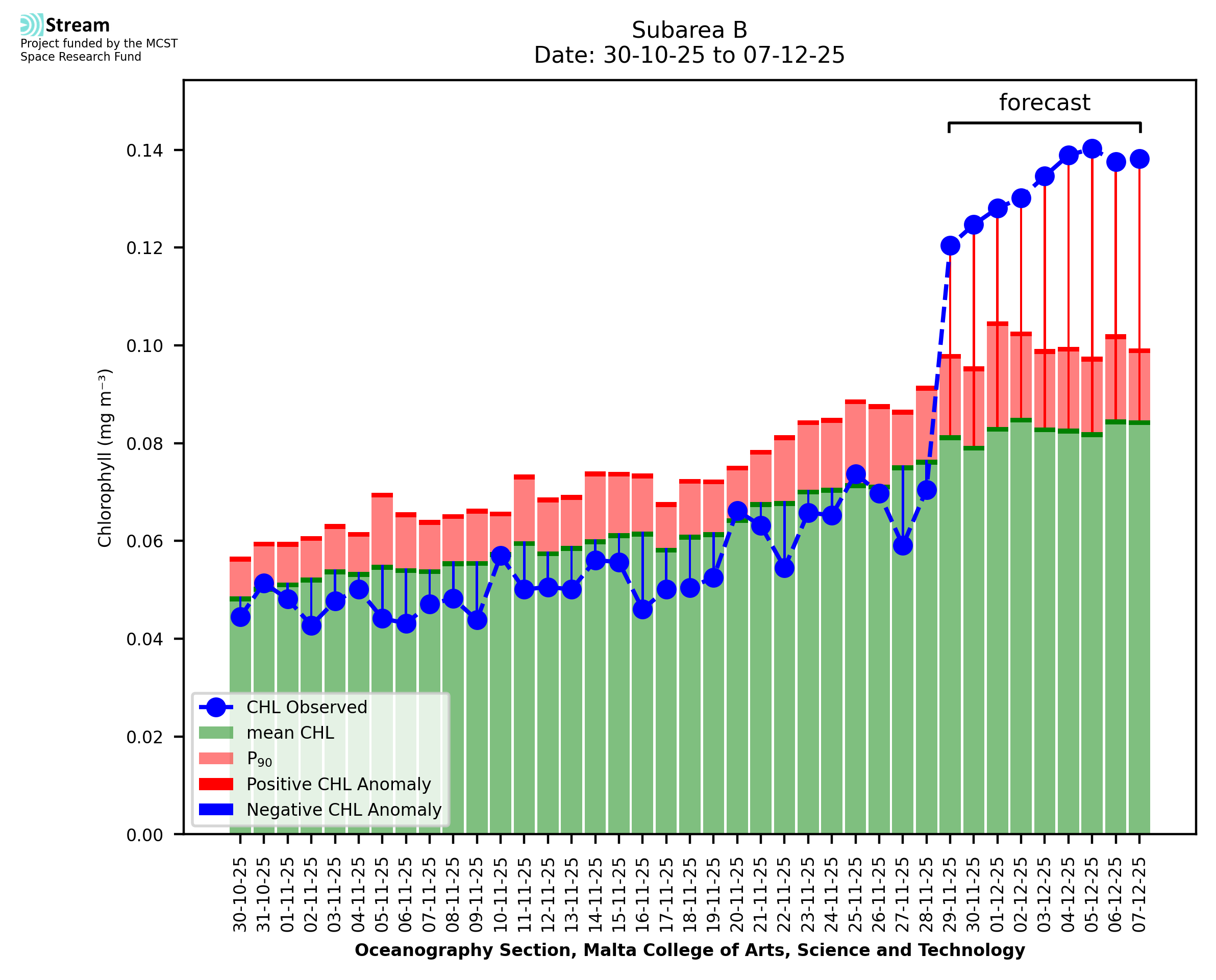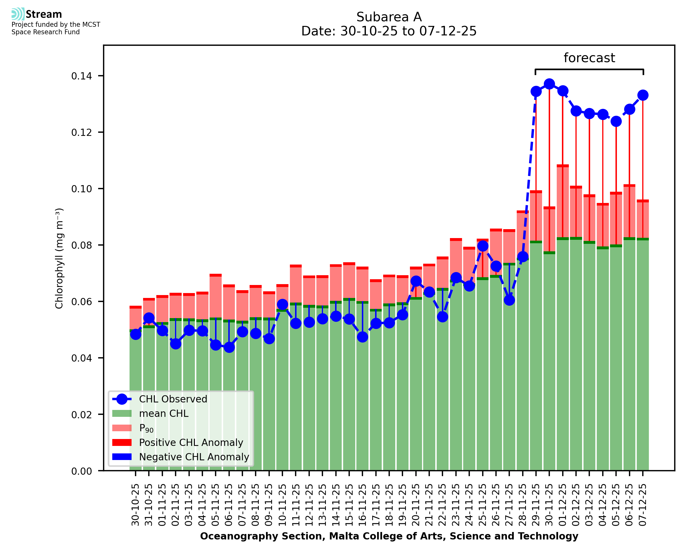 This STREAM service provides daily analysis of mass concentration of chlorophyll-a (CHL) anomalies, including spatial index maps for high chlorophyll occurrence and intensity in the sea around the Maltese Islands. User specific requests for data access and visualisation are planned for delivery on the STREAM mobile app. CHL is a core parameter in the Marine Strategy Framework Directive which provides the common framework for the assessment of the state of health of coastal seas to ensure coherence with the set goals of productive, healthy and clean European seas. CHL is considered to be a proxy of phythoplankton biomass and hence for eutrophication. Measuring chlorophyll is an indication of how much primary production is occurring in the sea.