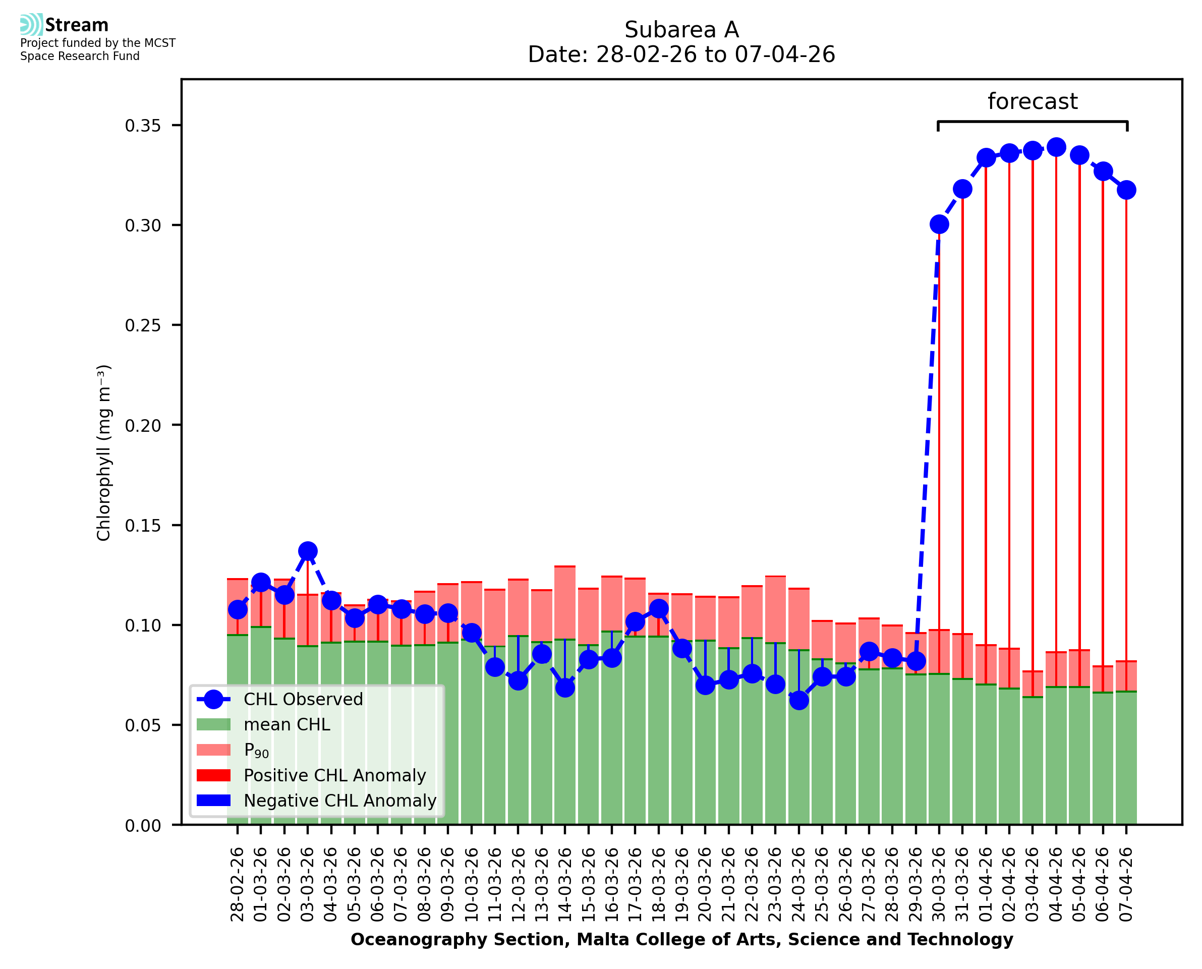 This STREAM service provides daily analysis of mass concentration of chlorophyll-a (CHL) anomalies, including spatial index maps for high chlorophyll occurrence and intensity in the sea around the Maltese Islands. User specific requests for data access and visualisation are planned for delivery on the STREAM mobile app. CHL is a core parameter in the Marine Strategy Framework Directive which provides the common framework for the assessment of the state of health of coastal seas to ensure coherence with the set goals of productive, healthy and clean European seas. CHL is considered to be a proxy of phythoplankton biomass and hence for eutrophication. Measuring chlorophyll is an indication of how much primary production is occurring in the sea.