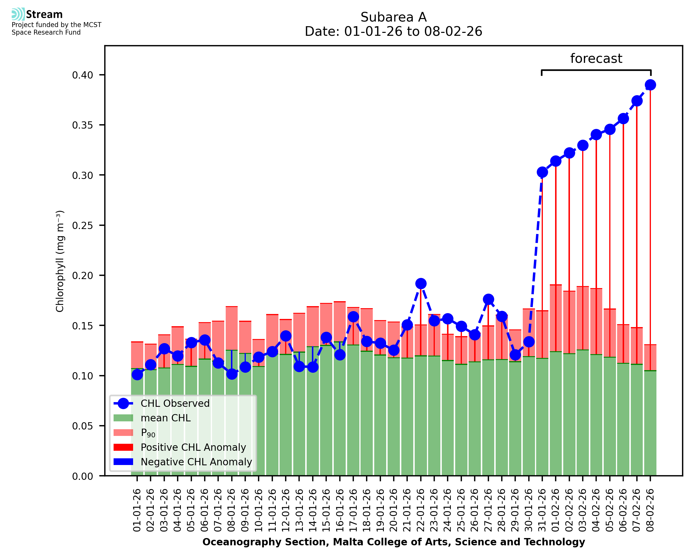 This STREAM service provides daily analysis of mass concentration of chlorophyll-a (CHL) anomalies, including spatial index maps for high chlorophyll occurrence and intensity in the sea around the Maltese Islands. User specific requests for data access and visualisation are planned for delivery on the STREAM mobile app. CHL is a core parameter in the Marine Strategy Framework Directive which provides the common framework for the assessment of the state of health of coastal seas to ensure coherence with the set goals of productive, healthy and clean European seas. CHL is considered to be a proxy of phythoplankton biomass and hence for eutrophication. Measuring chlorophyll is an indication of how much primary production is occurring in the sea.