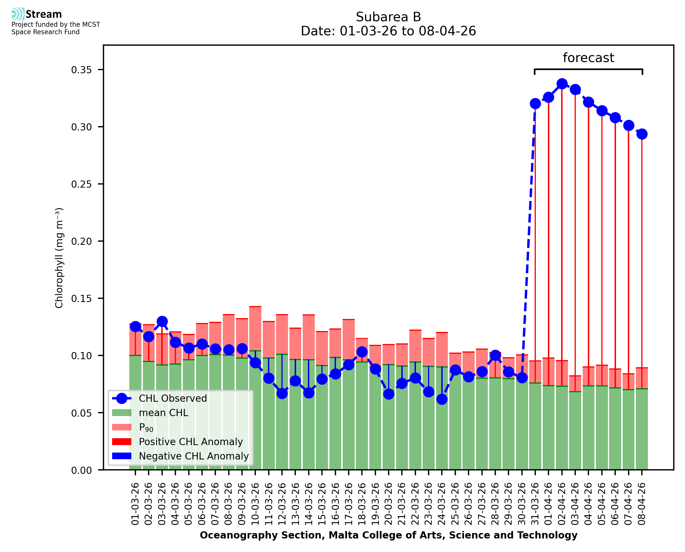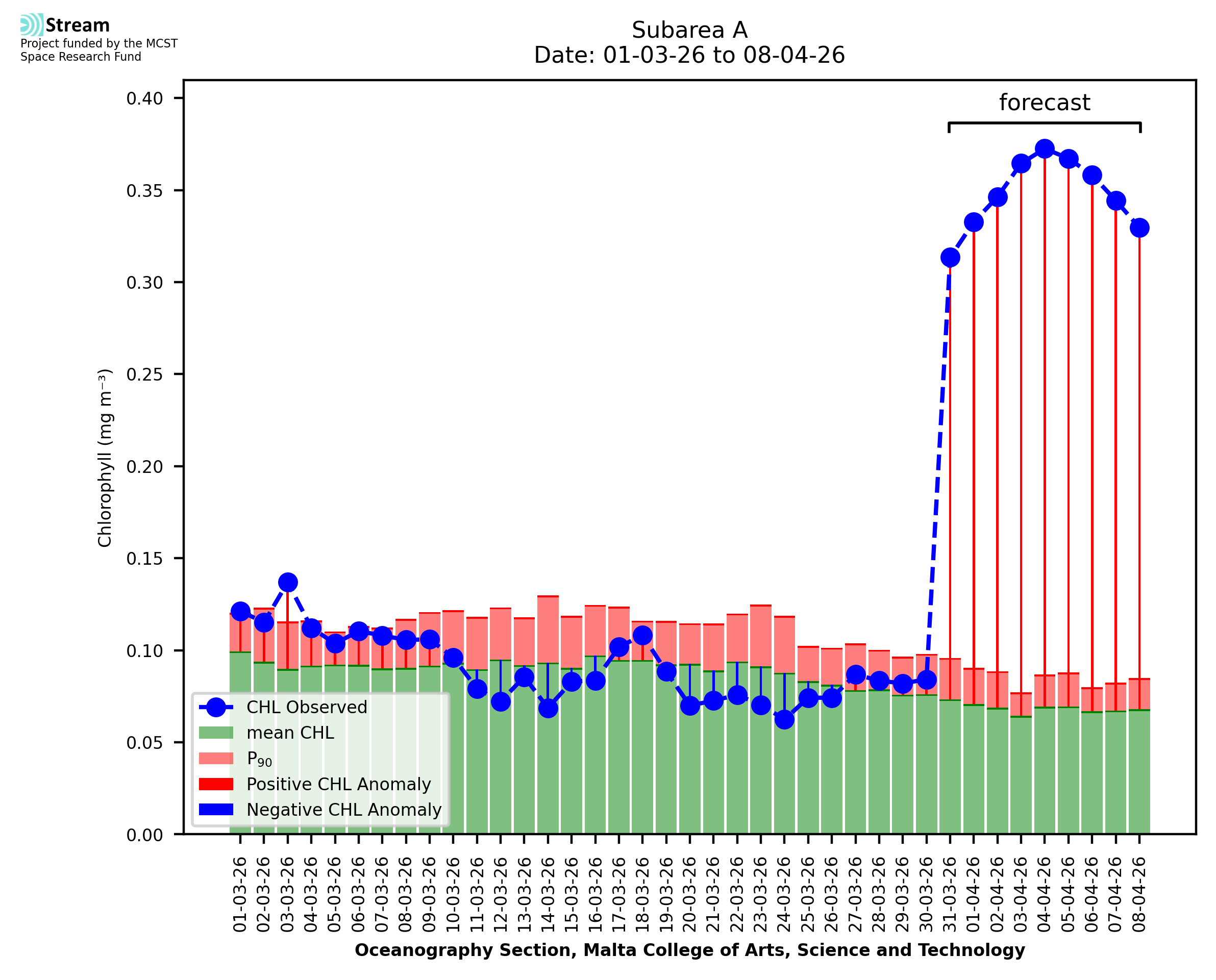 This STREAM service provides daily analysis of mass concentration of chlorophyll-a (CHL) anomalies, including spatial index maps for high chlorophyll occurrence and intensity in the sea around the Maltese Islands. User specific requests for data access and visualisation are planned for delivery on the STREAM mobile app. CHL is a core parameter in the Marine Strategy Framework Directive which provides the common framework for the assessment of the state of health of coastal seas to ensure coherence with the set goals of productive, healthy and clean European seas. CHL is considered to be a proxy of phythoplankton biomass and hence for eutrophication. Measuring chlorophyll is an indication of how much primary production is occurring in the sea.