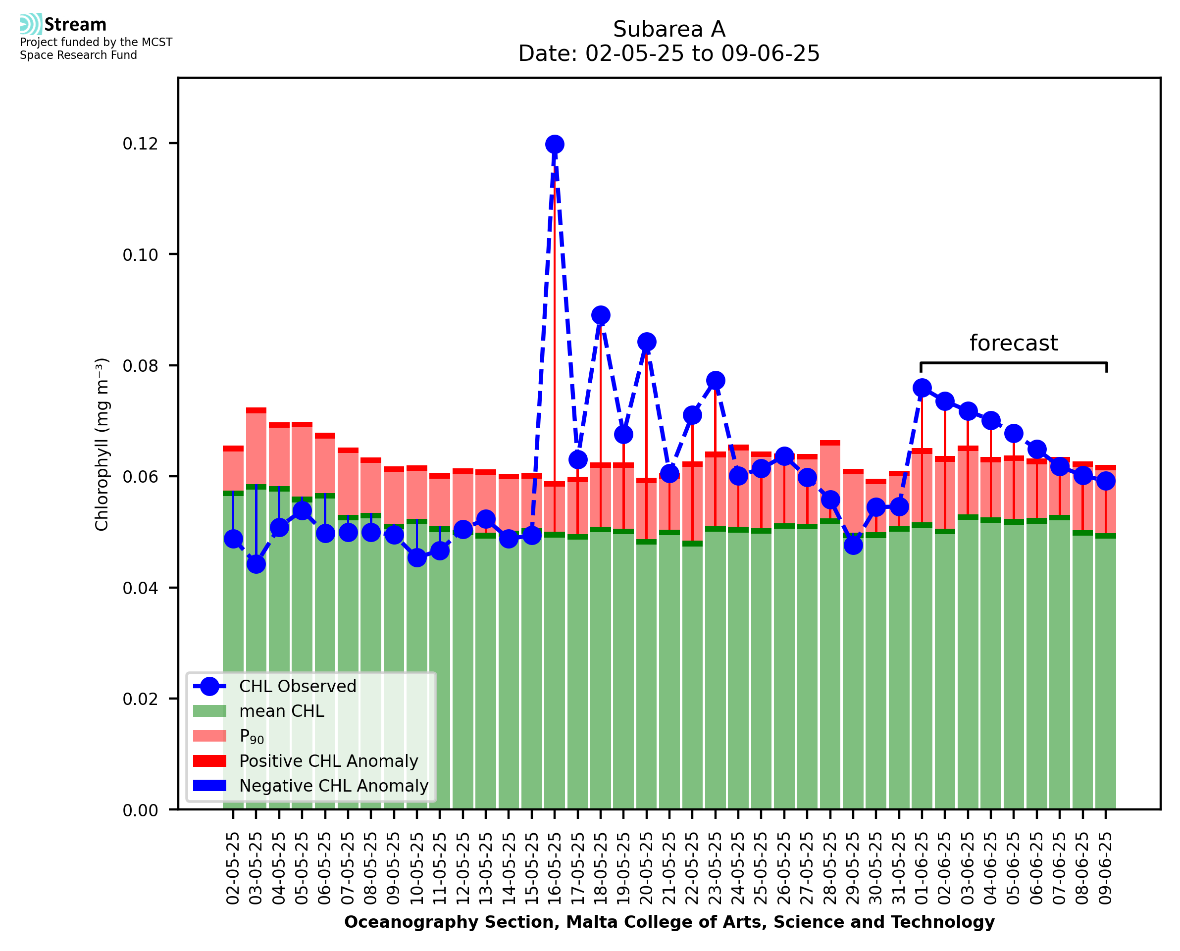 This STREAM service provides daily analysis of mass concentration of chlorophyll-a (CHL) anomalies, including spatial index maps for high chlorophyll occurrence and intensity in the sea around the Maltese Islands. User specific requests for data access and visualisation are planned for delivery on the STREAM mobile app. CHL is a core parameter in the Marine Strategy Framework Directive which provides the common framework for the assessment of the state of health of coastal seas to ensure coherence with the set goals of productive, healthy and clean European seas. CHL is considered to be a proxy of phythoplankton biomass and hence for eutrophication. Measuring chlorophyll is an indication of how much primary production is occurring in the sea.